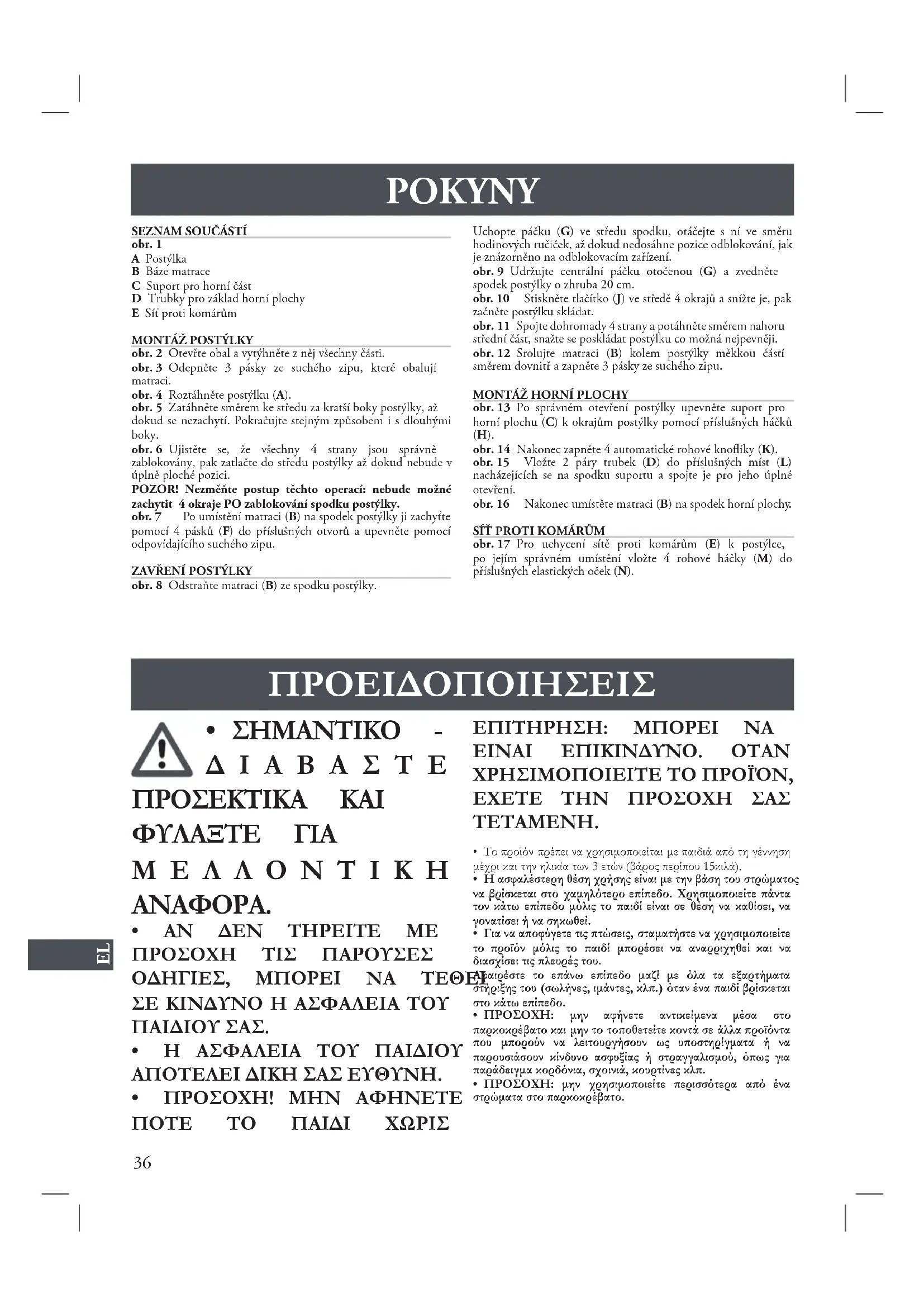 - 경고! 아이를 절대 혼자 두지 마십시오. 위험할 수 있습니다. 특히 제품을 사용 중일 때 더 많은 신경을 ΚΑΤΑΛΟΓΟΣΕΞΑΡΤΗΜΑΤΩΝΕικ.1A ΚρεβατάκιB Στρώμα βάσηςC Στήριγμα του ανώτερου ορόφουD Σωλήνες για το κάτω μέρος του ανώτερου ορόφουE ΚουνουπιέραΣΤΗΣΙΜΟΤΟΥΚΡΕΒΑΤΙΟΥΕικ.2 Ανοίξτε το σάκο και τραβήξτε όλα τα μέρη που υπάρχουν σε αυτό.Εικ.3 Απελευθερώστε τους 3 ιμάντες κλεισίματος που τυλίγουν το στρώμα.Εικ.4 Τεντώστε το κρεβατάκι (Α).Εικ.5 Τραβήξτε στο κέντρο τις πιο κοντές πλευρές του κρεβατιού μέχρι να συνδεθούν. Κάντε το ίδιο και για τις μεγαλύτερες πλευρές.Εικ.6 Βεβαιωθείτε πως και οι 4 πλευρές είναι σωστά μπλοκαρισμένες, κατά συνέπεια πατήστε στο κέντρο του κρεβατιού μέχρι τη σύνδεση σε θέση επίπεδη.ΠΡΟΣΟΧΗ! Μην αντιστρέψετε τις ακόλουθες ενέργειες:η σύνδεση των 4 κινητών πλευρών δεν είναι εφικτή ανπραγματοποιηθεί ΜΕΤΑ από το μπλοκάρισμα του κάτωμέρους. Εικ.7 Αφού τοποθετήσετε το στρώμα (Β) στο κάτω μέρος του κρεβατιού, στερεώστε το τοποθετώντας τους 4 ιμάντες (F) στις ειδικές τρύπες και συνδέστε τους στα αντίστοιχα κλεισίματα.ΚΛΕΙΣΙΜΟΤΟΥΚΡΕΒΑΤΙΟΥΕικ.8 Αφαιρέστε το στρωματάκι (Β) από το κρεβατάκι.Κρατώντας το μοχλό (G) στο κέντρο του κάτω μέρους, περιστρέψτε τον προς τα δεξιά έως ότου φτάσει τη θέση ξεμπλοκαρίσματος που αναφέρεται στη συσκευή απελευθέρωσης. Εικ.9 Κρατώντας γυρισμένο τον κεντρικό μοχλό (G), ανασηκώστε το κάτω μέρους του κρεβατιού 20 cm περίπου. Εικ.10 Πατήστε το κουμπί (J) στο κέντρο των 4 κινητών πλευρών και χαμηλώνοντάς τες αρχίστε να αναδιπλώνετε το κρεβατάκι όσο το δυνατόν περισσότερο. Εικ.11 Ενώστε τέλος τις 4 πλευρές και τραβήξτε προς τα πάνω το κεντρικό μέρος, προσπαθώντας να αναδιπλώσετε το κρεβατάκι όσο το δυνατόν περισσότερο. Εικ.12 Τυλίξτε το στρωματάκι (Β) γύρω από το κρεβατάκι με το μαλακό τμήμα στο εσωτερικό και ξανακλείστε τους 3 ιμάντες.ΣΥΝΑΡΜΟΛΟΓΗΣΗΤΟΥΑΝΩΤΕΡΟΥΟΡΟΦΟΥΕικ.13 Αφού ανοίξετε σωστά το κρεβατάκι, στερεώστε το στήριγμα του ανώτερου ορόφου (C) στις κινητές πλευρές του κρεβατιού μέσω των ειδικών γάντζων (Η).Εικ.14 Κουμπώστε κατά συνέπεια τους 4 αυτόματους γωνιακούς (K). Εικ.15 Τοποθετείστε τα 2 ζευγάρια των σωλήνων (D) στις ειδικές θέσεις (L) τοποθετημένες στο κάτω μέρος του στηρίγματος και συνδέστε τες έτσι ώστε να ανοίξει πλήρως. Εικ.16 Τοποθετείστε τέλος το στρωματάκι (Β) στο κάτω μέρος του ανώτερου ορόφου.ΚΟΥΝΟΥΠΙΕΡΑ Εικ.17 Για να στερεώσετε την κουνουπιέρα (Ε) στο κρεβατάκι, αφού την έχετε τοποθετήσει σωστά, καταχωρείστε τους 4 γωνιακούς γάντζους (Μ) στις ειδικές ελαστικές εσοχές (Ν). Μη σιδερώνετεΑποφύγετε το στεγνό καθάρισμαπροθεσμίας τεσσάρων (4) ετών από την ημερομηνία της εισαγωγής στην αγορά των ιδίων, μετά την οποία θα αξιολογείται κατά περίπτωση η δυνατότητα παρέμβασης.ΑΝΤΑΛΛΑΚΤΙΚΑ/ΣΕΡΒΙΣΜΕΤΑΤΗΝΠΩΛΗΣΗ