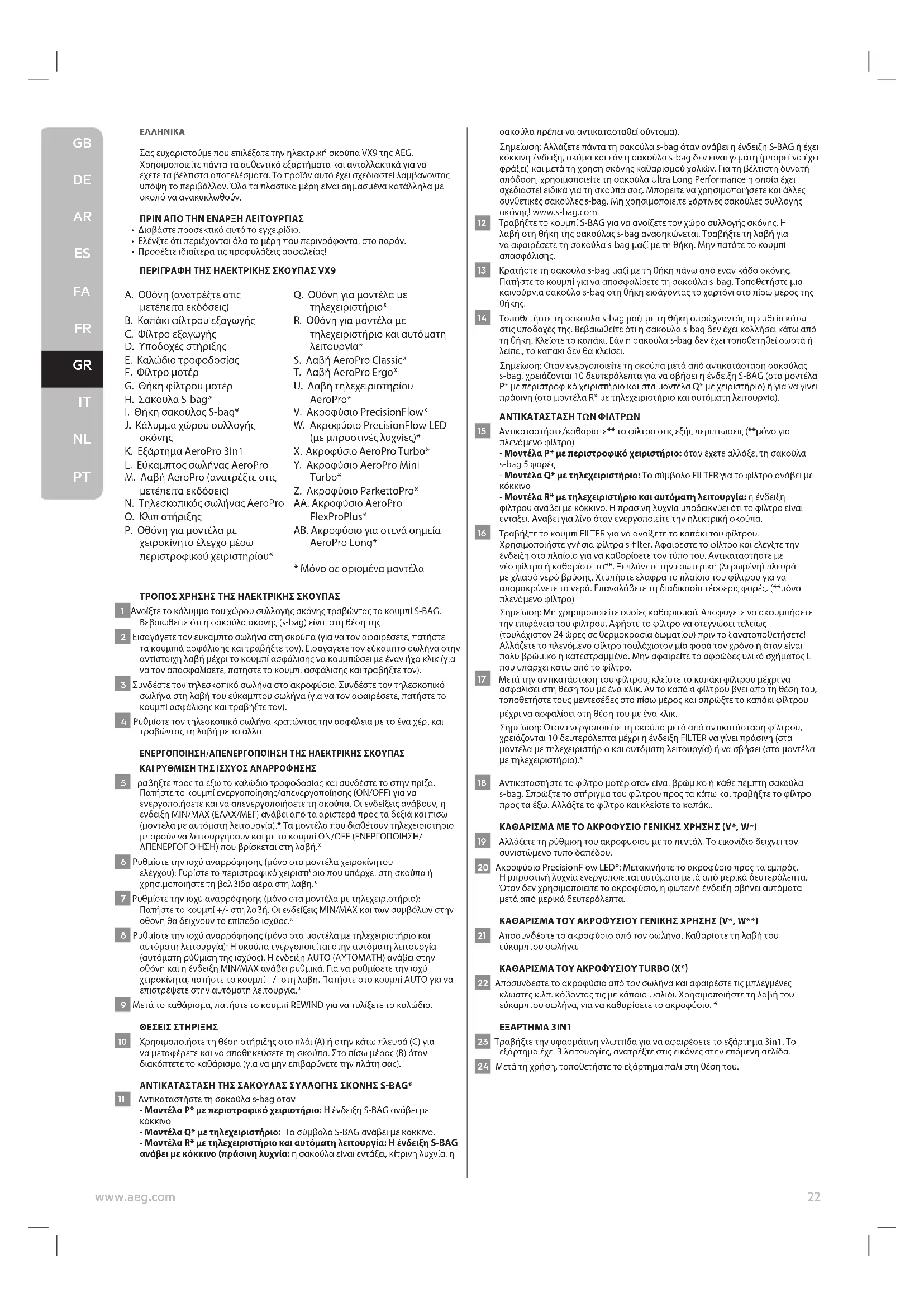 Σας ευχαριστούμε που επιλέξατε την ηλεκτρική σκούπα VX9 της AEG. Χρησιμοποιείτε πάντα τα αυθεντικά εξαρτήματα και ανταλλακτικά για να έχετε τα βέλτιστα αποτελέσματα. Το προϊόν αυτό έχει σχεδιαστεί λαμβάνοντας υπόψη το περιβάλλον. Όλα τα πλαστικά μέρη είναι σημασμένα κατάλληλα με σκοπό να ανακυκλωθούν. ΠΡΙΝ ΑΠΟ ΤΗΝ ΕΝΑΡΞΗ ΛΕΙΤΟΥΡΓΙΑΣ