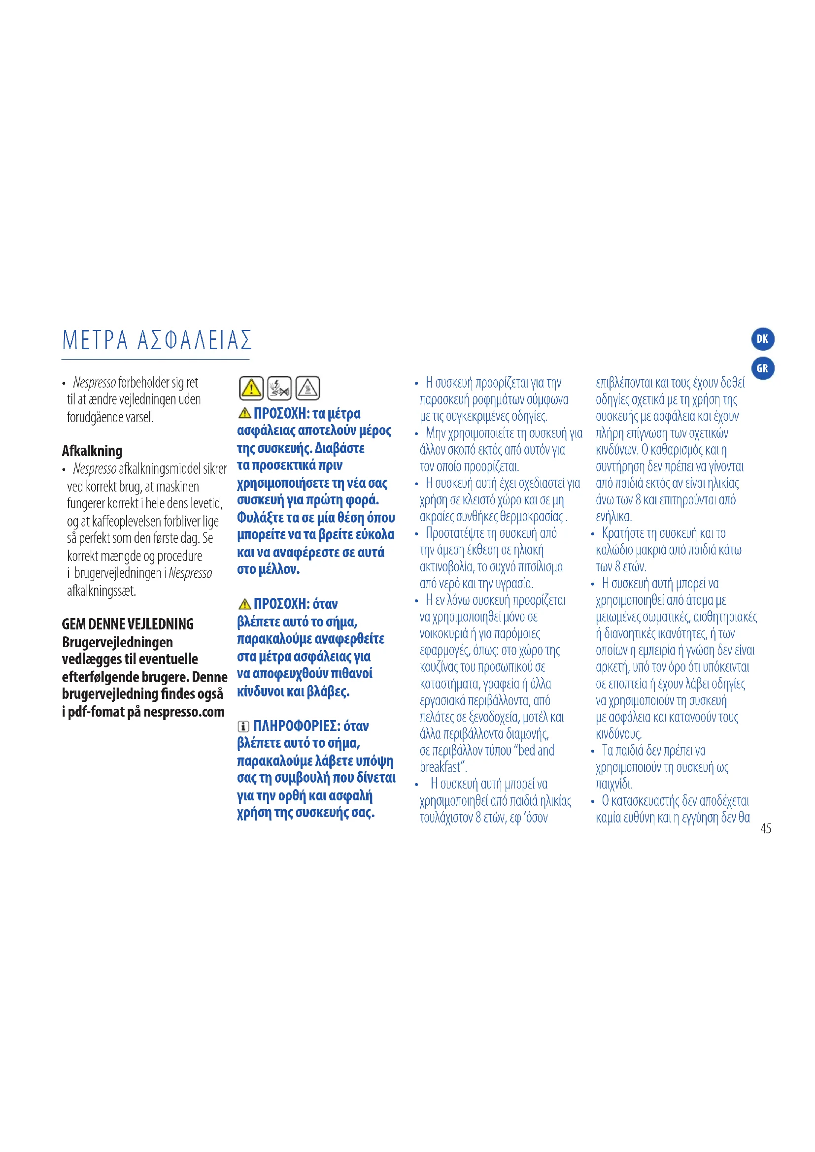 Brugervejledningen vedlægges til eventuelle efterfølgende brugere. Denne brugervejledning ndes også i pdf-fomat på nespresso.com ΠΡΟΣΟΧΗ: τα έτρα ασφάλεια αποτελούν έρο τη συσκευή. ιαβάστε τα προσεκτικά πριν χρησιοποιήσετε τη νέα σα συσκευή για πρώτη φορά. Φυλάξτε τα σε ία θέση όπου πορείτε να τα βρείτε εύκολα και να αναφέρεστε σε αυτά