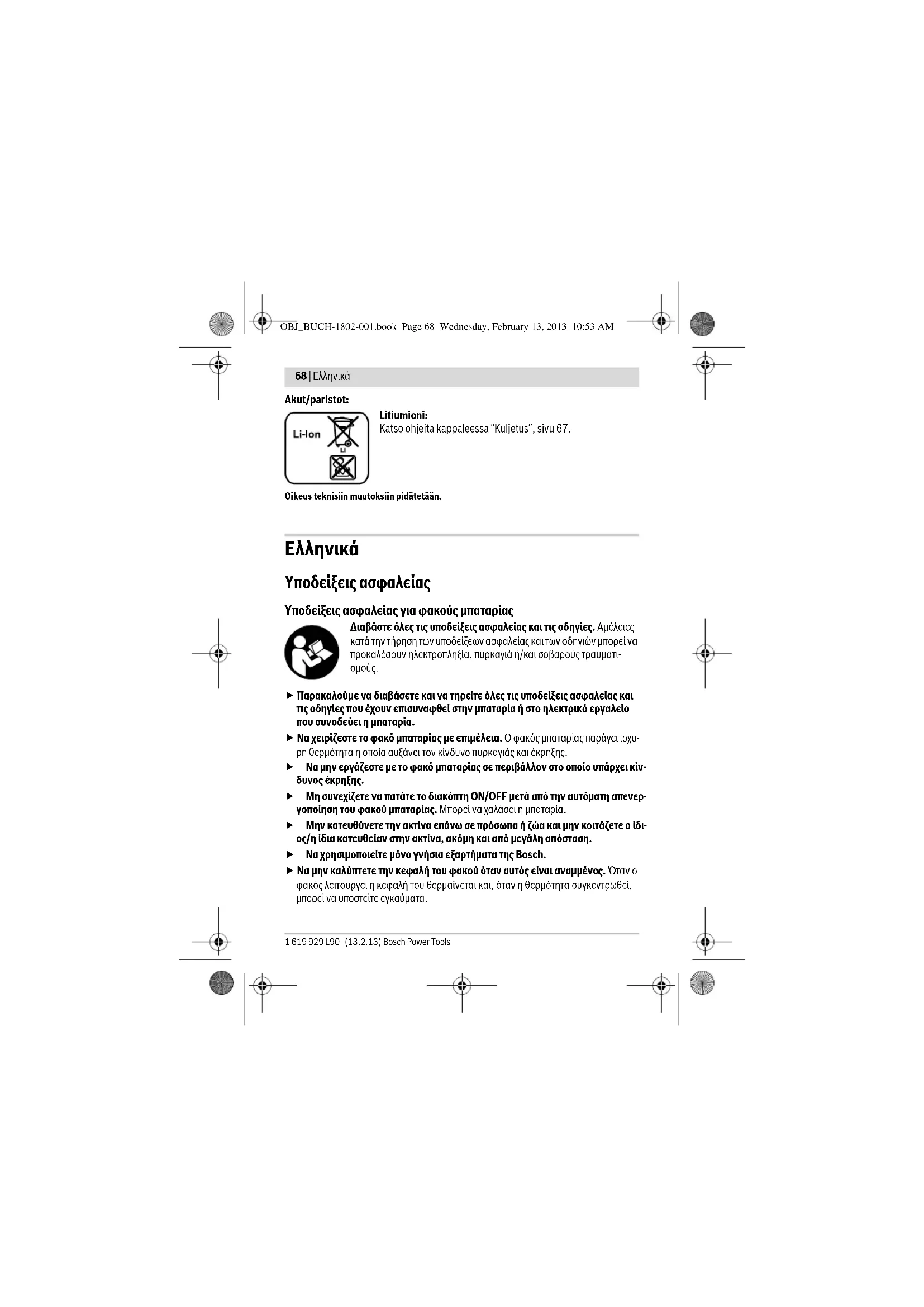Παρακαλούμε να διαβάσετε και να τηρείτε όλες τις υποδείξεις ασφαλείας και τις οδηγίες που έχουν επισυναφθεί στην μπαταρία ή στο ηλεκτρικό εργαλείο που συνοδεύει η μπαταρία. Να χειρίζεστε το φακό μπαταρίας με επιμέλεια. Ο φακός μπαταρίας παράγει ισχυ- ρή θερμότητα η οποία αυξάνει τον κίνδυνο πυρκαγιάς και έκρηξης. Να μην εργάζεστε με το φακό μπαταρίας σε περιβάλλον στο οποίο υπάρχει κίν- δυνος έκρηξης. Μη συνεχίζετε να πατάτε το διακόπτη ON/OFF μετά από την αυτόματη απενερ- γοποίηση του φακού μπαταρίας. Μπορεί να χαλάσει η μπαταρία. Μην κατευθύνετε την ακτίνα επάνω σε πρόσωπα ή ζώα και μην κοιτάζετε ο ίδι- ος/η ίδια κατευθείαν στην ακτίνα, ακόμη και από μεγάλη απόσταση. Να χρησιμοποιείτε μόνο γνήσια εξαρτήματα της Bosch. Να μην καλύπτετε την κεφαλή του φακού όταν αυτός είναι αναμμένος. Όταν ο φακός λειτουργεί η κεφαλή του θερμαίνεται και, όταν η θερμότητα συγκεντρωθεί, μπορεί να υποστείτε εγκαύματα. OBJ_BUCH-1802-001.book Page 68 Wednesday, February 13, 2013 10:53 AMΕλληνικά | 69 Bosch Power Tools 1 619 929 L90 | (13.2.13) Μην χρησιμοποιήσετε το φακό μπαταρίας στην οδική κυκλοφορία. Ο φακός μπαταρίας δεν έχει εγκριθεί για φώτισμα στην οδική κυκλοφορία. Να αφαιρείτε την μπαταρία από το φακό μπαταρίας πριν διεξάγετε κάποια ερ- γασία σ’ αυτόν καθώς και πριν τον μεταφέρετε ή τον αποθηκεύσετε. Μην αφήσετε παιδιά να χρησιμοποιήσουν το φακό μπαταρίας. Ο φακός μπαταρί- ας προορίζεται για επαγγελματική χρήση. Τα παιδιά μπορεί να τυφλώσουν άθελα τον ίδιο τον εαυτό τους ή άλλα πρόσωπα. ΠΡΟΣΟΧΗ! Μην κοιτάξετε για πολλή ώρα την ακτίνα φωτός. Η οπτική ακτινοβολία μπορεί να βλάψει τα μάτια σας. Μην ανοίγετε την μπαταρία. Υπάρχει κίνδυνος βραχυκυκλώματος. Να προστατεύετε την μπαταρία από υπερβολικές θερμοκρασίες, π. χ. ακόμη και από συνεχή ηλιακή ακτινοβολία, φωτιά, νερό και υγρασία. Υπάρχει κίνδυνος έκρηξης. Κρατάτε τις μπαταρίες που δε χρησιμοποιείτε μακριά από συνδετήρες χαρτιών, νομίσματα, κλειδιά, καρφιά, βίδες κι άλλα μικρά μεταλλικά αντικείμενα που μπορούν να βραχυκυκλώσουν τις επαφές της μπαταρίας. Ένα βραχυκύκλωμα των επαφών της μπαταρίας μπορεί να προκαλέσει τραυματισμούς ή φωτιά. Μια τυχόν εσφαλμένη χρησιμοποίηση μπορεί να οδηγήσει σε διαρροή υγρών από την μπαταρία. Αποφεύγετε κάθε επαφή μ’ αυτά. Σε περίπτωση τυχαίας επαφής ξεπλύνετε καλά με νερό. Σε περίπτωση που τα υγρά θα έρθουν σε επα- φή με τα μάτια, πρέπει να ζητήσετε επίσης και ιατρική βοήθεια. Διαρρέοντα υγρά μπαταρίας μπορεί να οδηγήσουν σε ερεθισμούς του δέρματος ή σε εγκαύματα. Σε περίπτωση βλάβης ή/και αντικανονικής χρήσης της μπαταρίας μπορεί να εξέλθουν αναθυμιάσεις από την μπαταρία. Αφήστε να μπει φρέσκος αέρας και επισκεφτείτε ένα γιατρό αν αισθανθείτε ενοχλήσεις. Οι αναθυμιάσεις μπορεί να ερεθίσουν τις αναπνευστικές οδούς. Φορτίζετε τις μπαταρίες μόνο με φορτιστές που προτείνονται από τον κατα- σκευαστή. Ένας φορτιστής που είναι κατάλληλος μόνο για ένα συγκεκριμένο τύπο μπαταριών δημιουργεί κίνδυνο πυρκαγιάς όταν χρησιμοποιηθεί για άλλες μπαταρίες. Να χρησιμοποιείτε την μπαταρία μόνο σε συνδυασμό με το προϊόν της Bosch που αποκτήσατε. Μόνο έτσι προστατεύεται η μπαταρία από μια ενδεχόμενη επικίν- δυνη υπερφόρτωση. Να χρησιμοποιείτε μόνο γνήσιες μπαταρίες από την Bosch με τάση αυτή που αναγράφεται στην πινακίδα κατασκευαστή του φακού μπαταρίας της Bosch. Η χρήση άλλων μπαταριών, π. χ. απομιμήσεων, μεταποιημένων μπαταριών ή μπ