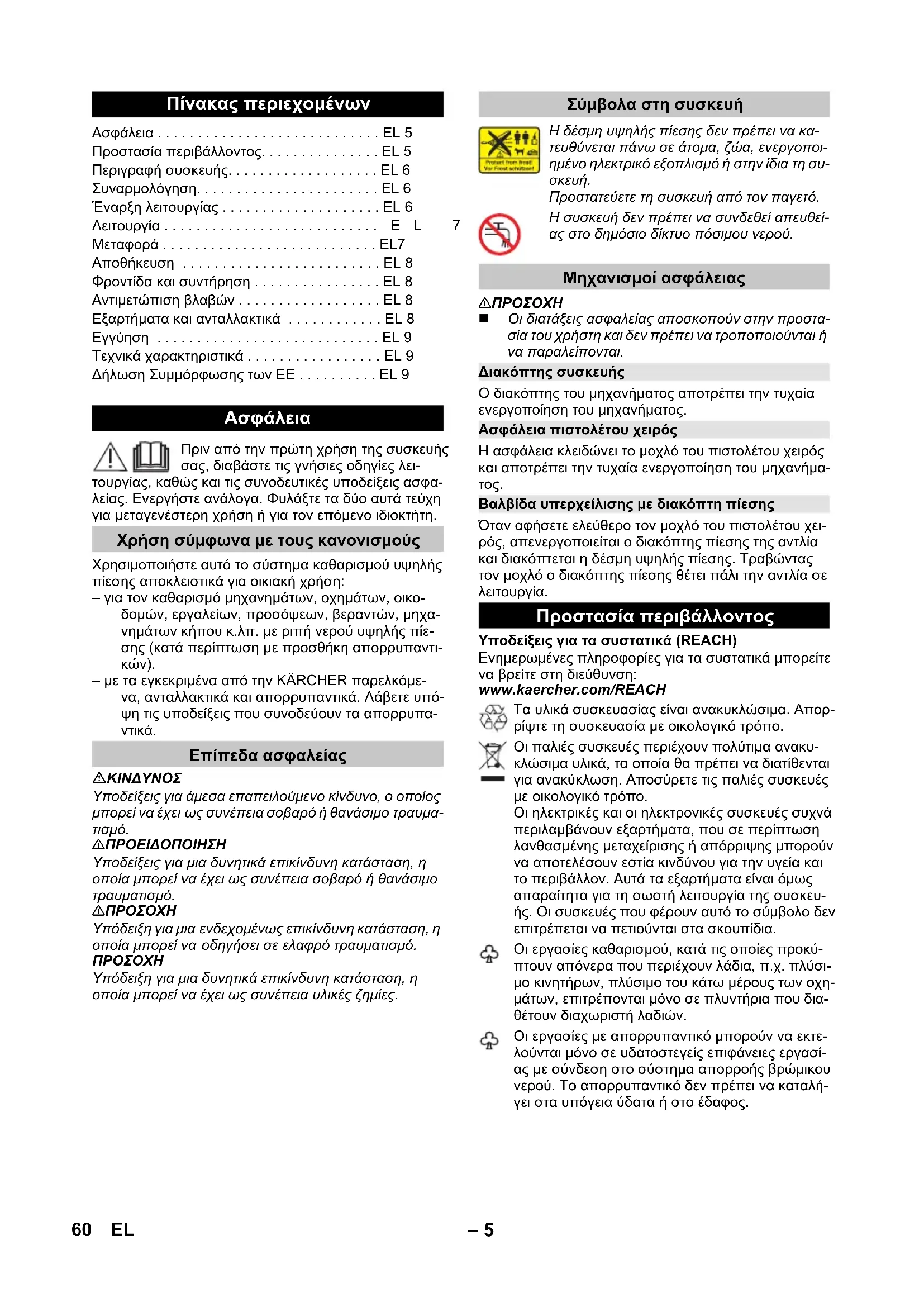 Όταν αφήσετε ελεύθερο τον μοχλό του πιστολέτου χει- ρός, απενεργοποιείται ο διακόπτης πίεσης της αντλία και διακόπτεται η δέσμη υψηλής πίεσης. Τραβώντας τον μοχλό ο διακόπτης πίεσης θέτει πάλι την αντλία σε λειτουργία. Υποδείξεις για τα συστατικά (REACH) Ενημερωμένες πληροφορίες για τα συστατικά μπορείτε να βρείτε στη διεύθυνση: www.kaercher.com/REACH Πίνακας περιεχομένων Ασφάλεια . . . . . . . . . . . . . . . . . . . . . . . . . . . . EL 5 Προστασία περιβάλλοντος. . . . . . . . . . . . . . . EL 5 Περιγραφή συσκευής. . . . . . . . . . . . . . . . . . . EL 6 Συναρμολόγηση. . . . . . . . . . . . . . . . . . . . . . . EL 6 Έναρξη λειτουργίας . . . . . . . . . . . . . . . . . . . . EL 6 Λειτουργία . . . . . . . . . . . . . . . . . . . . . . . . . . .EL 7 Μεταφορά . . . . . . . . . . . . . . . . . . . . . . . . . . . EL7 Αποθήκευση . . . . . . . . . . . . . . . . . . . . . . . . . EL 8 Φροντίδα και συντήρηση . . . . . . . . . . . . . . . . EL 8 Αντιμετώπιση βλαβών . . . . . . . . . . . . . . . . . . EL 8 Εξαρτήματα και ανταλλακτικά . . . . . . . . . . . . EL 8 Εγγύηση . . . . . . . . . . . . . . . . . . . . . . . . . . . . EL 9 Τεχνικά χαρακτηριστικά . . . . . . . . . . . . . . . . . EL 9 Δήλωση Συμμόρφωσης των ΕE . . . . . . . . . . EL 9