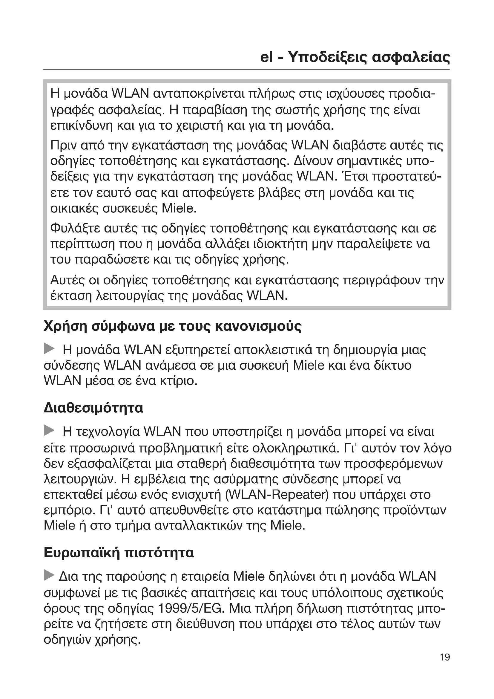 Η μονάδα WLAN ανταποκρίνεται πλήρως στις ισχύουσες προδια- γραφές ασφαλείας. Η παραβίαση της σωστής χρήσης της είναι επικίνδυνη και για το χειριστή και για τη μονάδα. Πριν από την εγκατάσταση της μονάδας WLAN διαβάστε αυτές τις οδηγίες τοποθέτησης και εγκατάστασης. Δίνουν σημαντικές υπο- δείξεις για την εγκατάσταση της μονάδας WLAN. Έτσι προστατεύ- ετε τον εαυτό σας και αποφεύγετε βλάβες στη μονάδα και τις οικιακές συσκευές Miele. Φυλάξτε αυτές τις οδηγίες τοποθέτησης και εγκατάστασης και σε περίπτωση που η μονάδα αλλάξει ιδιοκτήτη μην παραλείψετε να του παραδώσετε και τις οδηγίες χρήσης. Αυτές οι οδηγίες τοποθέτησης και εγκατάστασης περιγράφουν την έκταση λειτουργίας της μονάδας WLAN. Χρήση σύμφωνα με τους κανονισμούς Η μονάδα WLAN εξυπηρετεί αποκλειστικά τη δημιουργία μιας σύνδεσης WLAN ανάμεσα σε μια συσκευή Miele και ένα δίκτυο WLAN μέσα σε ένα κτίριο. Διαθεσιμότητα Η τεχνολογία WLAN που υποστηρίζει η μονάδα μπορεί να είναι είτε προσωρινά προβληματική είτε ολοκληρωτικά. Γι' αυτόν τον λόγο δεν εξασφαλίζεται μια σταθερή διαθεσιμότητα των προσφερόμενων λειτουργιών. Η εμβέλεια της ασύρματης σύνδεσης μπορεί να επεκταθεί μέσω ενός ενισχυτή (WLAN-Repeater) που υπάρχει στο εμπόριο. Γι' αυτό απευθυνθείτε στο κατάστημα πώλησης προϊόντων Miele ή στο τμήμα ανταλλακτικών της Miele. Ευρωπαϊκή πιστότητα Δια της παρούσης η εταιρεία Miele δηλώνει ότι η μονάδα WLAN συμφωνεί με τις βασικές απαιτήσεις και τους υπόλοιπους σχετικούς όρους της οδηγίας 1999/5/EG. Μια πλήρη δήλωση πιστότητας μπο- ρείτε να ζητήσετε στη διεύθυνση που υπάρχει στο τέλος αυτών των οδηγιών χρήσης.el - Υποδείξεις ασφαλείας