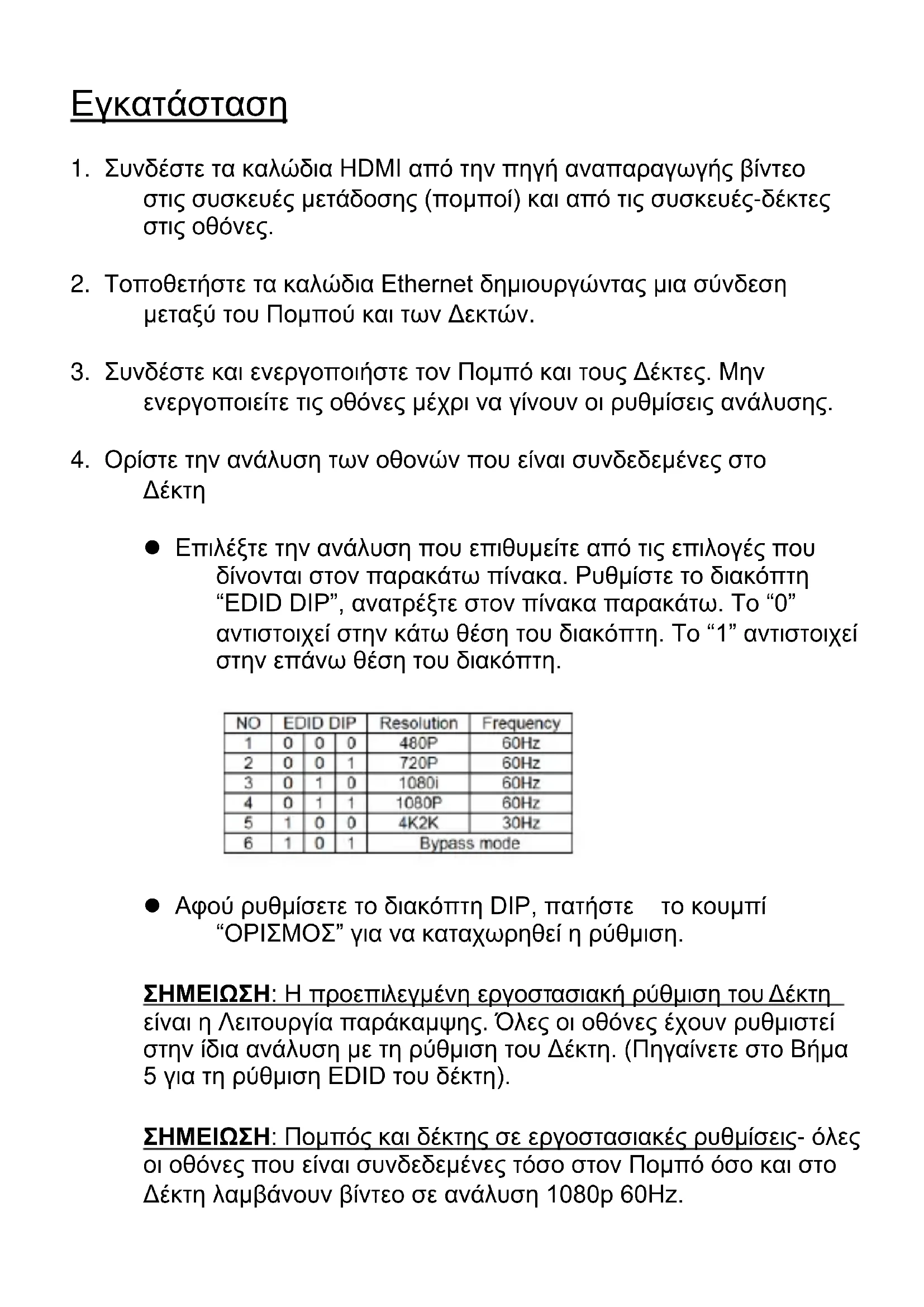 απευθείας στον Πομπό. Εάν δεν απαιτείται προβολή σε τοπικό επίπεδο στον πομπό, παραλείψτε αυτό το βήμα. Εάν η προβολή δεν είναι η επιθυμητή ή απαιτείται συγκεκριμένη ανάλυση, ορίστε την ρύθμιση με τον παρακάτω τρόπο- Επιλέξτε την ανάλυση που επιθυμείτε από τις επιλογές που δίνονται στον παρακάτω πίνακα. Ρυθμίστε το διακόπτη “EDID DIP”, ανατρέξτε στον πίνακα παρακάτω. Το “0” αντιστοιχεί στην κάτω θέση του διακόπτη. Το “1” αντιστοιχεί στην επάνω θέση του διακόπτη. Αφού ρυθμίσετε το διακόπτη DIP, πατήστε το κουμπί “ΟΡΙΣΜΟΣ” για να καταχωρηθεί η ρύθμιση. ΣΗΜΕΙΩΣΗ: Η προεπιλεγμένη εργοστασιακή ρύθμιση του δέκτη είναι βίντεο σε ανάλυση 1080p 60Hz. ΣΗΜΕΙΩΣΗ: Για το Δέκτη ορίζεται η λειτουργία παράκαμψης, για τον πομπό ορίζεται η Ανάγνωση EDID ΕΞΟΔΟΥ ΣΕ ΤΟΠΙΚΟ ΕΠΙΠΕΔΟ- Ο πομπός διαβάζει EDID από τη συνδεδεμένη οθόνηκαι τροφοδοτεί με την ίδια ρύθμιση όλες τις οθόνες που είναι συνδεδεμένες με το Δέκτη. Όταν δεν υπάρχει κάποια οθόνη σε τοπικό επίπεδο που να είναι απευθείας συνδεδεμένη στο δέκτη, η ανίχνευση των EDID δεν είναι δυνατή και ενδέχεται να προκύψει σφάλμα κατά την προβολή.