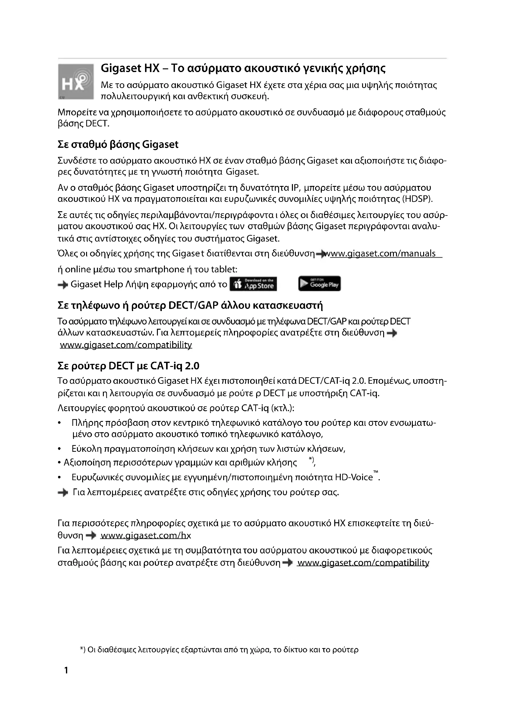 Gigaset C570HX / LHSG IM3 GR el / A31008-M2861-R601-1-TK19 / Cover_front_c.fm / 9/27/17 C570 HX Αναλυτικές πληροφορίες για το σύστημα τηλεφώνου: Οδηγίες χρήσης του τηλεφώνου Gigaset www.gigaset.com/manuals Τεκμηρίωση σταθμού βάσης/ρούτερ Online οδηγίες χρήσης στο smartphone ή το tablet σας: Gigaset Help Λήψη της εφαρμογή απόGigaset C570HX / LHSG IM3 GR el / A31008-M2861-R601-1-TK19 / Cover_front_c.fm / 9/27/171 Gigaset C570HX / LHSG IM3 GR el / A31008-M2861-R601-1-TK19 / intro_HX.fm / 9/27/17 Template Go, Version 1, 01.07.2014 / ModuleVersion 1.0 Gigaset HX – Το ασύρματο ακουστικό γενικής χρήσης Με το ασύρματο ακουστικό Gigaset HX έχετε στα χέρια σας μια υψηλής ποιότητας πολυλειτουργική και ανθεκτική συσκευή. Μπορείτε να χρησιμοποιήσετε το ασύρματο ακουστι κό σε συνδυασμό με διάφορους σταθμούς βάσης DECT. Σε σταθμό βάσης Gigaset Συνδέστε το ασύρματο ακουστικό HX σε έναν σταθμό βάσης Gigaset και αξιοποιήστε τις διάφο- ρες δυνατότητες με τη γνωστή ποιότητα Gigaset. Αν ο σταθμός βάσης Gigaset υποστηρίζει τη δυνατότητα IP, μπορείτε μέσω του ασύρματου ακουστικού HX να πραγματοποιείται και ευρυζωνικές συνομιλίες υψηλής ποιότητας (HDSP). Σε αυτές τις οδηγίες περιλαμβάνονται/περιγράφοντα ι όλες οι διαθέσιμες λειτουργίες του ασύρ- ματου ακουστικού σας HX. Οι λειτουργίες των σταθμών βάσης Gigaset περιγράφονται αναλυ- τικά στις αντίστοιχες οδηγίε ς του συστήματος Gigaset. Όλες οι οδηγίες χρήσης της Gigase t διατίθενται στη διεύθυνση www.gigaset.com/manuals ή online μέσω του smartphone ή του tablet: Gigaset Help Λήψη εφαρμογής από το ή το Σε τηλέφωνο ή ρούτερ DECT/GAP άλλου κατασκευαστή Το ασύρματο τηλέφωνο λειτουργεί και σε συνδυασμό με τηλέφωνα DECT/GAP και ρούτερ DECT άλλων κατασκευαστών. Για λεπτομερείς πληροφορίες ανατρέξτε στη διεύθυνση www.gigaset.com/compatibility Σε ρούτερ DECT με CAT-iq 2.0 Το ασύρματο ακουστικό Gigaset HX έχει πιστοποιηθεί κατά DECT/CAT-iq 2.0. Επομένως, υποστη- ρίζεται και η λειτουργία σε συνδυασμό με ρούτε ρ DECT με υποστήριξη CAT-iq. Λειτουργίες φορητού ακουστικού σε ρούτερ CAT-iq (κτλ.):