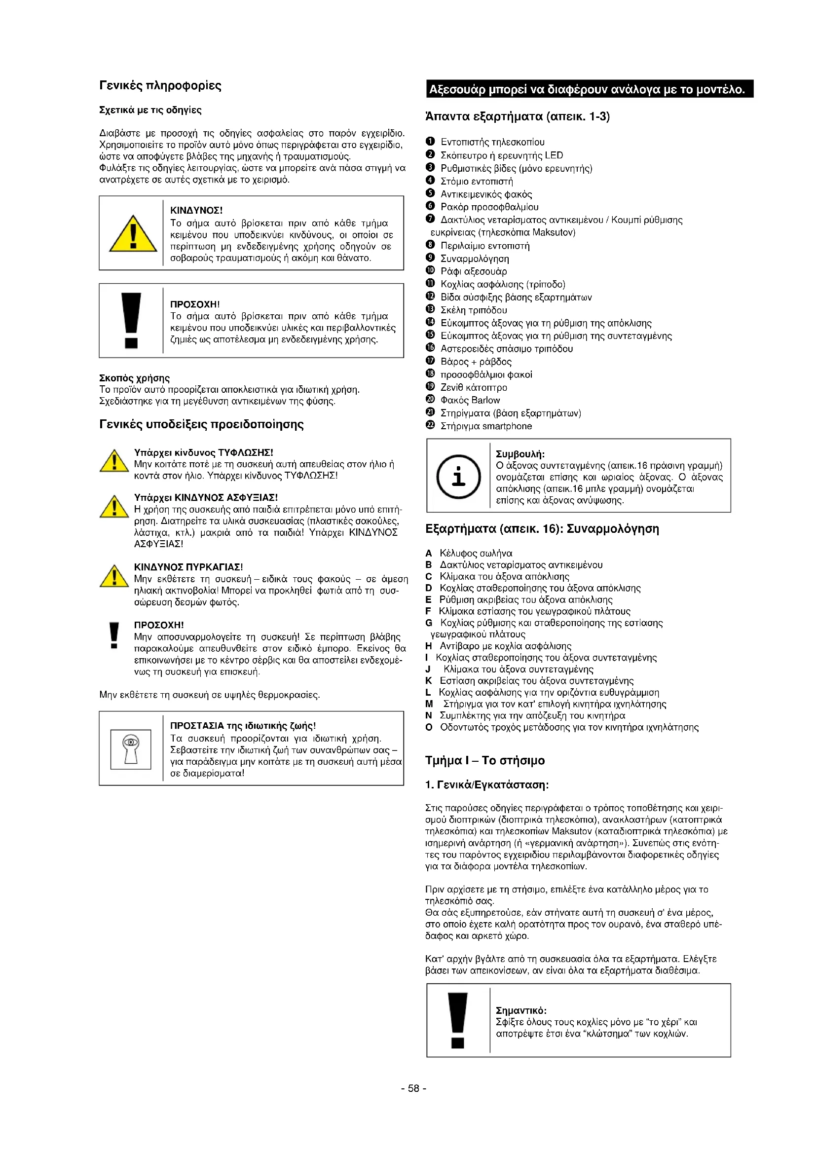 Στις παρούσες οδηγίες περιγράφεται ο τρόπος τοποθέτησης και χειρι- σμού διοπτρικών (διοπτρικά τηλεσκόπια), ανακλαστήρων (κατοπτρικά τηλεσκόπια) και τηλεσκοπίων Maksutov (καταδιοπτρικά τηλεσκόπια) με ισημερινή ανάρτηση (ή «γερμανική ανάρτηση»). Συνεπώς στις ενότη- τες του παρόντος εγχειριδίου περιλαμβάνονται διαφορετικές οδηγίες για τα διάφορα μοντέλα τηλεσκοπίων. Πριν αρχίσετε με τη στήσιμο, επιλέξτε ένα κατάλληλο μέρος για το τηλεσκόπιό σας. Θα σάς εξυπηρετούσε, εάν στήνατε αυτή τη συσκευή σ' ένα μέρος, στο οποίο έχετε καλή ορατότητα προς τον ουρανό, ένα σταθερό υπέ- δαφος και αρκετό χώρο. Κατ' αρχήν βγάλτε από τη συσκευασία όλα τα εξαρτήματα. Ελέγξτε βάσει των απεικονίσεων, αν είναι όλα τα εξαρτήματα διαθέσιμα.