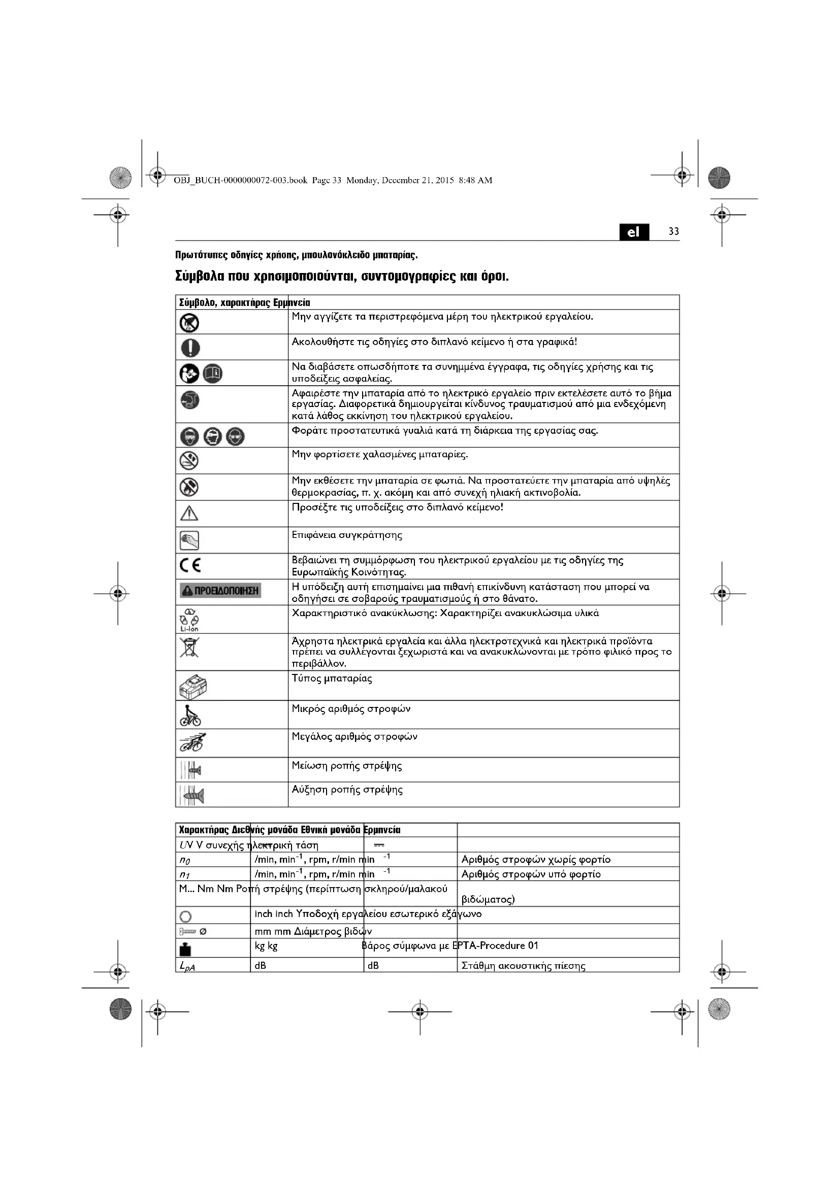 Η εγγύηση για το προϊόν ισχύει σύμφωνα με τις νομικές διατάξεις της χώρας στην οποία κυκλοφορεί. Εκτός αυτού η FEIN σας παρέχει και μια επί πλέον εγγύηση, ανάλογα με την εκάστοτε δήλωση κατασκευαστή της FEIN. Στη συσκευασία του ηλεκτρικού σας εργαλείου μπορεί να περιέχεται μόνο ένα μέρος των εξαρτημάτων που περιγράφονται ή απεικονίζονται σ’ αυτές τις οδηγίες χρήσης. Δήλωση συμμόρφωσης. Η εταιρία FEIN δηλώνει με αποκλειστική ευθύνη της ότι αυτό το προϊόν ανταποκρίνεται πλήρως στους σχετικούς κανονισμούς που αναφέρονται στην τελευταία σελίδα αυτών των οδηγιών χρήσης. Τεχνικά έγγραφα από: C. & E. Fein GmbH, C-DB_IA, D-73529 Schwäbisch Gmünd Προστασία του περιβάλλοντος, απόσυρση. Οι συσκευασίες, τα άχρηστα ηλεκτρικά εργαλεία και τα εξαρτήματα πρέπει να ανακυκλώνονται με τρόπο φιλικό προς το περιβάλλον. Να αποσύρετε κανονικά τις μπαταρίες, μόνο όταν αυτές είναι εκφορτισμένες. Όταν οι μπαταρίες δεν είναι τελείως άδειες να τις προστατεύετε από βραχυκυκλώματα μονώνοντας το βύσμα με κολλητική ταινία. Διαβάστε όλες τις προειδοποιητικές υποδείξεις. OBJ_BUCH-0000000072-003.book Page 36 Monday, December 21, 2015 8:48 AM37