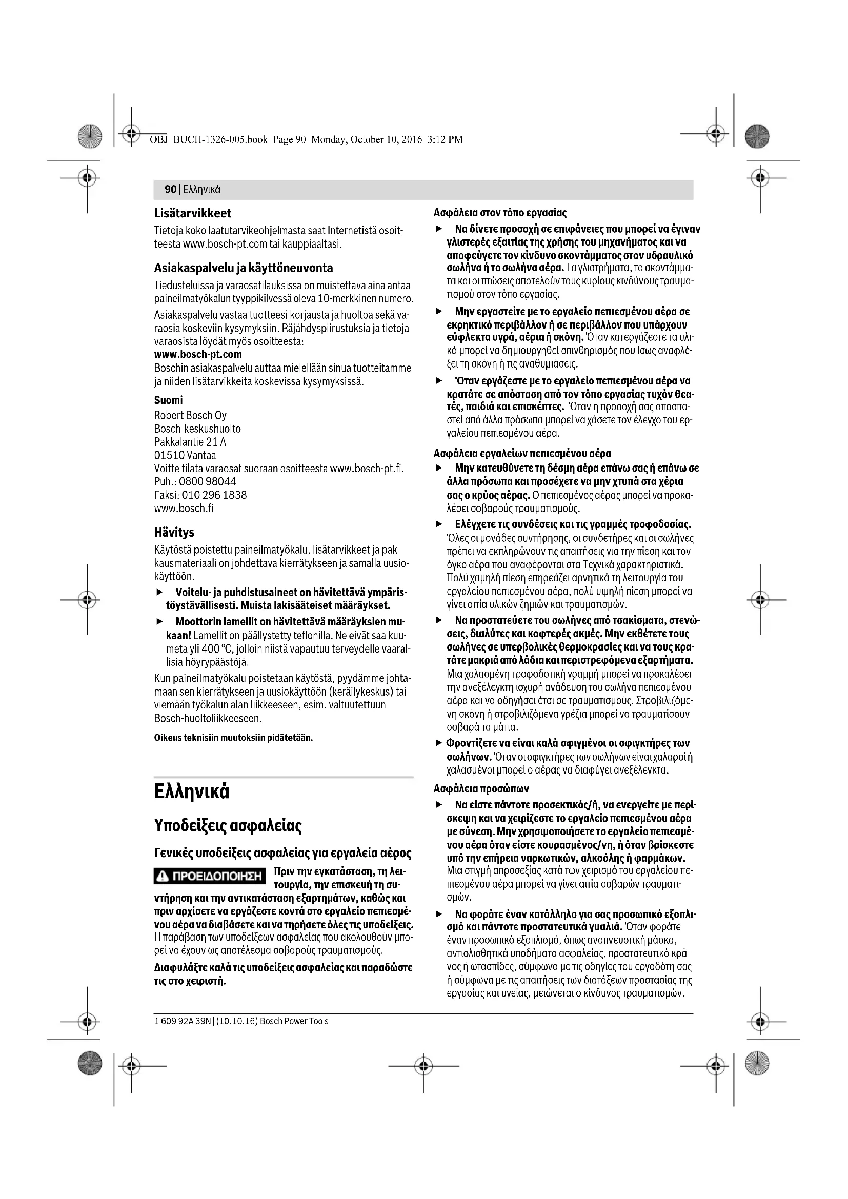 Να φοράτε έναν κατάλληλο για σας προσωπικό εξοπλι- σμό και πάντοτε προστατευτικά γυαλιά. Όταν φοράτε έναν προσωπικό εξοπλισμό, όπως αναπνευστική μάσκα, αντιολισθητικά υποδήματα ασφαλείας, προστατευτικό κρά- νος ή ωτασπίδες, σύμφωνα με τις οδηγίες του εργοδότη σας ή σύμφωνα με τις απαιτήσεις των διατάξεων προστασίας της εργασίας και υγείας, μειώνεται ο κίνδυνος τραυματισμών. OBJ_BUCH-1326-005.book Page 90 Monday, October 10, 2016 3:12 PMΕλληνικά | 91 Bosch Power Tools 1 609 92A 39N | (10.10.16) Να αποφεύγετε την αθέλητη εκκίνηση. Να βεβαιώνεστε ότι το εργαλείο πεπιεσμένου αέρα είναι απενεργοποιη- μένο πριν το συνδέσετε στην τροφοδοσία αέρα. Όταν μεταφέρετε το εργαλείο πεπιεσμένου έχοντας το δάκτυλό σας στο διακόπτη ON/OFF ή όταν το εργαλείο πεπιεσμένου αέρα είναι ενεργοποιημένο όταν το συνδέετε στη τροφοδο- σία αέρα μπορεί να προκληθούν ατυχήματα. Απομακρύνετε όλα τα εργαλεία ρύθμισης πριν θέσετε σε λειτουργία το εργαλείο πεπιεσμένου αέρα. Ένα εργαλείο ρύθμισης που βρίσκεται σε ένα περιστρεφόμενο εξάρτημα του εργαλείου πεπιεσμένου αέρα μπορεί να προκαλέσει τραυματισμούς. Μην υπερεκτιμάτε τον εαυτό σας. Να παίρνετε πάντοτε μια ασφαλή στάση και να διατηρείτε ανά πάσα στιγμή την ισορροπία σας. Όταν πατάτε ασφαλώς και το σώμα σας έχει την κατάλληλη στάση μπορείτε, όταν εμφανιστούν ανα- πάντεχες καταστάσεις, να ελέγξετε καλύτερα το εργαλείο πεπιεσμένου αέρα. Να φοράτε κατάλληλη ενδυμασία. Μην φοράτε φαρδιά ρούχα ή κοσμήματα. Να κρατάτε τα μαλλιά σας, τα ρούχα σας και τα γάντια σας μακριά από κινούμενα εξαρτήμα- τα. Χαλαρά ρούχα, κοσμήματα ή μακριά μαλλιά μπορεί να εμπλακούν στα κινούμενα εξαρτήματα. Όταν υπάρχει η δυνατότητα συναρμολόγησης διατάξε- ων αναρρόφησης ή/και συλλογής σκόνης να βεβαιώνε- στε ότι αυτές είναι συνδεδεμένες καθώς και ότι λειτουρ- γούν σωστά. Η χρήση των διατάξεων αυτών μειώνει τους κινδύνους που προέρχονται από τη σκόνη. Να μην αναπνέετε άμεσα τον εξερχόμενο αέρα και να προστατεύετε τα μάτια σας απ’ αυτόν. Ο αέρας που εξέρ- χεται από το εργαλείο πεπιεσμένου αέρα μπορεί να περιέχει νερό, λάδια, μεταλλικά σωματίδια ή ρύπους από το συμπιε- στή. Αυτό μπορεί να βλάψει την υγεία. Επιμελής χειρισμός και χρήση των εργαλείων πεπιεσμένου