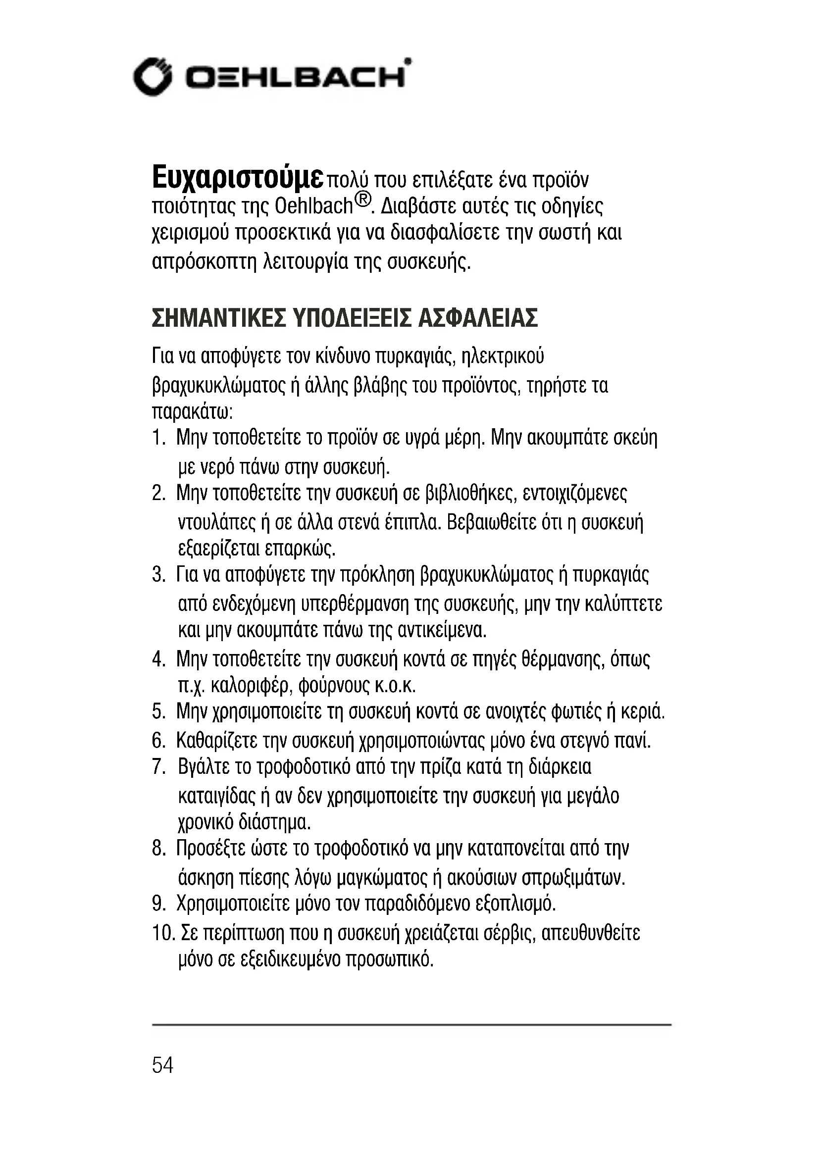 Συγχαρητήρια! Χάρη στην έξυπνη επιλογή σας είστε κάτοχος ενός προϊόντος OEHLBACH®. Τα προϊόντα OEHLBACH® είναι ιδιαίτερα αγαπητά σε όλο τον κόσμο χάρη στην εξαιρετική τους ποιότητα. Χάρη στην ποιότητα των προϊόντων μας, μπορούμε να παρέχουμε 2ετή εγγύηση για αυτό το προϊόν OEHLBACH®. Τα προϊόντα OEHLBACH® ελέγχονται συνεχώς καθ’ όλη τη διάρκεια της παραγωγής. Σε περίπτωση που χρειαστείτε σέρβις προσέξτε τα εξής: