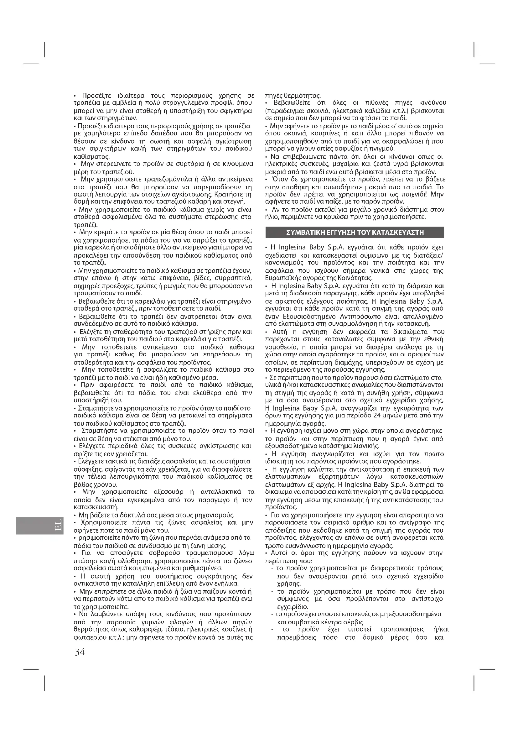 - Η Inglesina Baby S.p.A. εγγυάται ότι κάθε προϊόν έχει σχεδιαστεί και κατασκευαστεί σύμφωνα με τις διατάξεις/ κανονισμούς του προϊόντος και την ποιότητα και την ασφάλεια που ισχύουν σήμερα γενικά στις χώρες της Ευρωπαϊκής αγοράς της Κοινότητας.