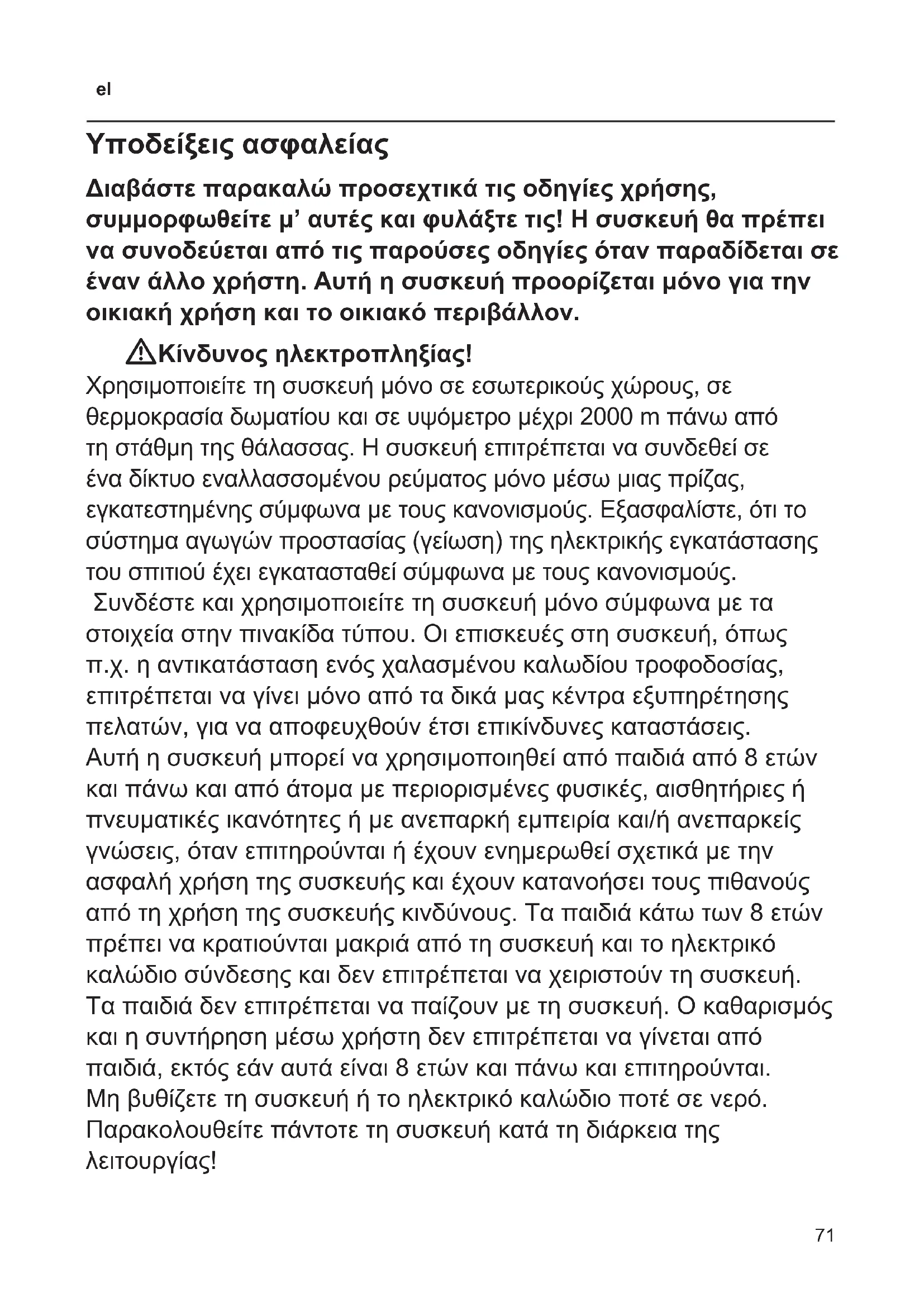 Υποδείξεις ασφαλείας Διαβάστε παρακαλώ προσεχτικά τις οδηγίες χρήσης, συμμορφωθείτε μ’ αυτές και φυλάξτε τις! Η συσκευή θα πρέπει να συνοδεύεται από τις παρούσες οδηγίες όταν παραδίδεται σε έναν άλλο χρήστη. Αυτή η συσκευή προορίζεται μόνο για την οικιακή χρήση και το οικιακό περιβάλλον. WΚίνδυνος ηλεκτροπληξίας! Χρησιμοποιείτε τη συσκευή μόνο σε εσωτερικούς χώρους, σε θερμοκρασία δωματίου και σε υψόμετρο μέχρι 2000 m πάνω από τη στάθμη της θάλασσας. Η συσκευή επιτρέπεται να συνδεθεί σε ένα δίκτυο εναλλασσομένου ρεύματος μόνο μέσω μιας πρίζας, εγκατεστημένης σύμφωνα με τους κανονισμούς. Εξασφαλίστε, ότι το σύστημα αγωγών προστασίας (γείωση) της ηλεκτρικής εγκατάστασης του σπιτιού έχει εγκατασταθεί σύμφωνα με τους κανονισμούς. Συνδέστε και χρησιμοποιείτε τη συσκευή μόνο σύμφωνα με τα στοιχεία στην πινακίδα τύπου. Οι επισκευές στη συσκευή, όπως π.χ. η αντικατάσταση ενός χαλασμένου καλωδίου τροφοδοσίας, επιτρέπεται να γίνει μόνο από τα δικά μας κέντρα εξυπηρέτησης πελατών, για να αποφευχθούν έτσι επικίνδυνες καταστάσεις. Αυτή η συσκευή μπορεί να χρησιμοποιηθεί από παιδιά από 8 ετών και πάνω και από άτομα με περιορισμένες φυσικές, αισθητήριες ή πνευματικές ικανότητες ή με ανεπαρκή εμπειρία και/ή ανεπαρκείς γνώσεις, όταν επιτηρούνται ή έχουν ενημερωθεί σχετικά με την ασφαλή χρήση της συσκευής και έχουν κατανοήσει τους πιθανούς από τη χρήση της συσκευής κινδύνους. Τα παιδιά κάτω των 8 ετών πρέπει να κρατιούνται μακριά από τη συσκευή και το ηλεκτρικό καλώδιο σύνδεσης και δεν επιτρέπεται να χειριστούν τη συσκευή. Τα παιδιά δεν επιτρέπεται να παίζουν με τη συσκευή. Ο καθαρισμός και η συντήρηση μέσω χρήστη δεν επιτρέπεται να γίνεται από παιδιά, εκτός εάν αυτά είναι 8 ετών και πάνω και επιτηρούνται. Μη βυθίζετε τη συσκευή ή το ηλεκτρικό καλώδιο ποτέ σε νερό. Παρακολουθείτε πάντοτε τη συσκευή κατά τη διάρκεια της λειτουργίας!72