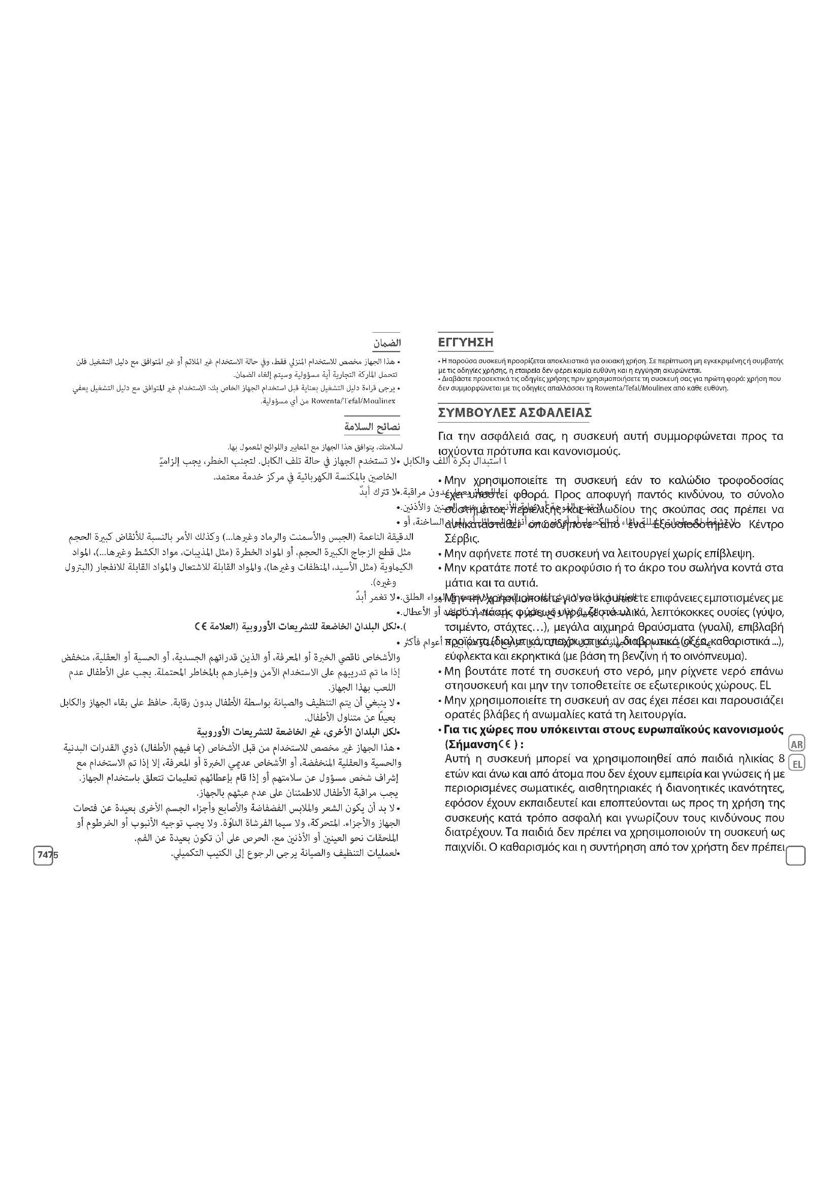 - Διαβάστε προσεκτικά τις οδηγίες χρήσης πριν χρησιμοποιήσετε τη συσκευή σας για πρώτη φορά: χρήση που δεν συμμορφώνεται με τις οδηγίες απαλλάσσει τη Rowenta/Tefal/Moulinex από κάθε ευθύνη. ΣΥΜΒΟΥΛΕΣ ΑΣΦΑΛΕΙΑΣ Για την ασφά λειά σας, η συσκευή αυτή συμμορφώνεται προς τα ισχύοντα πρότυπα και κανονισμούς.