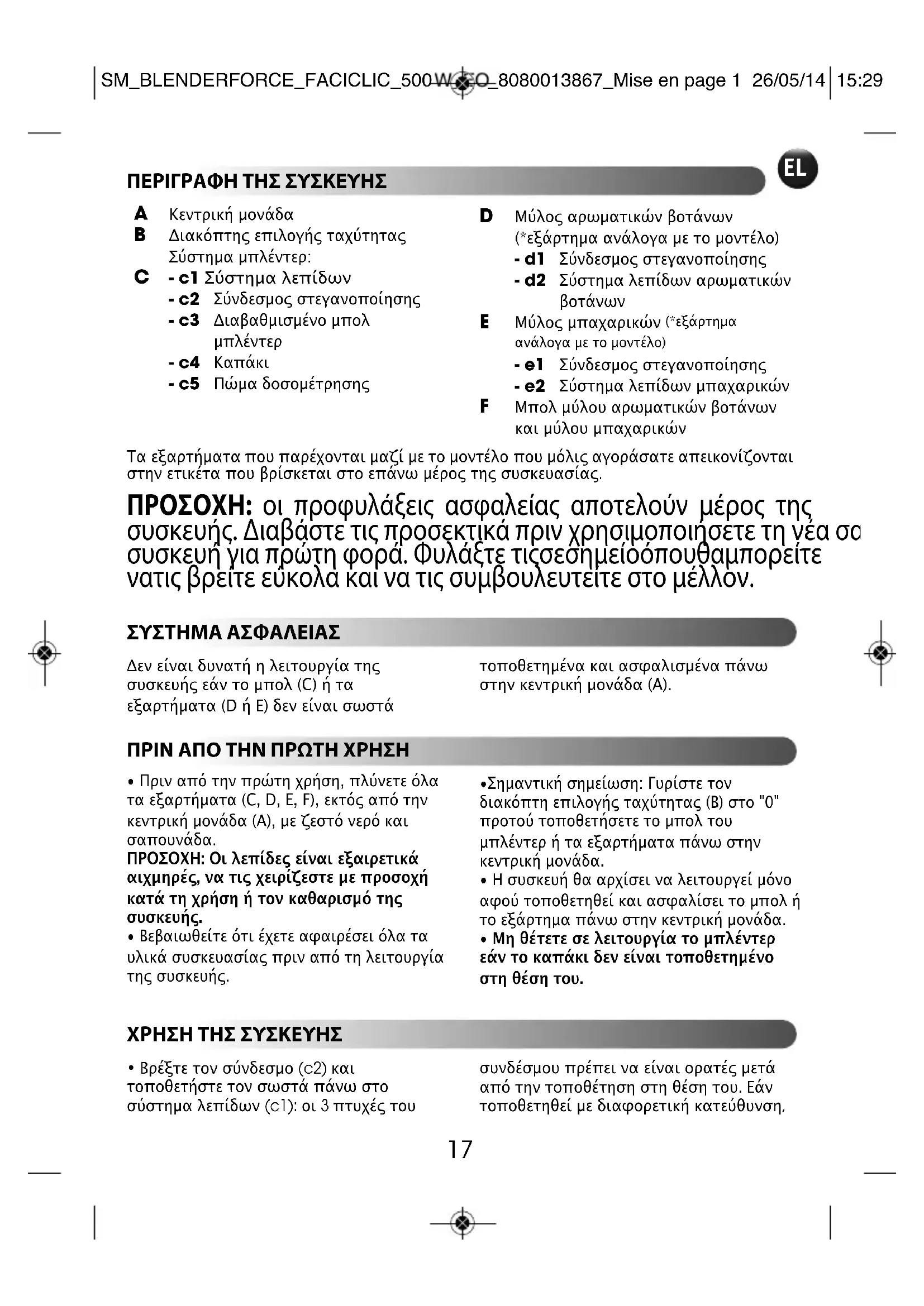 - Βρέξτε τον σύνδεσμο (c2) καιτοποθετήστε τον σωστά πάνω στοσύστημα λεπίδων (c1): οι 3 πτυχές τουσυνδέσμου πρέπει να είναι ορατές μετάαπό την τοποθέτηση στη θέση του. Εάντοποθετηθεί με διαφορετική κατεύθυνση,• Πριν από την πρώτη χρήση, πλύνετε όλατα εξαρτήματα (C, D, E, F), εκτός από τηνκεντρική μονάδα (A), με ζεστό νερό καισαπουνάδα.ΠΡΟΣΟΧΗ: Οι λεπίδες είναι εξαιρετικάαιχμηρές, να τις χειρίζεστε με προσοχήκατά τη χρήση ή τον καθαρισμό τηςσυσκευής.• Βεβαιωθείτε ότι έχετε αφαιρέσει όλα ταυλικά συσκευασίας πριν από τη λειτουργίατης συσκευής. •Σημαντική σημείωση: Γυρίστε τονδιακόπτη επιλογής ταχύτητας (B) στο "0"προτού τοποθετήσετε το μπολ τουμπλέντερ ή τα εξαρτήματα πάνω στηνκεντρική μονάδα.• Η συσκευή θα αρχίσει να λειτουργεί μόνοαφού τοποθετηθεί και ασφαλίσει το μπολ ήτο εξάρτημα πάνω στην κεντρική μονάδα.• Μη θέτετε σε λειτουργία το μπλέντερεάν το καπάκι δεν είναι τοποθετημένοστη θέση του. SM_BLENDERFORCE_FACICLIC_500W_EO_8080013867_Mise en page 1 26/05/14 15:2918 δεν θα μπορείτε να ασφαλίσετε το σύστημα λεπίδων πάνω στο μπολ. (Εικ. 1)