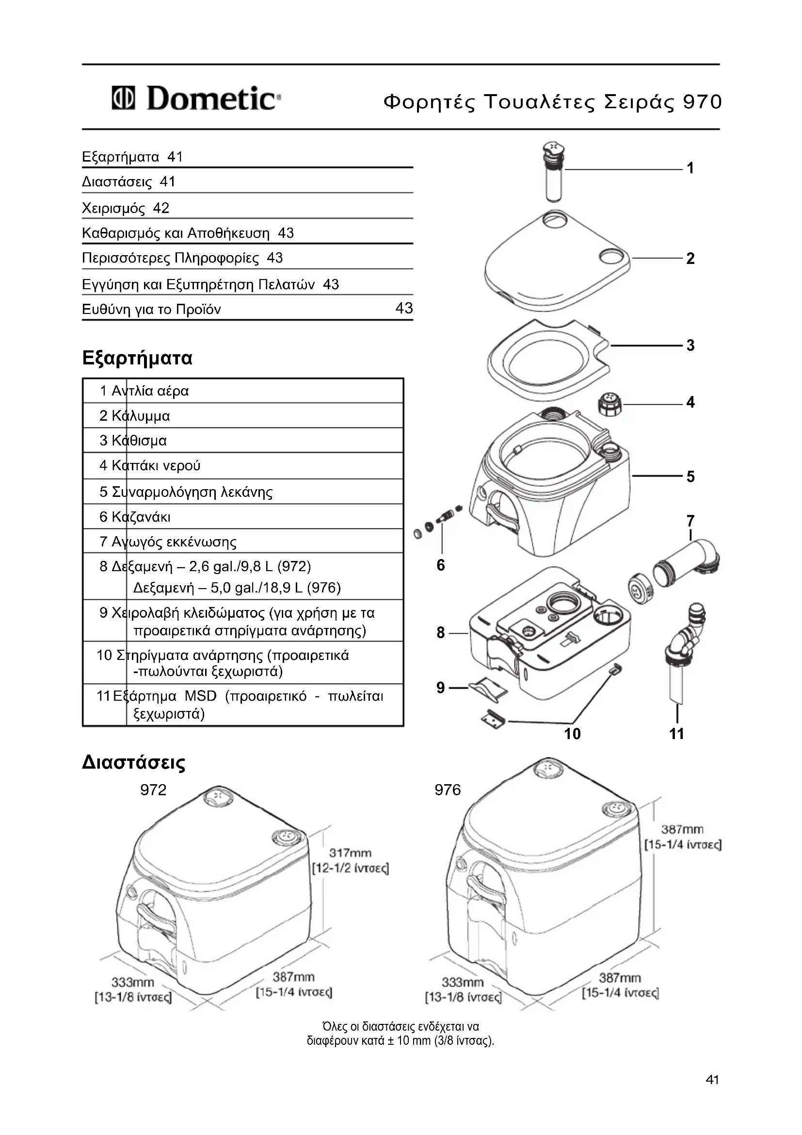 13128 SR 226 | PO BOX 38 | BIG PRAIRIE, OHIO 44611 USA www.DometicSanitation.com41 Φορητές Τουαλέτες Σειράς 970 Όλες οι διαστάσεις ενδέχεται να διαφέρουν κατά ± 10 mm (3/8 ίντσας).