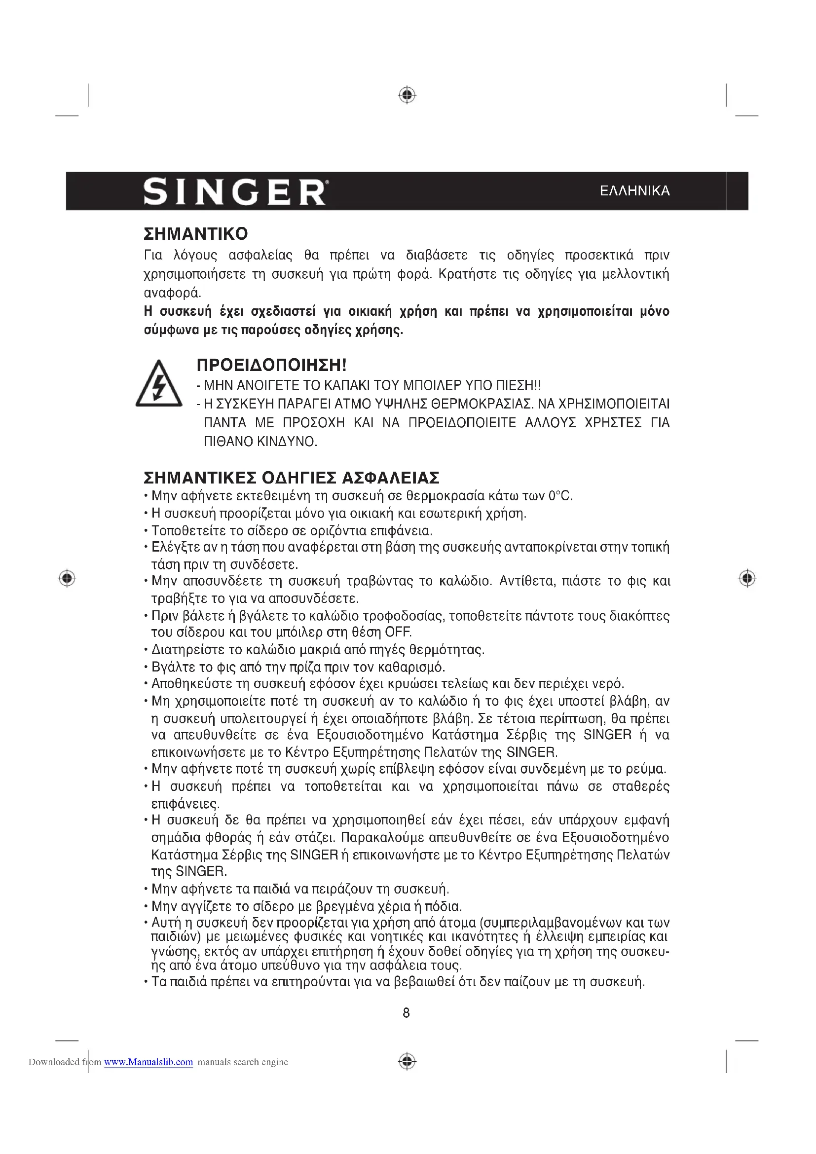 - Η μη τήρηση αυτών των κανονισμών και υποδείξεων που περιγράφονται στο παρόν εγχειρίδιο απαλλάσσει τη Singer από κάθε ευθύνη σε περίπτωση κακής λειτουργίας ή πρόκλησης βλάβης σε άτομα, ζώα, κλπ.