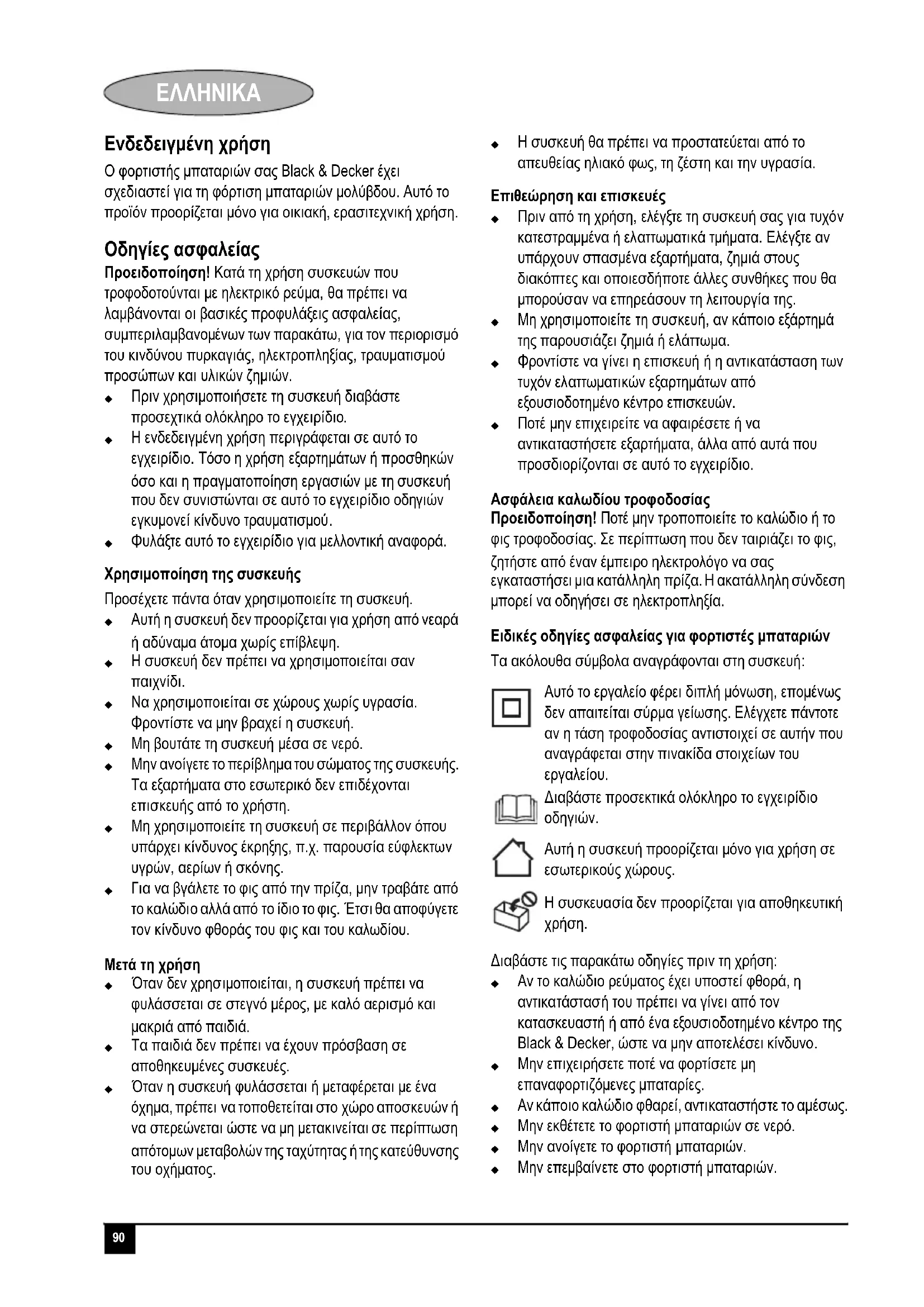 O φορτιστής μπαταρίων σας Black & Decker ἐχει oxεδιαστέγν τη φόρτιση μπαταρίων ρολύβδου. Autó to προίον προρρίζειται Μόνο για έίκακή, ερασιθεχνιή κρόση.