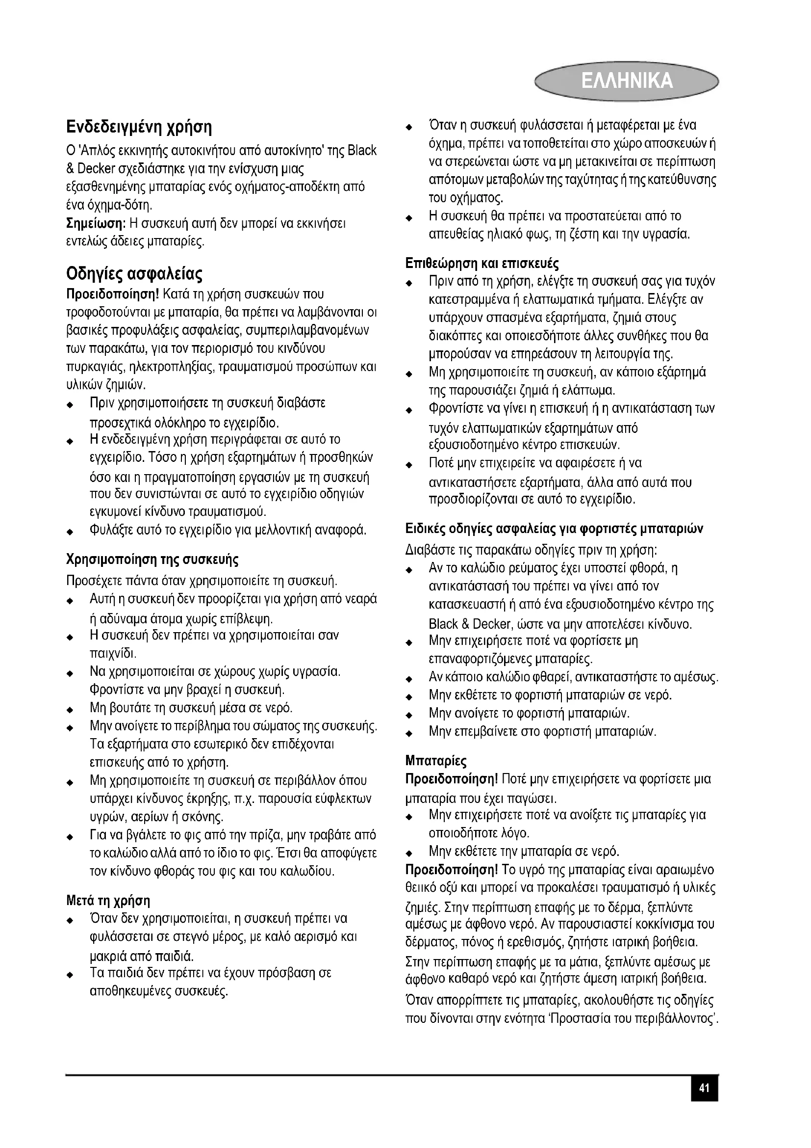 X Να χρησιμοποιείται σε χώρους χωρίς υγρασία. Φροντίστε να μην βραχεί η συσκευή. X Μη βουτάτε τη συσκευή μέσα σε νερό. X Μην ανοίγετε το περίβλημα του σώματος της συσκευής. Τα εξαρτήματα στο εσωτερικό δεν επιδέχονται επισκευής από το χρήστη. X Μη χρησιμοποιείτε τη συσκευή σε περιβάλλον όπου υπάρχει κίνδυνος έκρηξης, π.χ. παρουσία εύφλεκτων υγρών, αερίων ή σκόνης. X Για να βγάλετε το φις από την πρίζα, μην τραβάτε από το καλώδιο αλλά από το ίδιο το φις. Έτσι θα αποφύγετε τον κίνδυνο φθοράς του φις και του καλωδίου. Μετά τη χρήση X Όταν δεν χρησιμοποιείται, η συσκευή πρέπει να φυλάσσεται σε στεγνό μέρος, με καλό αερισμό και μακριά από παιδιά. X Τα παιδιά δεν πρέπει να έχουν πρόσβαση σε αποθηκευμένες συσκευές. X Όταν η συσκευή φυλάσσεται ή μεταφέρεται με ένα όχημα, πρέπει να τοποθετείται στο χώρο αποσκευών ή να στερεώνεται ώστε να μη μετακινείται σε περίπτωση απότομων μεταβολών της ταχύτητας ή της κατεύθυνσης του οχήματος. X Η συσκευή θα πρέπει να προστατεύεται από το απευθείας ηλιακό φως, τη ζέστη και την υγρασία. Επιθεώρηση και επισκευές X Πριν από τη χρήση, ελέγξτε τη συσκευή σας για τυχόν κατεστραμμένα ή ελαττωματικά τμήματα. Ελέγξτε αν υπάρχουν σπασμένα εξαρτήματα, ζημιά στους διακόπτες και οποιεσδήποτε άλλες συνθήκες που θα μπορούσαν να επηρεάσουν τη λειτουργία της. X Μη χρησιμοποιείτε τη συσκευή, αν κάποιο εξάρτημά της παρουσιάζει ζημιά ή ελάττωμα. X Φροντίστε να γίνει η επισκευή ή η αντικατάσταση των τυχόν ελαττωματικών εξαρτημάτων από εξουσιοδοτημένο κέντρο επισκευών. X Ποτέ μην επιχειρείτε να αφαιρέσετε ή να αντικαταστήσετε εξαρτήματα, άλλα από αυτά που προσδιορίζονται σε αυτό το εγχειρίδιο. Ειδικές οδηγίες ασφαλείας για φορτιστές μπαταριών Διαβάστε τις παρακάτω οδηγίες πριν τη χρήση: X Αν το καλώδιο ρεύματος έχει υποστεί φθορά, η αντικατάστασή του πρέπει να γίνει από τον κατασκευαστή ή από ένα εξουσιοδοτημένο κέντρο της Black & Decker, ώστε να μην αποτελέσει κίνδυνο. X Μην επιχειρήσετε ποτέ να φορτίσετε μη επαναφορτιζόμενες μπαταρίες. X Αν κάποιο καλώδιο φθαρεί, αντικαταστήστε το αμέσως. X Μην εκθέτετε το φορτιστή μπαταριών σε νερό. X Μην ανοίγετε το φορτιστή μπαταριών. X Μην επεμβαίνετε στο φορτιστή μπαταριών.