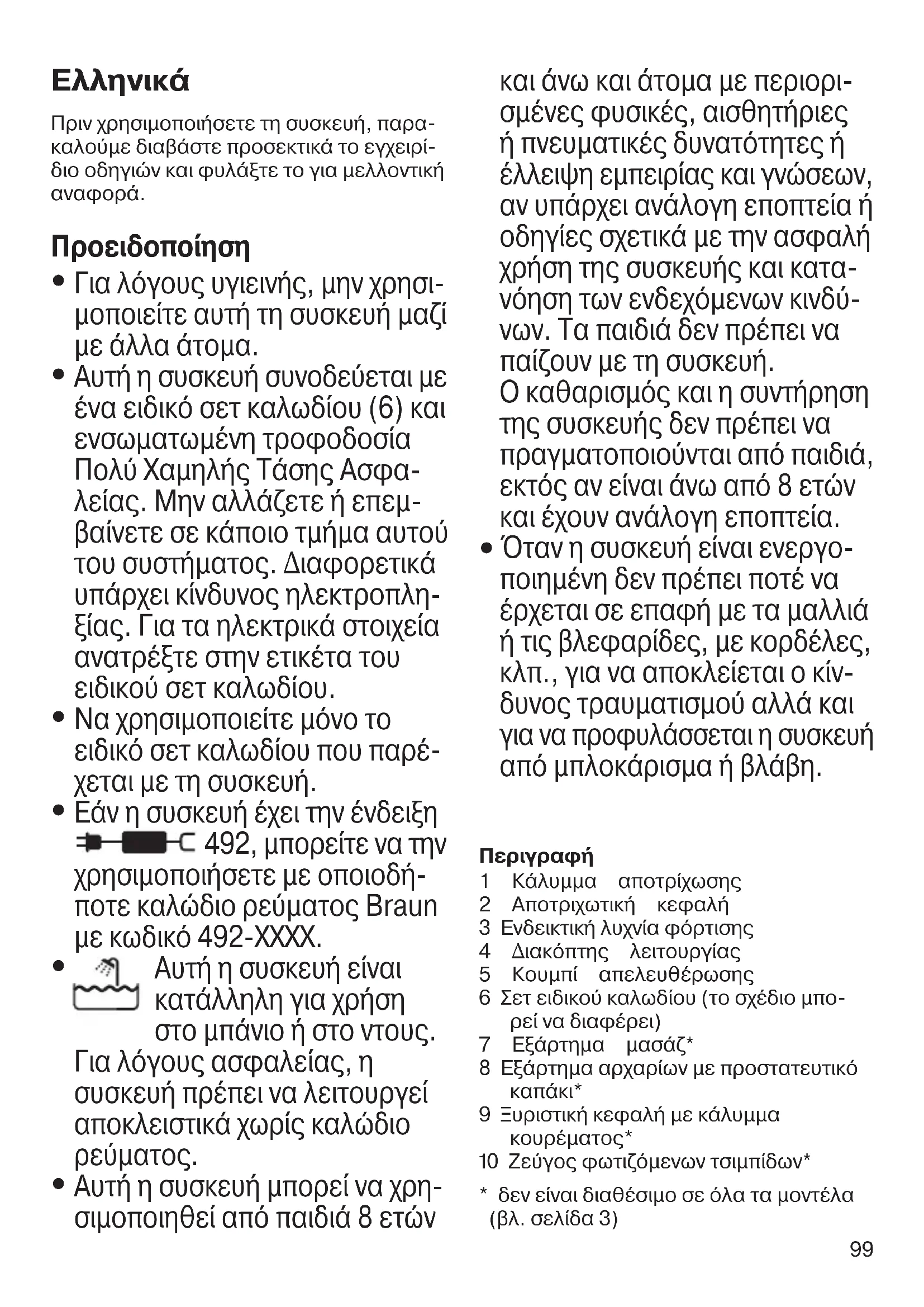 Εάν η συσκευή έχει την ένδειξη 492, μπορείτε να την χρησιμοποιήσετε με οποιοδή- ποτε καλώδιο ρεύματος Braun με κωδικό 492-ΧΧΧΧ.