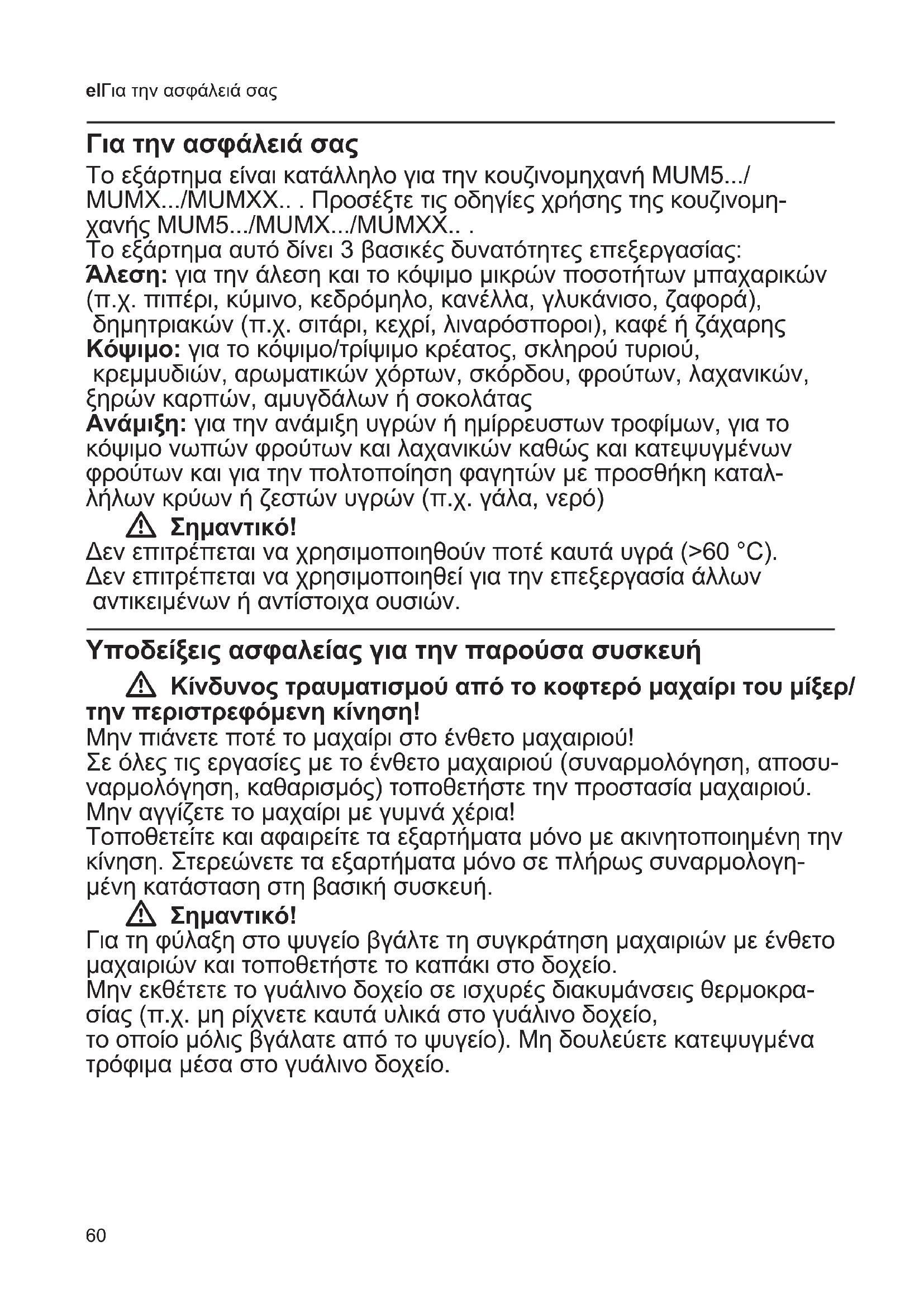 W Κίνδυνος τραυματισμού από το κοφτερό μαχαίρι! Μην πιάνετε ποτέ το μαχαίρι στο ένθετο μαχαιριού! Σε όλες τις εργασίες με το ένθετο μαχαιριού (συναρμολόγηση, αποσυναρ μολόγηση, καθαρισμός) τοποθετήστε την προστασία μαχαιριού. ■ Πριν την πρώτη χρήση καθαρίστε όλα τα μέρη, βλ. «Καθαρισμός και φροντίδα». Εικόνα D X MUM5... Εικόνα E X MUMX... Προετοιμασία προσαρτήματος Εικόνα λεπτομέρειας 1-5 ■ Βάλτε τα υλικά στο δοχείο. Μην υπερβαίνετε το σημάδι max! ■ Πιάστε το ένθετο μαχαιριού στην προστασία μαχαιριού και τοποθετήστε το στη συγκράτηση μαχαιριού. Πιέστε το προς τα κάτω μέχρι να κουμπώσει. ■ Αφαιρέστε την προστασία μαχαιριού. ■ Τοποθετήστε τη συγκράτηση μαχαιριού στο δοχείο και κλείστε το στρέφοντάς το αντίθετα προς τη φορά των δεικτών του