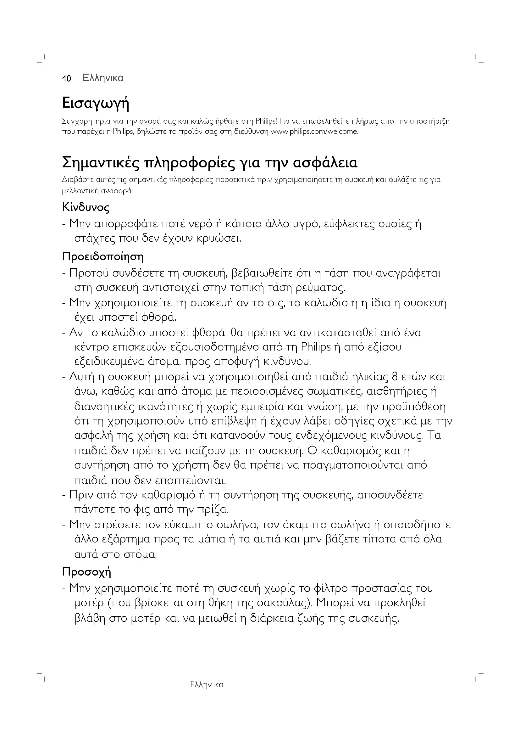 Συγχαρητήρια για την αγορά σας και καλώς ήρθατε στη Philips! Για να επωφεληθείτε πλήρως από την υποστήριξη που παρέχει η Philips, δηλώστε το προϊόν σας στη διεύθυνση www.philips.com/welcome. Σημαντικές πληροφορίες για την ασφάλεια Διαβάστε αυτές τις σημαντικές πληροφορίες προσεκτικά πριν χρησιμοποιήσετε τη συσκευή και φυλάξτε τις για μελλοντική αναφορά.