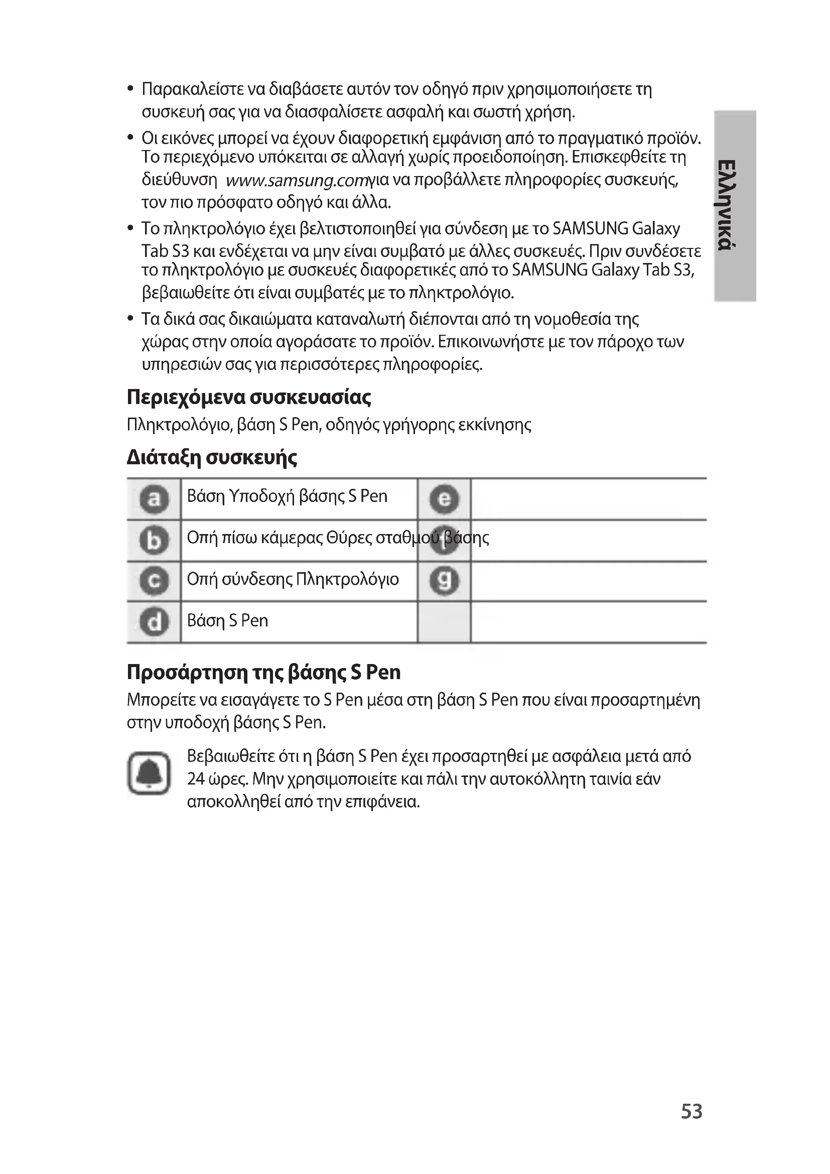 Τα δικά σας δικαιώματα καταναλωτή διέπονται από τη νομοθεσία της χώρας στην οποία αγοράσατε το προϊόν. Επικοινωνήστε με τον πάροχο των υπηρεσιών σας για περισσότερες πληροφορίες. Περιεχόμενα συσκευασίας Πληκτρολόγιο, βάση S Pen, οδηγός γρήγορης εκκίνησης Διάταξη συσκευής Βάση Υποδοχή βάσης S Pen Οπή πίσω κάμερας Θύρες σταθμού βάσης Οπή σύνδεσης Πληκτρολόγιο Βάση S Pen Προσάρτηση της βάσης S Pen Μπορείτε να εισαγάγετε το S Pen μέσα στη βάση S Pen που είναι προσαρτημένη στην υποδοχή βάσης S Pen. Βεβαιωθείτε ότι η βάση S Pen έχει προσαρτηθεί με ασφάλεια μετά από 24 ώρες. Μην χρησιμοποιείτε και πάλι την αυτοκόλλητη ταινία εάν αποκολληθεί από την επιφάνεια. Ελληνικά54 Σύνδεση του πληκτρολογίου Όταν συνδέετε το πληκτρολόγιο σε ένα tablet, μπορείτε να καταχωρείτε χαρακτήρες χωρίς να πιέζετε την οθόνη του tablet. Επίσης μπορείτε να χρησιμοποιείτε το πληκτρολόγιο ως βάση για το tablet χρησιμοποιώντας το