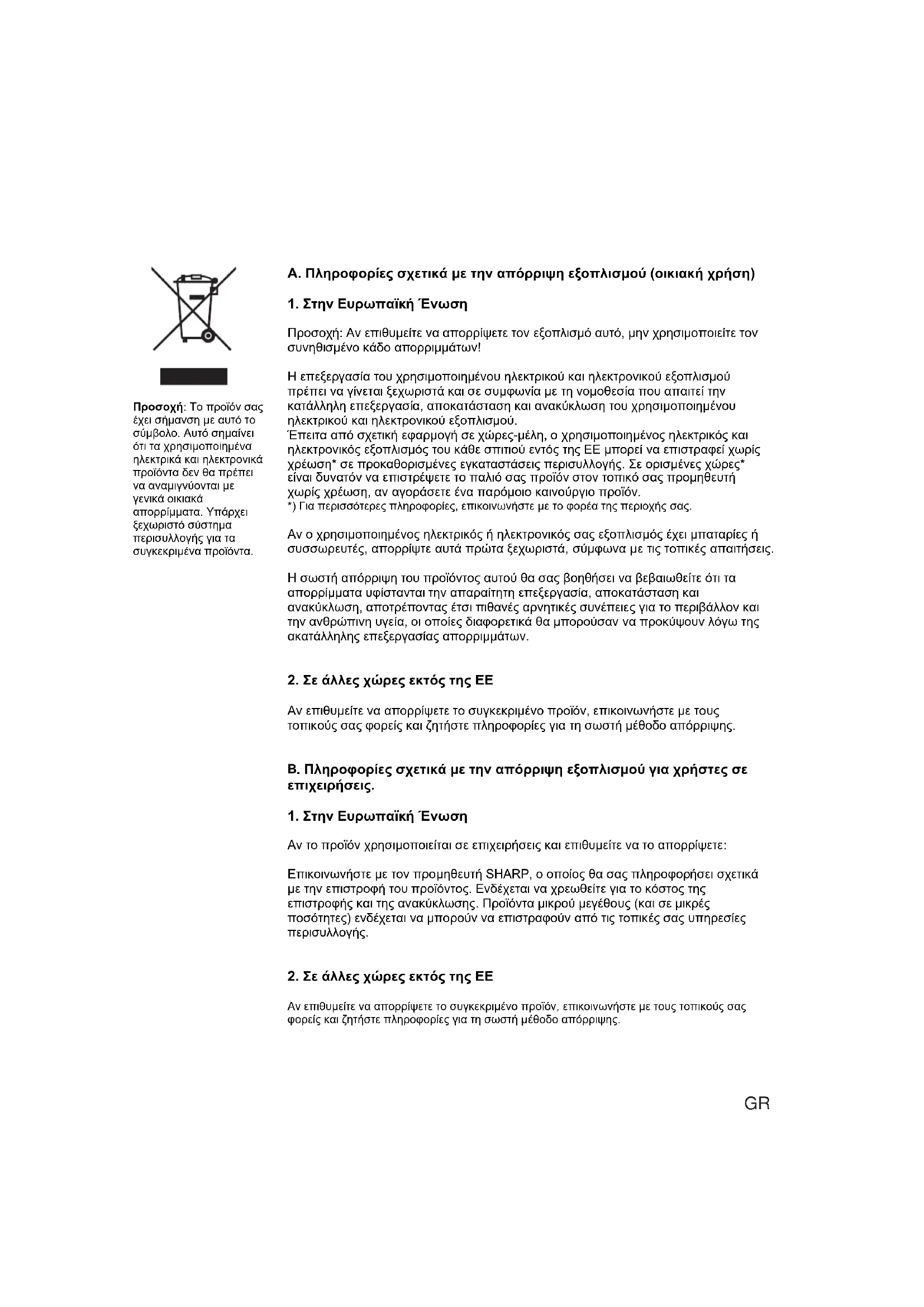 Αν το προϊόν χρησιµοποιείται σε επιχειρήσεις και επιθυµείτε να το απορρίψετε: Επικοινωνήστε µε τον προµηθευτή SHARP, ο οποίος θα σας πληροφορήσει σχετικά µε την επιστροφή του προϊόντος. Ενδέχεται να χρεωθείτε για το κόστος της επιστροφής και της ανακύκλωσης. Προϊόντα µικρού µεγέθους (και σε µικρές ποσότητες) ενδέχεται να µπορούν να επιστραφούν από τις τοπικές σας υπηρεσίες περισυλλογής.