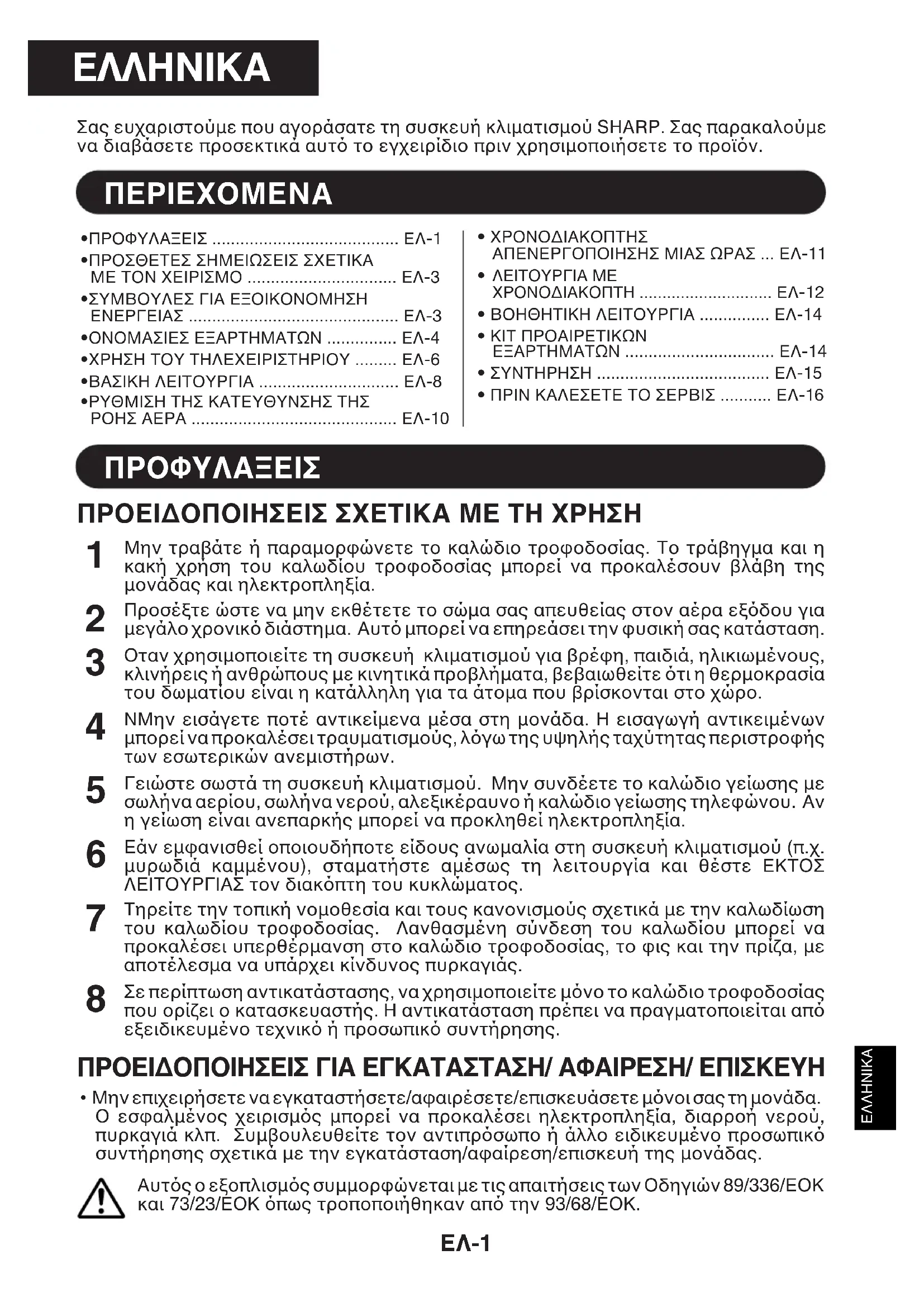 SE A UNIDADE NÃO ARREFECER (OU AQUECER) O QUARTO DEVIDAMENTEΕΛΛΗΝΙΚΑ ΕΛ-1 Σας ευχαριστούµε που αγοράσατε τη συσκευή κλιµατισµού SHARP. Σας παρακαλούµενα διαβάσετε προσεκτικά αυτ το εγχειρίδιο πριν χρησιµοποιήσετε το προϊν.•ΠΡΟΦΥΛΑΞΕΙΣ ........................................ ΕΛ-1•ΠΡΟΣΘΕΤΕΣ ΣΗΜΕΙΩΣΕΙΣ ΣΧΕΤΙΚΑΜΕ ΤΟΝ ΧΕΙΡΙΣΜΟ ................................ ΕΛ-3•ΣΥΜΒΟΥΛΕΣ ΓΙΑ ΕΞΟΙΚΟΝΟΜΗΣΗΕΝΕΡΓΕΙΑΣ ............................................. ΕΛ-3•ΟΝΟΜΑΣΙΕΣ ΕΞΑΡΤΗΜΑΤΩΝ ............... ΕΛ-4•ΧΡΗΣΗ ΤΟΥ ΤΗΛΕΧΕΙΡΙΣΤΗΡΙΟΥ ......... ΕΛ-6•ΒΑΣΙΚΗ ΛΕΙΤΟΥΡΓΙΑ .............................. ΕΛ-8•ΡΥΘΜΙΣΗ ΤΗΣ ΚΑΤΕΥΘΥΝΣΗΣ ΤΗΣΡΟΗΣ ΑΕΡΑ ............................................ ΕΛ-10 ΠΕΡΙΕΧΟΜΕΝΑ