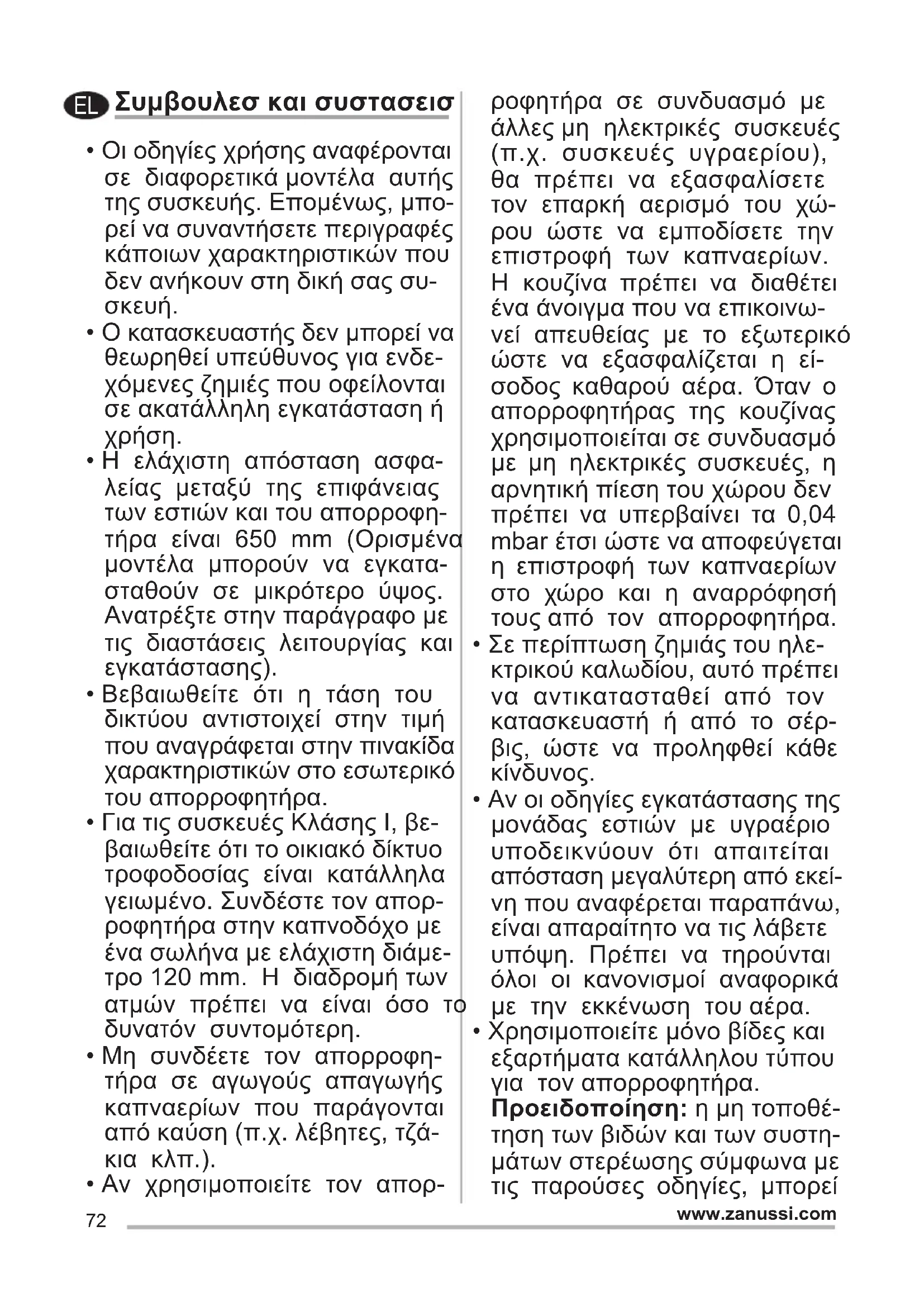 - Χρησιμοποιείτε μόνο βίδες και εξαρτήματα κατάλληλου τύπου για τον απορροφητήρα. Προειδοποίηση: η μη τοποθέ- τηση των βιδών και των συστη- μάτων στερέωσης σύμφωνα με τις παρούσες οδηγίες, μπορεί EL73 www.zanussi.com να προκαλέσει ηλεκτροπληξία.