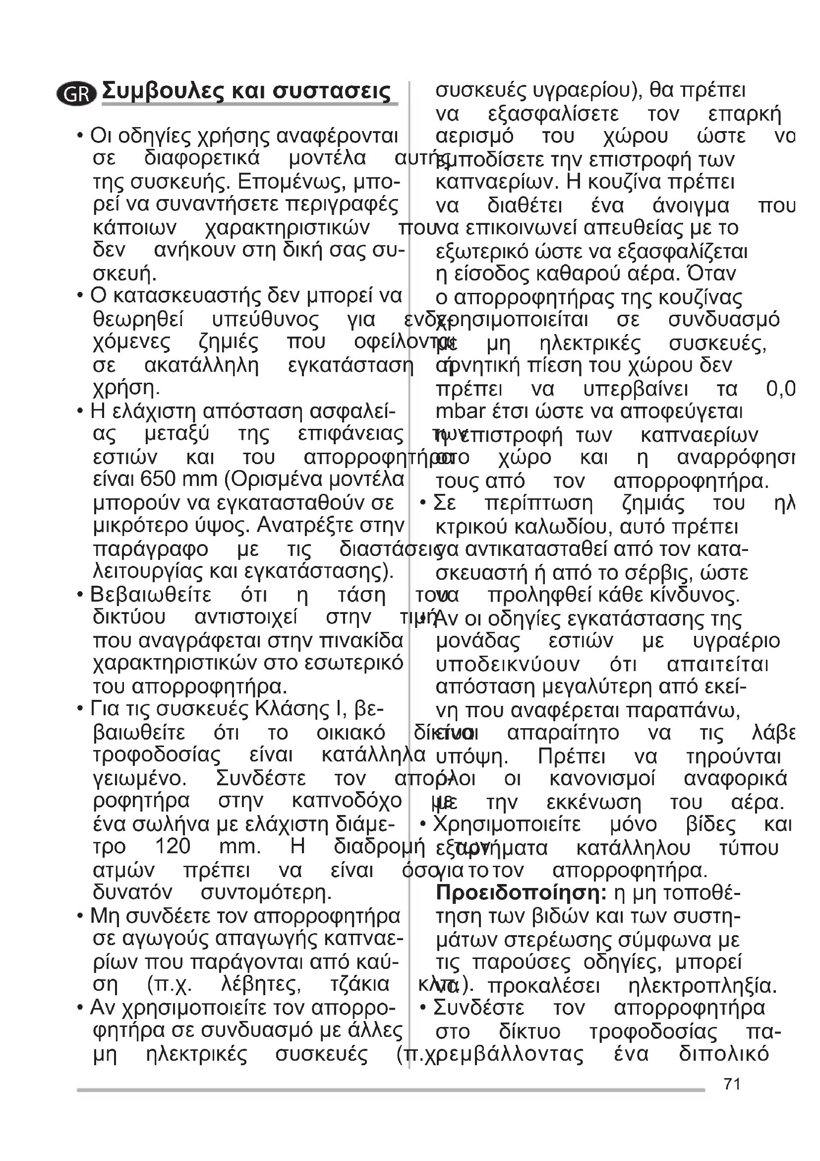 - Συνδέστε τον απορροφητήρα στο δίκτυο τροφοδοσίας πα- ρεμβάλλοντας ένα διπολικό GR72 διακόπτη με άνοιγμα επαφών τουλάχιστον3 mm.