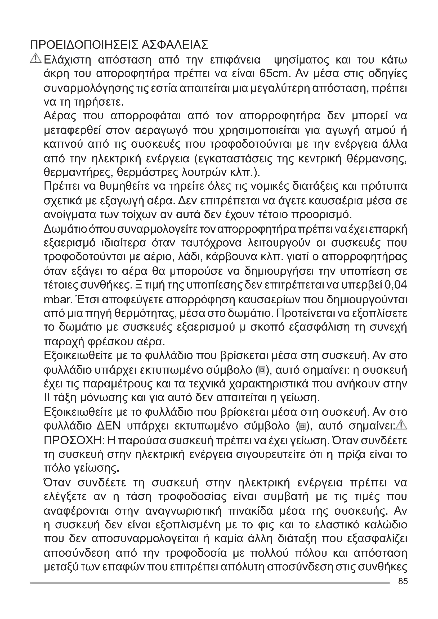 από τις συσκευές που τροφοδοτούνται με την ενέργεια άλλα από την ηλεκτρική ενέργεια (εγκαταστάσεις της κεντρική θέρμανσης, θερμαντήρες, θερμάστρες λουτρών κλπ.). Πρέπει να θυμηθείτε να τηρείτε όλες τις νομικές διατάξεις και πρότυπα σχετικά με εξαγωγή αέρα. Δεν επιτρέπεται να άγετε καυσαέρια μέσα σε ανοίγματα των τοίχων αν αυτά δεν έχουν τέτοιο προορισμό. Δωμάτιο όπου συναρμολογείτε τον απορροφητήρα πρέπει να έχει επαρκή εξαερισμό ιδιαίτερα όταν ταυτόχρονα λειτουργούν οι συσκευές που τροφοδοτούνται με αέριο, λάδι, κάρβουνα κλπ. γιατί ο απορροφητήρας όταν εξάγει το αέρα θα μπορούσε να δημιουργήσει την υποπίεση σε τέτοιες συνθήκες. Ξ τιμή της υποπίεσης δεν επιτρέπεται να υπερβεί 0,04 mbar. Έτσι αποφεύγετε απορρόφηση καυσαερίων που δημιουργούνται από μια πηγή θερμότητας, μέσα στο δωμάτιο. Προτείνεται να εξοπλίσετε το δωμάτιο με συσκευές εξαερισμού μ σκοπό εξασφάλιση τη συνεχή παροχή φρέσκου αέρα. Εξοικειωθείτε με το φυλλάδιο που βρίσκεται μέσα στη συσκευή. Αν στο φυλλάδιο υπάρχει εκτυπωμένο σύμβολο ( ), αυτό σημαίνει: η συσκευή έχει τις παραμέτρους και τα τεχνικά χαρακτηριστικά που ανήκουν στην ΙΙ τάξη μόνωσης και για αυτό δεν απαιτείται η γείωση. Εξοικειωθείτε με το φυλλάδιο που βρίσκεται μέσα στη συσκευή. Αν στο φυλλάδιο ΔΕΝ υπάρχει εκτυπωμένο σύμβολο ( ), αυτό σημαίνει: ΠΡΟΣΟΧΗ: Η παρούσα συσκευή πρέπει να έχει γείωση. Όταν συνδέετε τη συσκευή στην ηλεκτρική ενέργεια σιγουρευτείτε ότι η πρίζα είναι το πόλο γείωσης. Όταν συνδέετε τη συσκευή στην ηλεκτρική ενέργεια πρέπει να ελέγξετε αν η τάση τροφοδοσίας είναι συμβατή με τις τιμές που αναφέρονται στην αναγνωριστική πινακίδα μέσα της συσκευής. Αν η συσκευή δεν είναι εξοπλισμένη με το φις και το ελαστικό καλώδιο που δεν αποσυναρμολογείται ή καμία άλλη διάταξη που εξασφαλίζει αποσύνδεση από την τροφοδοσία με πολλού πόλου και απόσταση μεταξύ των επαφών που επιτρέπει απόλυτη αποσύνδεση στις συνθήκες86 της ΙΙΙ κατηγορία βραχυκυκλώματος, τότε πρέπει να χρησιμοποιείτε μια διάταξη που διαχωρίζει τη συσκευή από το ηλεκτρικό δίκτυο. Αν η συσκευή είναι εξοπλισμένη με το φις και το καλώδιο τροφοδοσίας, τοποθετήστε τη συσκευή έτσι ώστε το φις έχει εύκολή πρόσβαση. Πριν αν αρχίσετε οποιαδήποτε εργασία καθαρισμού ή συντήρησης, πρέπει να απενεργοποιήσετε τη συσκευή και να βγάλετε το φις από την πρίζα. Εάν το καλώδιο τροφοδοσίας έχει υποστεί φθορά, πρέπει να αντικατασταθεί από τον κατασκευαστή ή από το κέντρο τεχνικής εξυπηρέτησής του ή σε κάθε περίπτωση από ειδικευμένο προσωπικό ώστε να αποφευχθεί κάθε πιθανός κίνδυνος. Προσοχή: Αν δεν εγκαταστήσετε βίδες ή συνδετήρες σύμφωνα με αυτές τις οδηγίες μπορεί να οδηγήσει σε κίνδυνο ηλεκτροπληξίας. Η εγκατάσταση διενεργείται σύμφωνα με τις οδηγίες αυτές και από προσωπικό επαγγελματικά ειδικευμένο. Αποφεύγετε χρήση εύφλεκτων υλικών δίπλα στη συσκευή. Σε περίπτωση φαγητών μην επιτρέψτε τη φλόγα να έχει επαφή με τον απορροφητήρα. Σε περίπτωση που τηγανίζετε σε ένα τηγάνι προσέξτε το λάδι ή το λίπος να μην καούν. Ιδιαίτερα επικίνδυνο είναι το λάδι γιατί είναι πολύ εύφλεκτο. Μην χρησιμοποιείτε ανοιχτές ηλεκτρικές σούβλες. Με σκοπό να αποφύγετε πιθανό κίνδυνο πυρκαγιάς πάντα πρέπει να παρακολουθείτε τις οδηγίες χρήσης όταν καθαρίζετε τα φίλτρα λίπους και όταν αφαιρείτε πιθανές ακαθαρσία από τι λίπος από τη συσκευή. Δεν επιτρέπεται τα πρόσωπα με μ