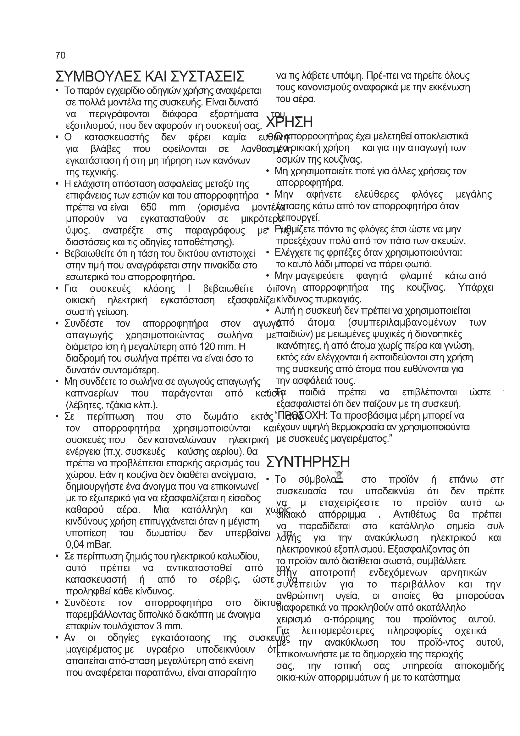 - Το σύµβολο στο προϊόν ή επάνω στη συσκευασία του υποδεικνύει ότι δεν πρέπει να µ εταχειρίζεστε το προϊόν αυτό ως οικιακό απόρριµµα . Αντιθέτως θα πρέπει να παραδίδεται στο κατάλληλο σηµείο συλ- λογής για την ανακύκλωση ηλεκτρικού και ηλεκτρονικούεξοπλισµού.Εξασφαλίζονταςότι τοπροϊόναυτόδιατίθεταισωστά,συµβάλλετε στην αποτροπή ενδεχόµενων αρνητικών συνεπειών για το περιβάλλον και την ανθρώπινη υγεία, οι οποίες θα µπορούσαν διαφορετικάναπροκληθούναπόακατάλληλο χειρισµό α-πόρριψης του προϊόντος αυτού. Για λεπτοµερέστερες πληροφορίες σχετικά µε την ανακύκλωση του προϊό-ντος αυτού, επικοινωνήστεµετοδηµαρχείοτηςπεριοχής σας, την τοπική σας υπηρεσία αποκοµιδής οικια-κώναπορριµµάτωνήµετοκατάστηµα71 όπουαγοράσατετοπροϊόν.• Πριναπόοποιαδήποτεεπέμβασησυντήρησης,αποσυνδέστετοναπορροφητήραβγάζονταςτοφιςαπότηνπρίζαήγυρνώνταςτογενικόδιακόπτη.• Ησυντήρησητωνφίλτρωνπρέπειναεκτελείταισχολαστικά και έγκαιρα στα ενδεδειγμέναχρονικάδιαστήματα(Κίνδυνοςπυρκαγιάς). - Hδενμπορούνναπλυθούν,αλλάθαπρέπεινααντικαθίσταταικάθεδύομήνες