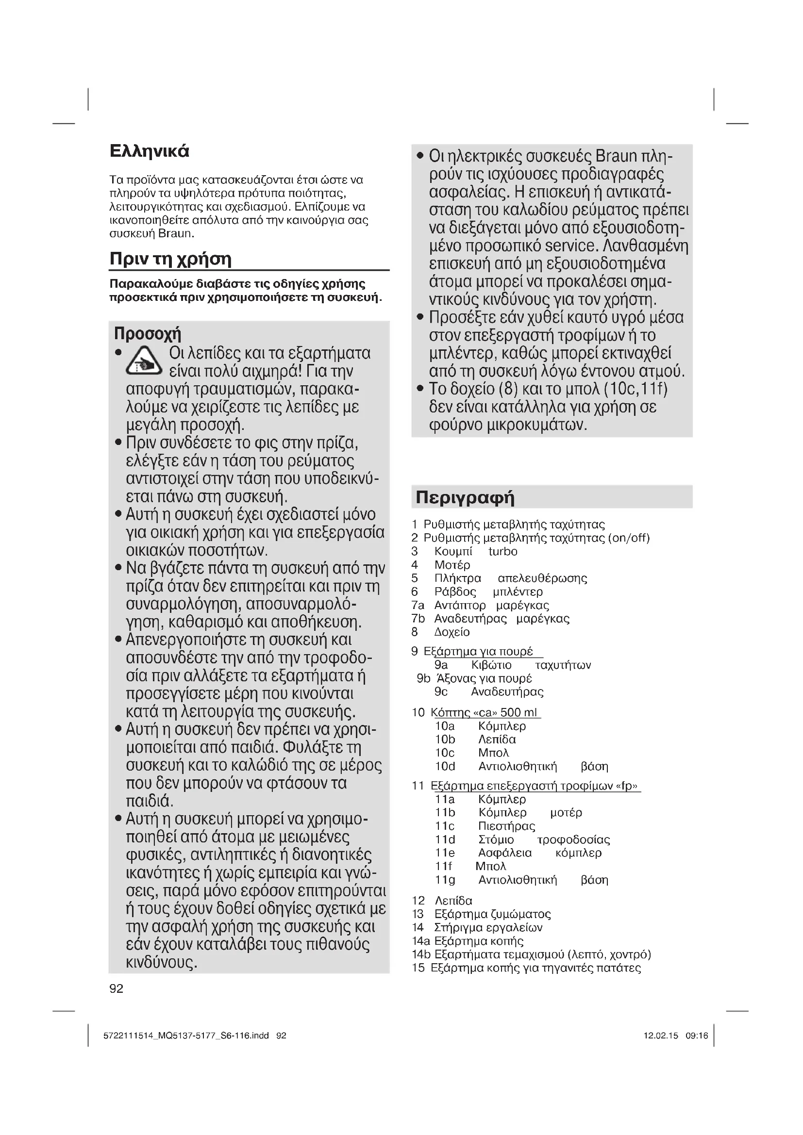 1 Ρυθμιστής μεταβλητής ταχύτητας 2 Ρυθμιστής μεταβλητής ταχύτητας (on/off) 3 Κουμπί turbo 4 Μοτέρ 5 Πλήκτρα απελευθέρωσης 6 Ράβδος μπλέντερ 7a Αντάπτορ μαρέγκας 7b Αναδευτήρας μαρέγκας 8 Δοχείο 9 Eξάρτημα για πουρέ 9a Κιβώτιο ταχυτήτων 9b Άξονας για πουρέ 9c Αναδευτήρας 10 Κόπτης «ca» 500 ml 10a Κόμπλερ 10b Λεπίδα 10c Μπολ 10d Αντιολισθητική βάση 11 Εξάρτημα επεξεργαστή τροφίμων «fp» 11a Κόμπλερ 11b Κόμπλερ μοτέρ 11c Πιεστήρας 11d Στόμιο τροφοδοσίας 11e Ασφάλεια κόμπλερ 11f Μπολ 11g Αντιολισθητική βάση 12 Λεπίδα 13 Εξάρτημα ζυμώματος 14 Στήριγμα εργαλείων 14a Εξάρτημα κοπής 14b Εξαρτήματα τεμαχισμού (λεπτό, χοντρό) 15 Εξάρτημα κοπής για τηγανιτές πατάτες 5722111514_MQ5137-5177_S6-116.indd 925722111514_MQ5137-5177_S6-116.indd 92 12.02.15 09:1612.02.15 09:1693 Παρακαλούμε καθαρίστε όλα τα εξαρτήματα πριν τα χρησιμοποιήσετε για πρώτη φορά (δείτε παράγραφο «Καθαρισμός» / δελ. C). Ρύθμιση της ταχύτητας Όταν ενεργοποιείτε το κουμπί μεταβλητής ταχύτητας (2), η ταχύτητα επεξεργασίας αντιστοιχεί στη ρύθμιση του ρυθμιστή μεταβλητής ταχύτητας. Όσο πιο υψηλή είναι η ρύθμιση, τόσο πιο γρήγορα γίνεται η κοπή. Μπορείτε να ρυθμίσετε την ταχύτητα εύκολα κατά τη διάρκεια της λειτουργίας στρέφοντας το ρυθμιστή ταχύτητας χρησιμοποιώντας τον αντίχειρα ή το δείκτη σας. Ωστόσο, η μέγιστη ταχύτητα επεξεργασίας μπορεί μόνο να επιτευχθεί πιέζοντας το κουμπί turbo (3). Μπορείτε επίσης να χρησιμοποιήσετε το κουμπί turbo για στιγμιαία δυνατή λειτουργία χωρίς να πρέπει να χειριστείτε το ρυθμιστή ταχύτητας. Μπλέντερ χειρός (A) Το μπλέντερ χειρός είναι απόλυτα κατάλληλο για την παρασκευή ντιπ, σάλτσας, σούπας, μαγιονέζας και παιδικής τροφής καθώς επίσης και για την ανάμειξη ποτών και μιλκ σέικ.