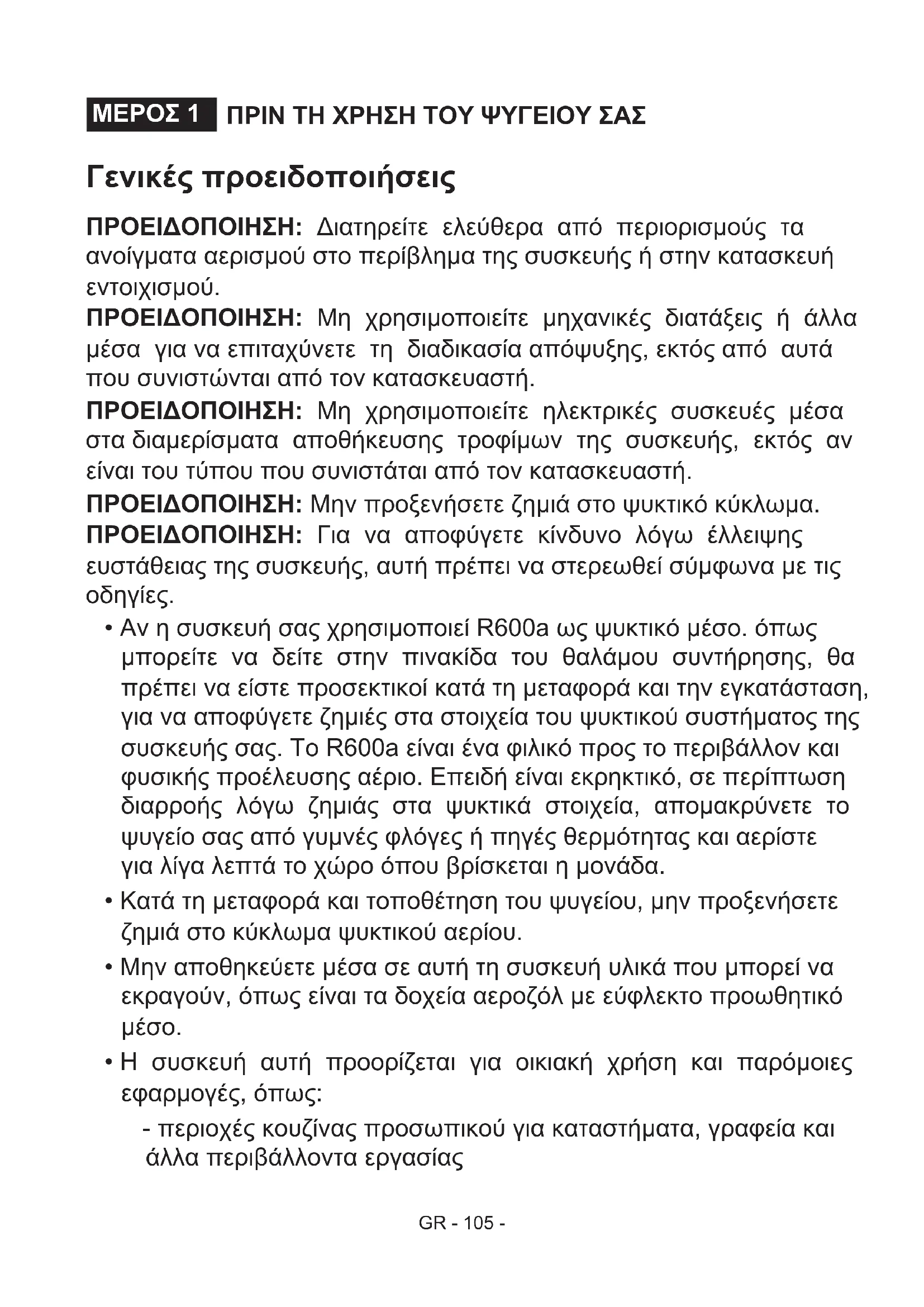Προτάσεις για Εξοικονόμηση ενέργειας ...................................................138 ΜΕΡΗ ΚΑΙ ΕΞΑΡΤΗΜΑΤΑ ΤΟΥ ΨΥΓΕΙΟΥ ΣΑΣ ................................... 139GR - 105 - ΠΡΙΝ ΤΗ ΧΡΗΣΗ ΤΟΥ ΨΥΓΕΙΟΥ ΣΑΣ ΜΕΡΟΣ 1 Γενικές προειδοποιήσεις ΠΡΟΕΙΔΟΠΟΙΗΣΗ: Διατηρείτε ελεύθερα από περιορισμούς τα ανοίγματα αερισμού στο περίβλημα της συσκευής ή στην κατασκευή εντοιχισμού. ΠΡΟΕΙΔΟΠΟΙΗΣΗ: Μη χρησιμοποιείτε μηχανικές διατάξεις ή άλλα μέσα για να επιταχύνετε τη διαδικασία απόψυξης, εκτός από αυτά που συνιστώνται από τον κατασκευαστή. ΠΡΟΕΙΔΟΠΟΙΗΣΗ: Μη χρησιμοποιείτε ηλεκτρικές συσκευές μέσα στα διαμερίσματα αποθήκευσης τροφίμων της συσκευής, εκτός αν είναι του τύπου που συνιστάται από τον κατασκευαστή. ΠΡΟΕΙΔΟΠΟΙΗΣΗ: Μην προξενήσετε ζημιά στο ψυκτικό κύκλωμα. ΠΡΟΕΙΔΟΠΟΙΗΣΗ: Για να αποφύγετε κίνδυνο λόγω έλλειψης ευστάθειας της συσκευής, αυτή πρέπει να στερεωθεί σύμφωνα με τις