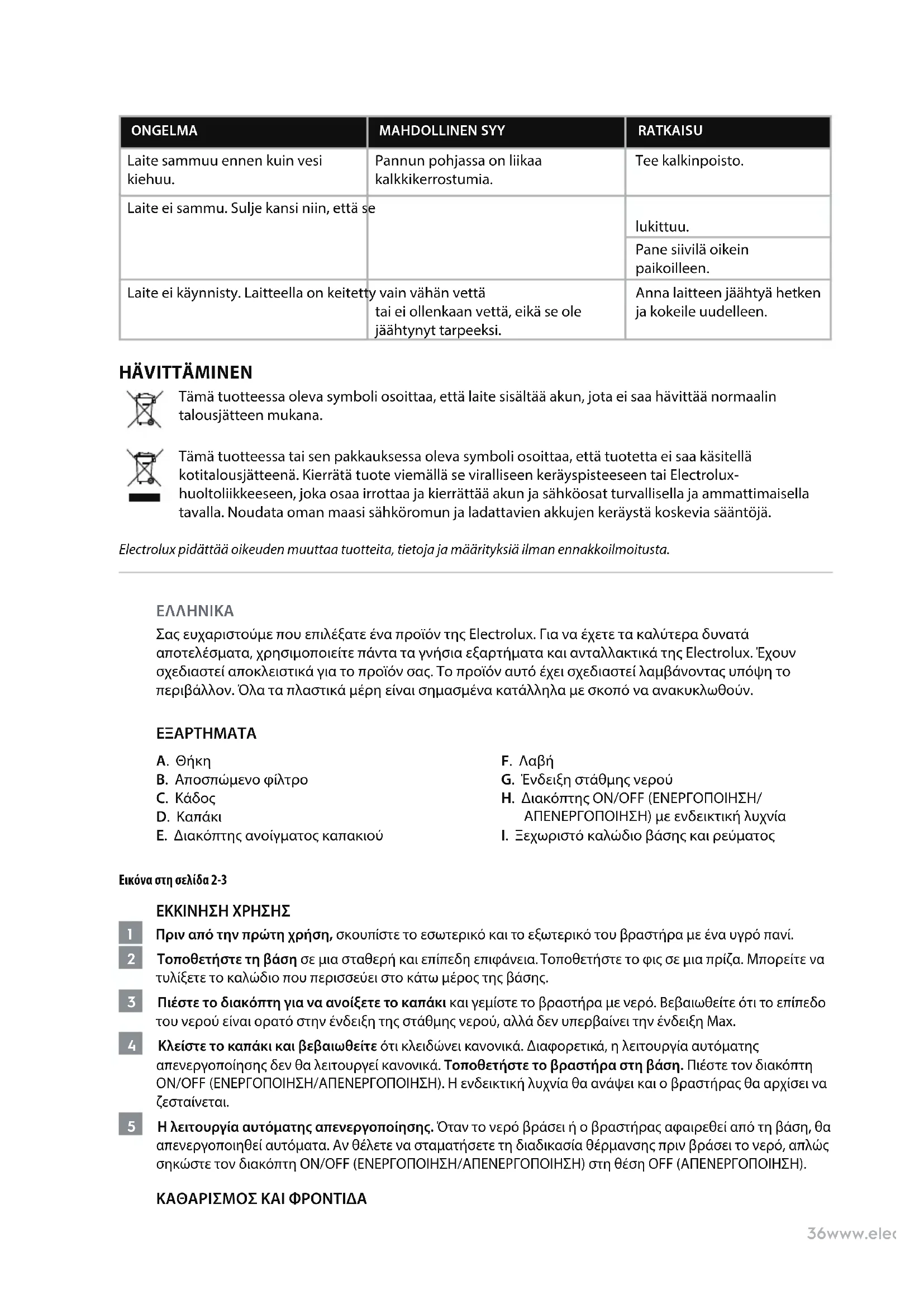 Σaç ευχαριστούμε που επλέξατε εva προίον της Electrolux. Γιαν αχετε τα καλύτερα δυνατά anotéλέσμata, χροιμοποίeite πάντα τα γνήσια εξαρτήμata και ανταλλακτικά της Electrolux. 'Exouv σχεδιασεί απολεισικόγια το προίον σας. To προίον auto éχει σχεδιασεί λαμβανοντac unóψητο περιβάλλον. Oλa τα πλασικό μέρη εναι Μημασύνενa καταλληλα με σκοπόν ανακukλωθούν.