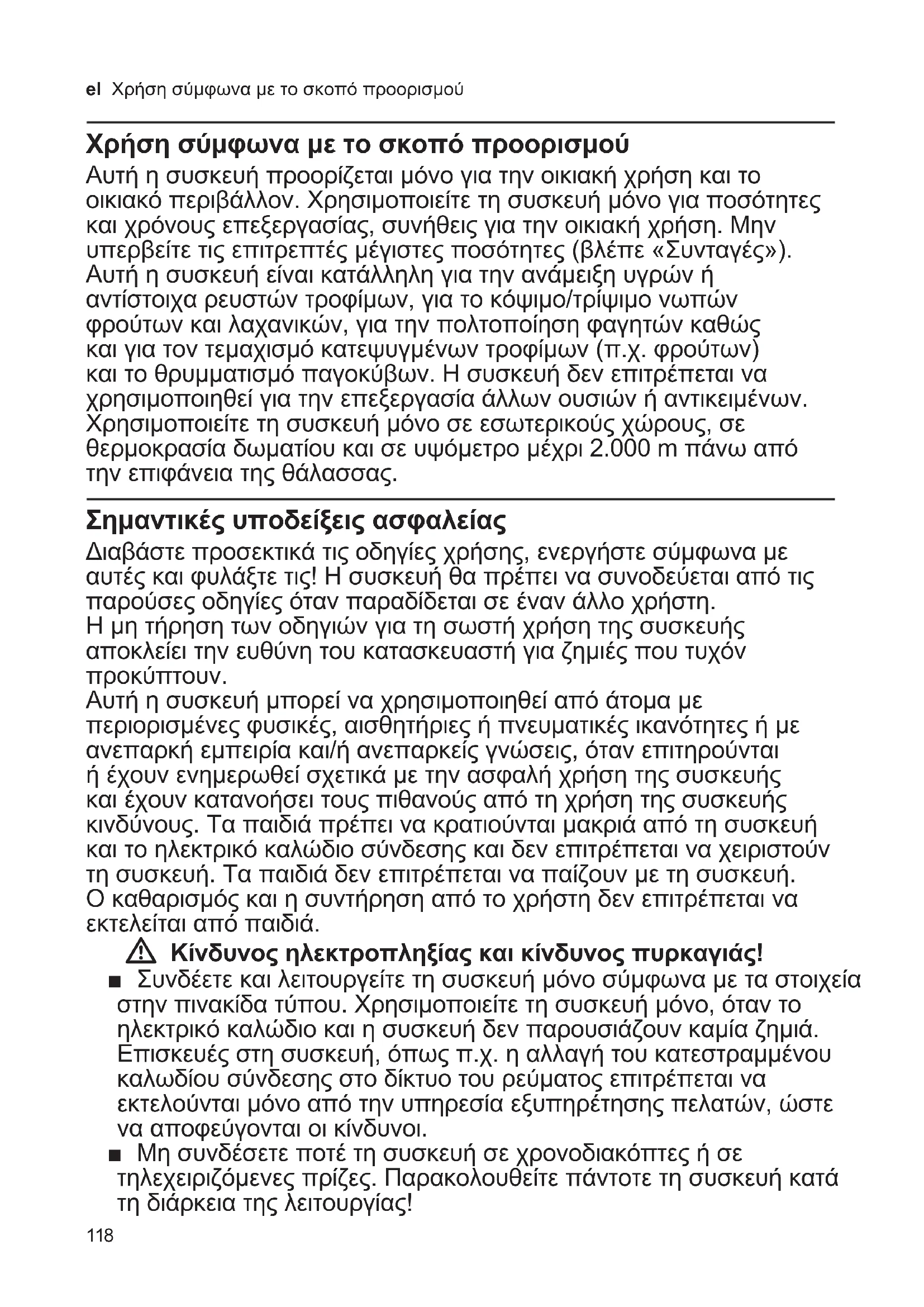 entanto, necessária a apresentação do documento de compra do aparelho. Salvo alterações técnicas.118 el Χρήση σύμφωνα με το σκοπό προορισμού Χρήση σύμφωνα με το σκοπό προορισμού Αυτή η συσκευή προορίζεται μόνο για την οικιακή χρήση και το οικιακό περιβάλλον. Χρησιμοποιείτε τη συσκευή μόνο για ποσότητες και χρόνους επεξεργασίας, συνήθεις για την οικιακή χρήση. Μην υπερβείτε τις επιτρεπτές μέγιστες ποσότητες (βλέπε «Συνταγές»). Αυτή η συσκευή είναι κατάλληλη για την ανάμειξη υγρών ή αντίστοιχα ρευστών τροφίμων, για το κόψιμο/τρίψιμο νωπών φρούτων και λαχανικών, για την πολτοποίηση φαγητών καθώς και για τον τεμαχισμό κατεψυγμένων τροφίμων (π.χ. φρούτων) και το θρυμματισμό παγοκύβων. Η συσκευή δεν επιτρέπεται να χρησιμοποιηθεί για την επεξεργασία άλλων ουσιών ή αντικειμένων. Χρησιμοποιείτε τη συσκευή μόνο σε εσωτερικούς χώρους, σε θερμοκρασία δωματίου και σε υψόμετρο μέχρι 2.000 m πάνω από την επιφάνεια της θάλασσας. Σημαντικές υποδείξεις ασφαλείας Διαβάστε προσεκτικά τις οδηγίες χρήσης, ενεργήστε σύμφωνα με αυτές και φυλάξτε τις! Η συσκευή θα πρέπει να συνοδεύεται από τις παρούσες οδηγίες όταν παραδίδεται σε έναν άλλο χρήστη. Η μη τήρηση των οδηγιών για τη σωστή χρήση της συσκευής αποκλείει την ευθύνη του κατασκευαστή για ζημιές που τυχόν προκύπτουν. Αυτή η συσκευή μπορεί να χρησιμοποιηθεί από άτομα με περιορισμένες φυσικές, αισθητήριες ή πνευματικές ικανότητες ή με ανεπαρκή εμπειρία και/ή ανεπαρκείς γνώσεις, όταν επιτηρούνται ή έχουν ενημερωθεί σχετικά με την ασφαλή χρήση της συσκευής και έχουν κατανοήσει τους πιθανούς από τη χρήση της συσκευής κινδύνους. Τα παιδιά πρέπει να κρατιούνται μακριά από τη συσκευή και το ηλεκτρικό καλώδιο σύνδεσης και δεν επιτρέπεται να χειριστούν τη συσκευή. Τα παιδιά δεν επιτρέπεται να παίζουν με τη συσκευή. Ο καθαρισμός και η συντήρηση από το χρήστη δεν επιτρέπεται να εκτελείται από παιδιά. W Κίνδυνος ηλεκτροπληξίας και κίνδυνος πυρκαγιάς! ■ Συνδέετε και λειτουργείτε τη συσκευή μόνο σύμφωνα με τα στοιχεία στην πινακίδα τύπου. Χρησιμοποιείτε τη συσκευή μόνο, όταν το ηλεκτρικό καλώδιο και η συσκευή δεν παρουσιάζουν καμία ζημιά. Επισκευές στη συσκευή, όπως π.χ. η αλλαγή του κατεστραμμένου καλωδίου σύνδεσης στο δίκτυο του ρεύματος επιτρέπεται να εκτελούνται μόνο από την υπηρεσία εξυπηρέτησης πελατών, ώστε να αποφεύγονται οι κίνδυνοι. ■ Μη συνδέσετε ποτέ τη συσκευή σε χρονοδιακόπτες ή σε τηλεχειριζόμενες πρίζες. Παρακολουθείτε πάντοτε τη συσκευή κατά τη διάρκεια της λειτουργίας!119