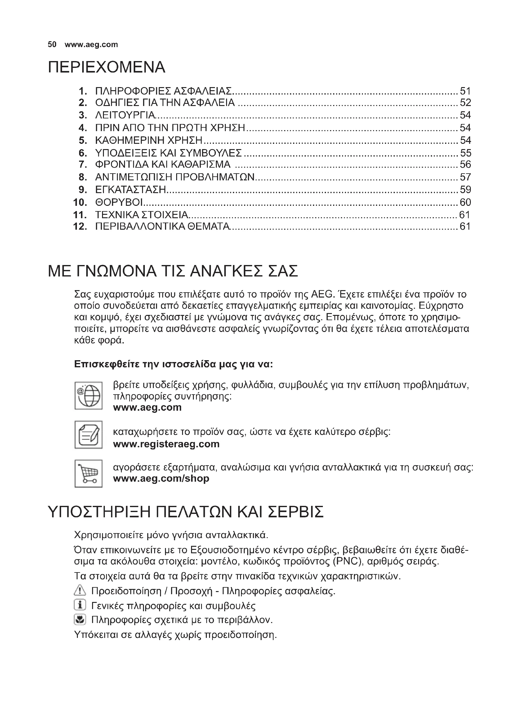 Επισκεφθείτε την ιστοσελίδα μας για να: βρείτε υποδείξεις χρήσης, φυλλάδια, συμβουλές για την επίλυση προβλημάτων, πληροφορίες συντήρησης: www.aeg.com καταχωρήσετε το προϊόν σας, ώστε να έχετε καλύτερο σέρβις: www.registeraeg.com αγοράσετε εξαρτήματα, αναλώσιμα και γνήσια ανταλλακτικά για τη συσκευή σας: www.aeg.com/shop ΥΠΟΣΤΗΡΙΞΗ ΠΕΛΑΤΩΝ ΚΑΙ ΣΕΡΒΙΣ Χρησιμοποιείτε μόνο γνήσια ανταλλακτικά. Όταν επικοινωνείτε με το Εξουσιοδοτημένο κέντρο σέρβις, βεβαιωθείτε ότι έχετε διαθέ- σιμα τα ακόλουθα στοιχεία: μοντέλο, κωδικός προϊόντος (PNC), αριθμός σειράς. Τα στοιχεία αυτά θα τα βρείτε στην πινακίδα τεχνικών χαρακτηριστικών. Προειδοποίηση / Προσοχή - Πληροφορίες ασφαλείας. Γενικές πληροφορίες και συμβουλές Πληροφορίες σχετικά με το περιβάλλον. Υπόκειται σε αλλαγές χωρίς προειδοποίηση. ΠΕΡΙΕΧΟΜΕΝΑ