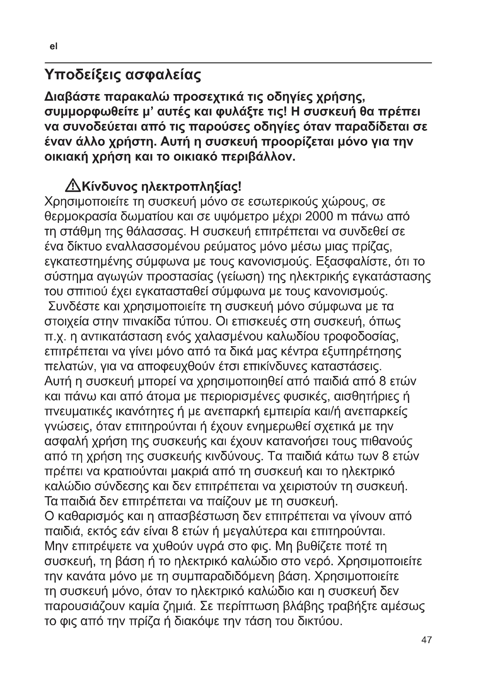 Υποδείξεις ασφαλείας Διαβάστε παρακαλώ προσεχτικά τις οδηγίες χρήσης, συμμορφωθείτε μ’ αυτές και φυλάξτε τις! Η συσκευή θα πρέπει να συνοδεύεται από τις παρούσες οδηγίες όταν παραδίδεται σε έναν άλλο χρήστη. Αυτή η συσκευή προορίζεται μόνο για την οικιακή χρήση και το οικιακό περιβάλλον. WΚίνδυνος ηλεκτροπληξίας! Χρησιμοποιείτε τη συσκευή μόνο σε εσωτερικούς χώρους, σε θερμοκρασία δωματίου και σε υψόμετρο μέχρι 2000 m πάνω από τη στάθμη της θάλασσας. Η συσκευή επιτρέπεται να συνδεθεί σε ένα δίκτυο εναλλασσομένου ρεύματος μόνο μέσω μιας πρίζας, εγκατεστημένης σύμφωνα με τους κανονισμούς. Εξασφαλίστε, ότι το σύστημα αγωγών προστασίας (γείωση) της ηλεκτρικής εγκατάστασης του σπιτιού έχει εγκατασταθεί σύμφωνα με τους κανονισμούς. Συνδέστε και χρησιμοποιείτε τη συσκευή μόνο σύμφωνα με τα στοιχεία στην πινακίδα τύπου. Οι επισκευές στη συσκευή, όπως π.χ. η αντικατάσταση ενός χαλασμένου καλωδίου τροφοδοσίας, επιτρέπεται να γίνει μόνο από τα δικά μας κέντρα εξυπηρέτησης πελατών, για να αποφευχθούν έτσι επικίνδυνες καταστάσεις. Αυτή η συσκευή μπορεί να χρησιμοποιηθεί από παιδιά από 8 ετών και πάνω και από άτομα με περιορισμένες φυσικές, αισθητήριες ή πνευματικές ικανότητες ή με ανεπαρκή εμπειρία και/ή ανεπαρκείς γνώσεις, όταν επιτηρούνται ή έχουν ενημερωθεί σχετικά με την ασφαλή χρήση της συσκευής και έχουν κατανοήσει τους πιθανούς από τη χρήση της συσκευής κινδύνους. Τα παιδιά κάτω των 8 ετών πρέπει να κρατιούνται μακριά από τη συσκευή και το ηλεκτρικό καλώδιο σύνδεσης και δεν επιτρέπεται να χειριστούν τη συσκευή. Τα παιδιά δεν επιτρέπεται να παίζουν με τη συσκευή. Ο καθαρισμός και η απασβέστωση δεν επιτρέπεται να γίνουν από παιδιά, εκτός εάν είναι 8 ετών ή μεγαλύτερα και επιτηρούνται. Μην επιτρέψετε να χυθούν υγρά στο φις. Μη βυθίζετε ποτέ τη συσκευή, τη βάση ή το ηλεκτρικό καλώδιο στο νερό. Χρησιμοποιείτε την κανάτα μόνο με τη συμπαραδιδόμενη βάση. Χρησιμοποιείτε τη συσκευή μόνο, όταν το ηλεκτρικό καλώδιο και η συσκευή δεν παρουσιάζουν καμία ζημιά. Σε περίπτωση βλάβης τραβήξτε αμέσως το φις από την πρίζα ή διακόψε την τάση του δικτύου.48