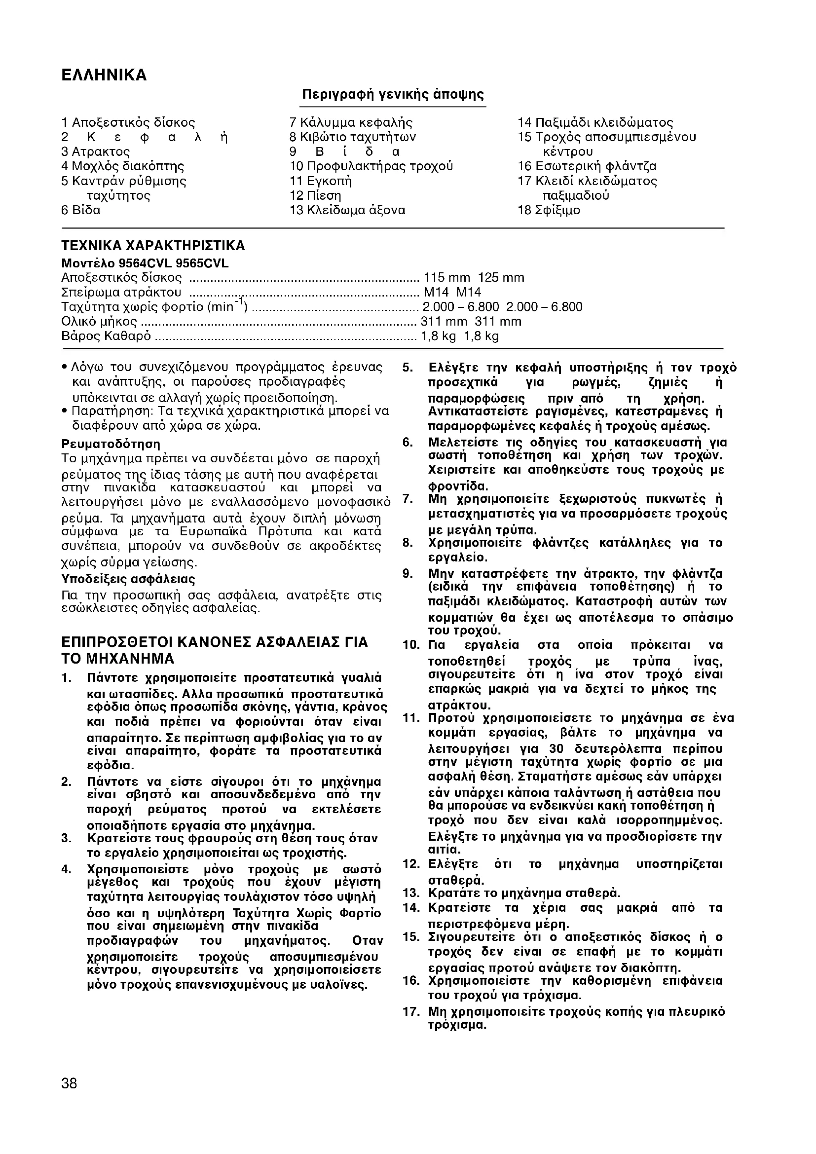 18 Σφίξιµο ΤΕΧΝΙΚΑ ΧΑΡΑΚΤΗΡΙΣΤΙΚΑ Μοντέλο 9564CVL 9565CVL Αποξεστικς δίσκος .................................................................. 115 mm 125 mm Σπείρωµα ατράκτου .................................................................. M14 M14 Ταχύτητα χωρίς φορτίο (min
