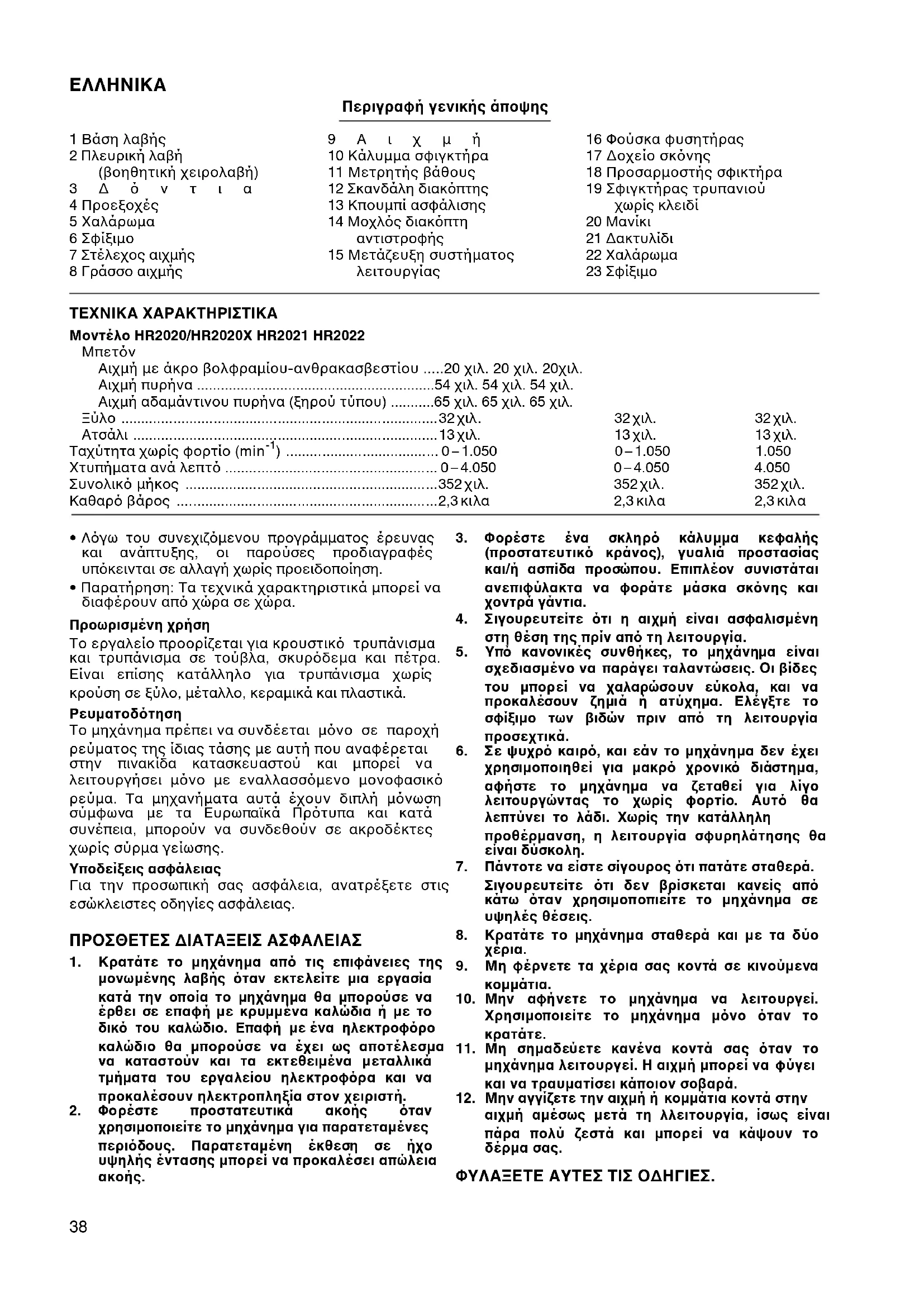 Περιγραφή γενικής άποψης 1 Βάση λαβής 2 Πλευρική λαβή (βοηθητική χειρολαβή) 3∆ντια 4 Προεξοχές 5 Χαλάρωµα 6 Σφίξιµο 7 Στέλεχος αιχµής 8 Γράσσο αιχµής 9Αιχµή 10 Κάλυµµα σφιγκτήρα 11 Μετρητής βάθους 12 Σκανδάλη διακπτης 13 Κπουµπί ασφάλισης 14 Μοχλς διακπτη αντιστροφής 15 Μετάζευξη συστήµατος λειτουργίας 16 Φούσκα φυσητήρας 17 ∆οχείο σκνης 18 Προσαρµοστής σφικτήρα 19 Σφιγκτήρας τρυπανιού χωρίς κλειδί 20 Μανίκι 21 ∆ακτυλίδι 22 Χαλάρωµα 23 Σφίξιµο ΤΕΧΝΙΚΑ ΧΑΡΑΚΤΗΡΙΣΤΙΚΑ Μοντέλο HR2020/HR2020X HR2021 HR2022