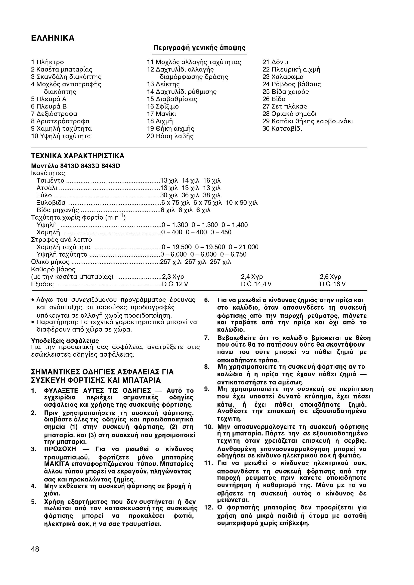 5 Πλευρά Α 6 Πλευρά Β 7 ∆εξιστροφα 8 Αριστερστροφα 9 Χαµηλή ταχύτητα 10 Υψηλή ταχύτητα 11 Μοχλς αλλαγής ταχύτητας 12 ∆αχτυλίδι αλλαγής διαµρφωσης δράσης 13 ∆είκτης 14 ∆αχτυλίδι ρύθµισης 15 ∆ιαβαθµίσεις 16 Σφίξιµο 17 Μανίκι 18 Αιχµή 19 Θήκη αιχµής 20 Βάση λαβής 21 ∆ντι 22 Πλευρική αιχµή 23 Χαλάρωµα 24 Ράβδος βάθους 25 Βίδα χειρς 26 Βίδα 27 Σετ πλάκας 28 Οριακ σηµάδι 29 Καπάκι θήκης καρβουνάκι 30 Κατσαβίδι ΤΕΧΝΙΚΑ ΧΑΡΑΚΤΗΡΙΣΤΙΚΑ Μοντέλο 8413D 8433D 8443D