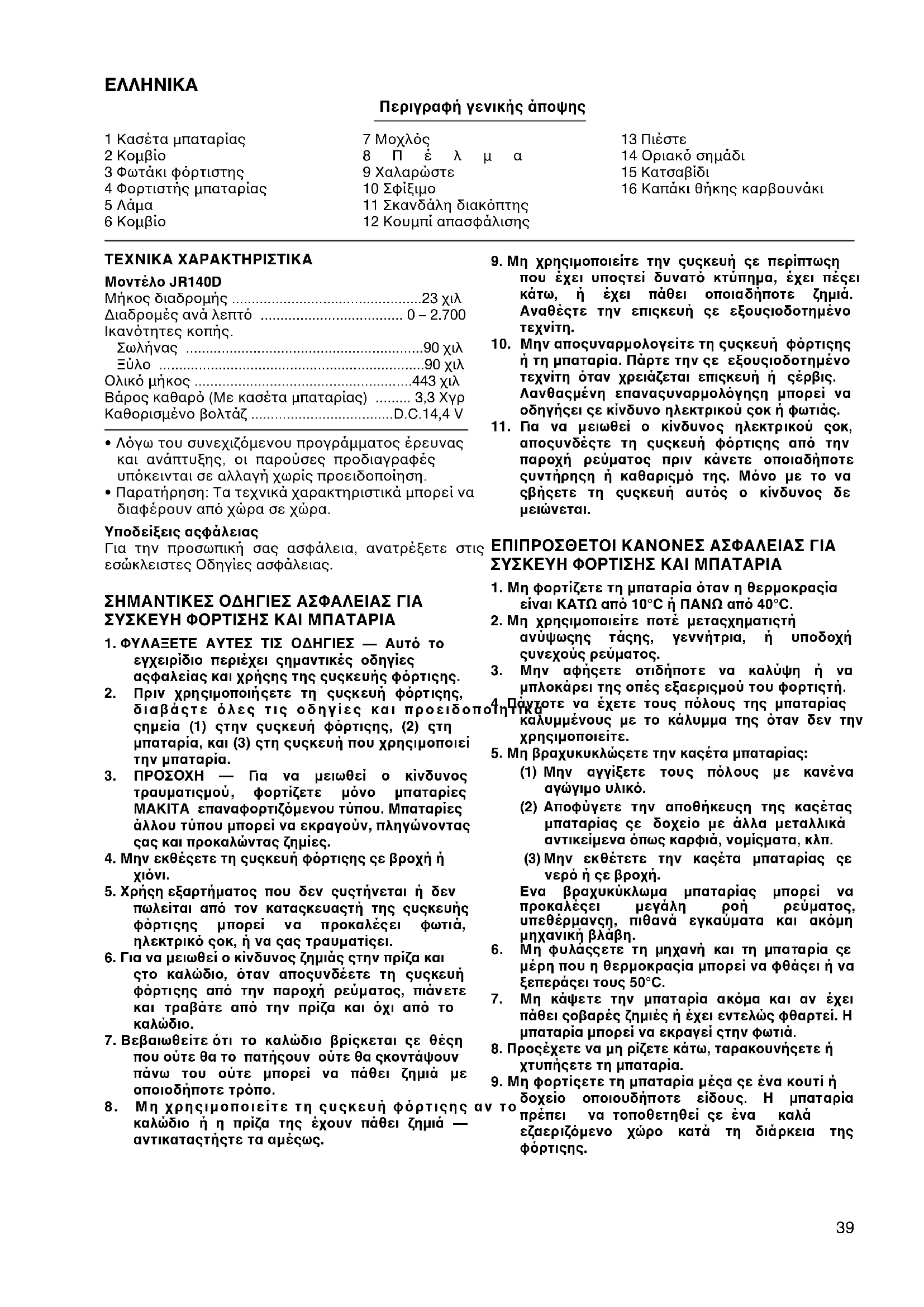 Περιγραφή γενικήσ άποψησ 1 Κασέτα µπαταρίας 2 Κοµβίο 3 Φωτάκι φρτιστης 4 Φορτιστής µπαταρίας 5 Λάµα 6 Κοµβίο 7 Μοχλς 8Πέλµα 9 Χαλαρώστε 10 Σφίξιµο 11 Σκανδάλη διακπτης 12 Κουµπί απασφάλισης 13 Πιέστε 14 Οριακ σηµάδι 15 Κατσαβίδι 16 Καπάκι θήκης καρβουνάκι ΤΕΧΝΙΚΑ ΧΑΡΑΚΤΗΡΙΣΤΙΚΑ Μοντέλο JR140D Μήκος διαδροµής ................................................23 χιλ ∆ιαδροµές ανά λεπτ .................................... 0 – 2.700 Ικαντητες κοπής. Σωλήνας ............................................................90 χιλ Ξύλο ...................................................................90 χιλ Ολικ µήκος .......................................................443 χιλ Βάρος καθαρ (Με κασέτα µπαταρίας) ......... 3,3 Χγρ Καθορισµένο βολτάζ ....................................D.C.14,4 V