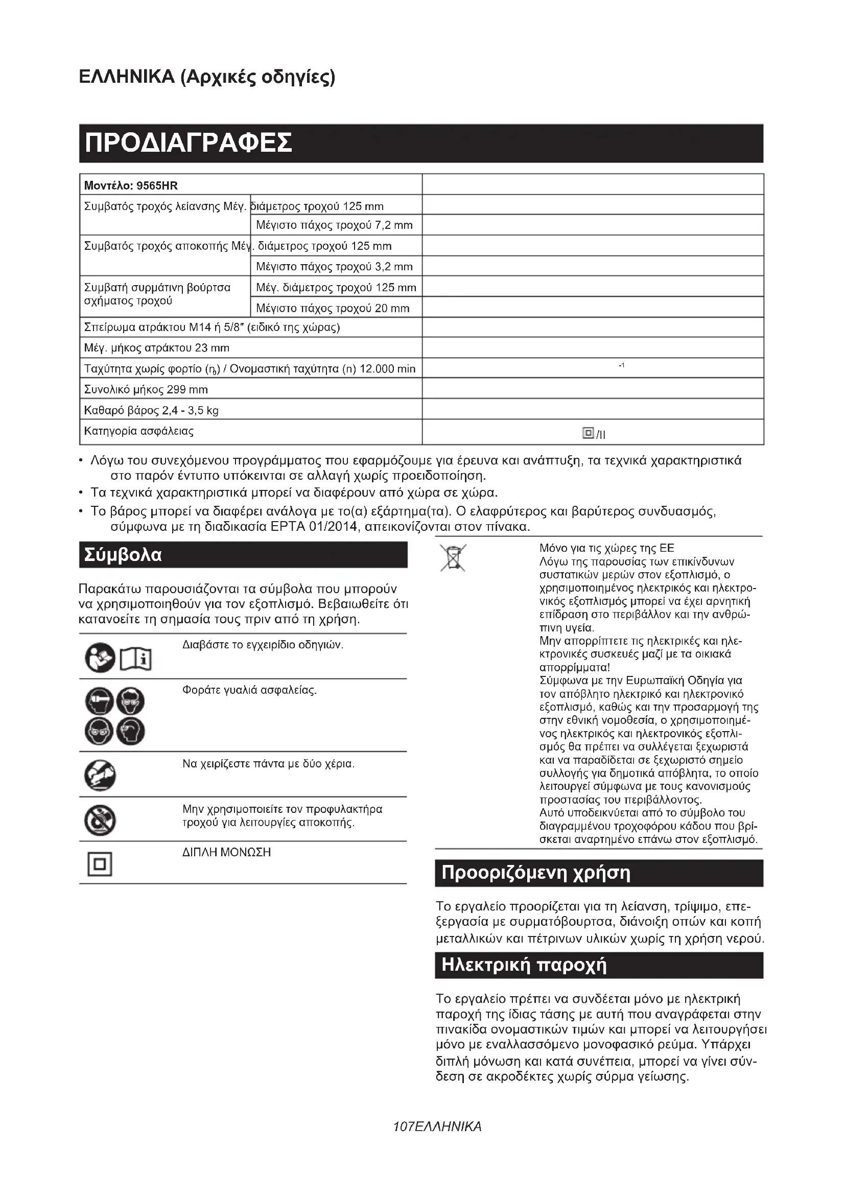 Παρακάτω παρουσιάζονται τα σύμβολα που μπορούν να χρησιμοποιηθούν για τον εξοπλισμό. Βεβαιωθείτε ότι κατανοείτε τη σημασία τους πριν από τη χρήση. Διαβάστε το εγχειρίδιο οδηγιών. Φοράτε γυαλιά ασφαλείας. Να χειρίζεστε πάντα με δύο χέρια. Μην χρησιμοποιείτε τον προφυλακτήρα τροχού για λειτουργίες αποκοπής. ΔΙΠΛΗ ΜΟΝΩΣΗ Μόνο για τις χώρες της ΕΕ Λόγω της παρουσίας των επικίνδυνων συστατικών μερών στον εξοπλισμό, ο χρησιμοποιημένος ηλεκτρικός και ηλεκτρο- νικός εξοπλισμός μπορεί να έχει αρνητική επίδραση στο περιβάλλον και την ανθρώ- πινη υγεία. Μην απορρίπτετε τις ηλεκτρικές και ηλε- κτρονικές συσκευές μαζί με τα οικιακά απορρίμματα! Σύμφωνα με την Ευρωπαϊκή Οδηγία για τον απόβλητο ηλεκτρικό και ηλεκτρονικό εξοπλισμό, καθώς και την προσαρμογή της στην εθνική νομοθεσία, ο χρησιμοποιημέ- νος ηλεκτρικός και ηλεκτρονικός εξοπλι- σμός θα πρέπει να συλλέγεται ξεχωριστά και να παραδίδεται σε ξεχωριστό σημείο συλλογής για δημοτικά απόβλητα, το οποίο λειτουργεί σύμφωνα με τους κανονισμούς προστασίας του περιβάλλοντος. Αυτό υποδεικνύεται από το σύμβολο του διαγραμμένου τροχοφόρου κάδου που βρί- σκεται αναρτημένο επάνω στον εξοπλισμό. Προοριζόμενη χρήση Το εργαλείο προορίζεται για τη λείανση, τρίψιμο, επε- ξεργασία με συρματόβουρτσα, διάνοιξη οπών και κοπή μεταλλικών και πέτρινων υλικών χωρίς τη χρήση νερού. Ηλεκτρική παροχή Το εργαλείο πρέπει να συνδέεται μόνο με ηλεκτρική παροχή της ίδιας τάσης με αυτή που αναγράφεται στην πινακίδα ονομαστικών τιμών και μπορεί να λειτουργήσει μόνο με εναλλασσόμενο μονοφασικό ρεύμα. Υπάρχει διπλή μόνωση και κατά συνέπεια, μπορεί να γίνει σύν- δεση σε ακροδέκτες χωρίς σύρμα γείωσης.108 ΕΛΛΗΝΙΚΑ