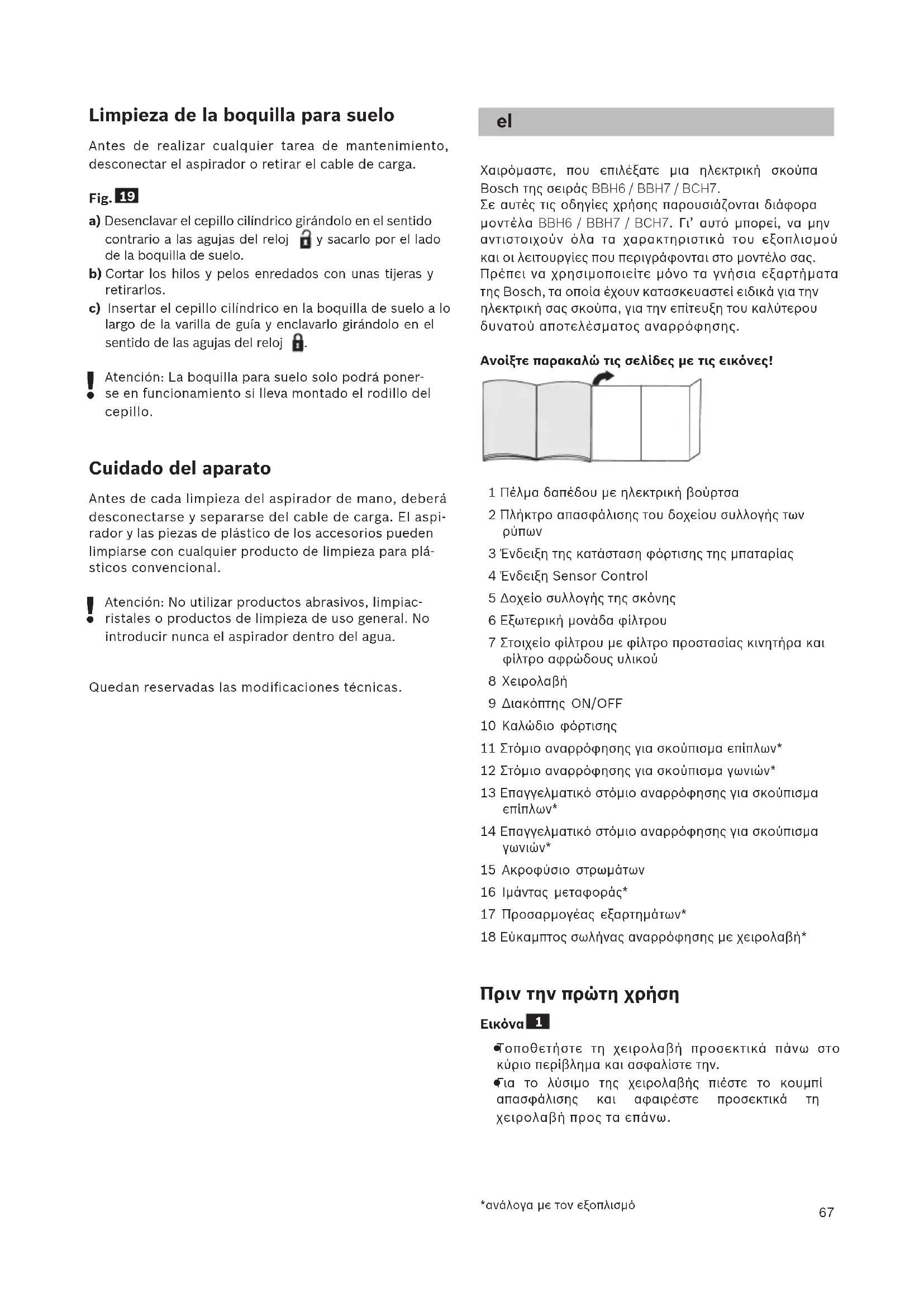 Atención: No utilizar productos abrasivos, limpiac- ristales o productos de limpieza de uso general. No introducir nunca el aspirador dentro del agua. Quedan reservadas las modificaciones técnicas. Χαιρόμαστε, που επιλέξατε μια ηλεκτρική σκούπα Bosch της σειράς BBH6 / BBH7 / BCH7. Σε αυτές τις οδηγίες χρήσης παρουσιάζονται διάφορα μοντέλα BBH6 / BBH7 / BCH7. Γι’ αυτό μπορεί, να μην αντιστοιχούν όλα τα χαρακτηριστικά του εξοπλισμού και οι λειτουργίες που περιγράφονται στο μοντέλο σας. Πρέπει να χρησιμοποιείτε μόνο τα γνήσια εξαρτήματα της Bosch, τα οποία έχουν κατασκευαστεί ειδικά για την ηλεκτρική σας σκούπα, για την επίτευξη του καλύτερου δυνατού αποτελέσματος αναρρόφησης. Ανοίξτε παρακαλώ τις σελίδες με τις εικόνες! 1 Πέλμα δαπέδου με ηλεκτρική βούρτσα 2 Πλήκτρο απασφάλισης του δοχείου συλλογής των