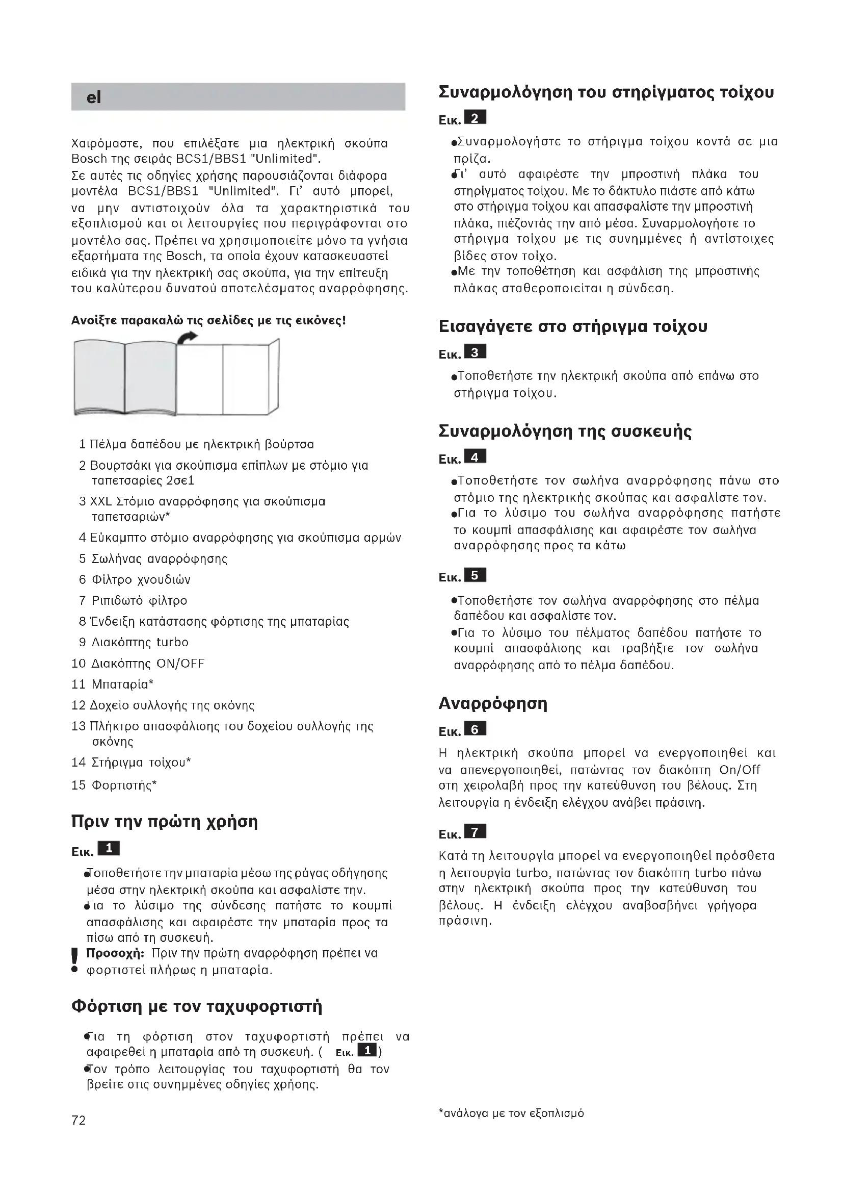 14 Στήριγμα τοίχου* 15 Φορτιστής* Πριν την πρώτη χρήση