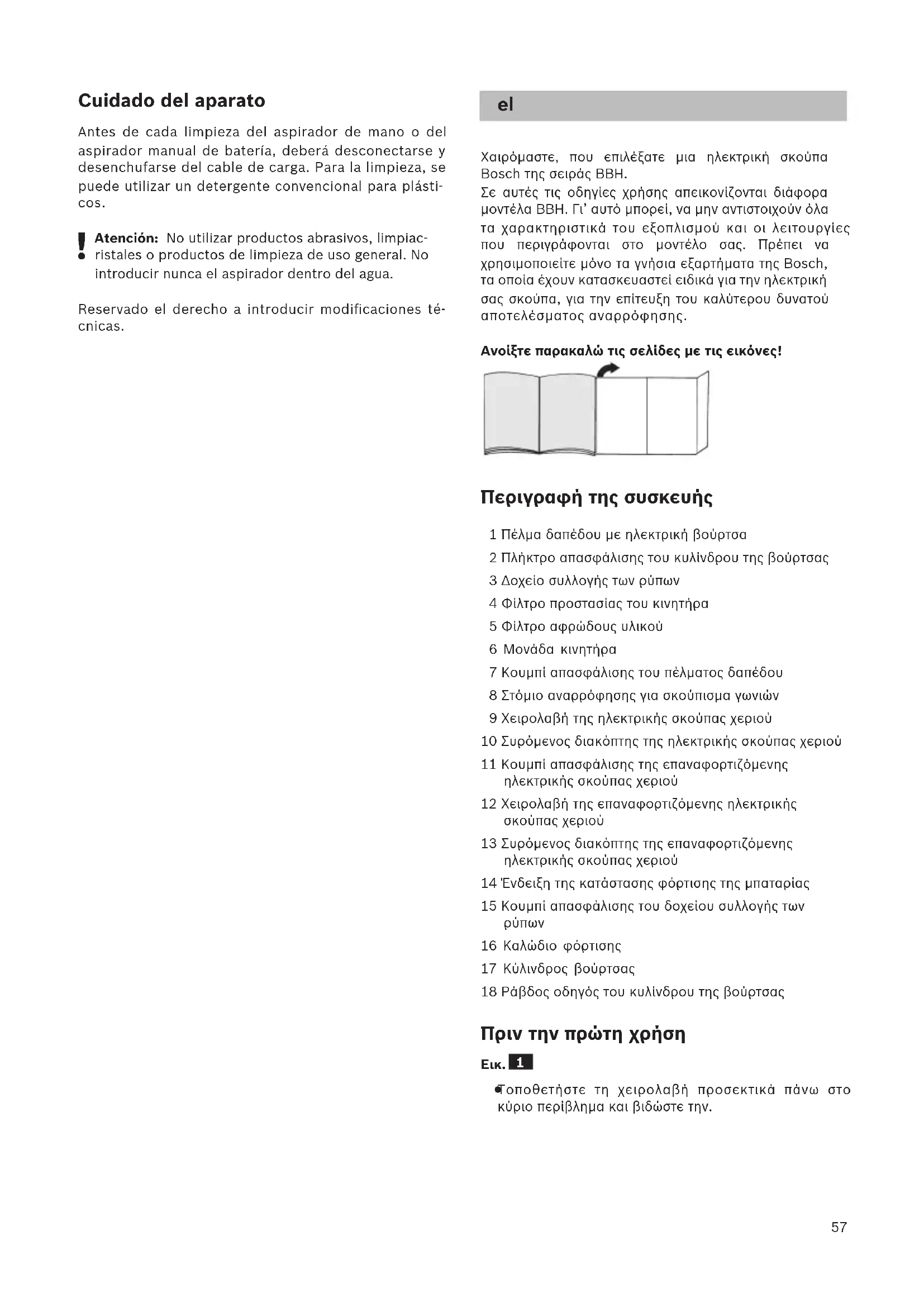 Χαιρόμαστε, που επιλέξατε μια ηλεκτρική σκούπα Bosch της σειράς BBH. Σε αυτές τις οδηγίες χρήσης απεικονίζονται διάφορα μοντέλα BBH. Γι’ αυτό μπορεί, να μην αντιστοιχούν όλα τα χαρακτηριστικά του εξοπλισμού και οι λειτουργίες που περιγράφονται στο μοντέλο σας. Πρέπει να χρησιμοποιείτε μόνο τα γνήσια εξαρτήματα της Bosch, τα οποία έχουν κατασκευαστεί ειδικά για την ηλεκτρική σας σκούπα, για την επίτευξη του καλύτερου δυνατού αποτελέσματος αναρρόφησης. Ανοίξτε παρακαλώ τις σελίδες με τις εικόνες! Περιγραφή της συσκευής 1 Πέλμα δαπέδου με ηλεκτρική βούρτσα 2 Πλήκτρο απασφάλισης του κυλίνδρου της βούρτσας 3 Δοχείο συλλογής των ρύπων 4 Φίλτρο προστασίας του κινητήρα 5 Φίλτρο αφρώδους υλικού 6 Μονάδα κινητήρα 7 Κουμπί απασφάλισης του πέλματος δαπέδου 8 Στόμιο αναρρόφησης για σκούπισμα γωνιών 9 Χειρολαβή της ηλεκτρικής σκούπας χεριού 10 Συρόμενος διακόπτης της ηλεκτρικής σκούπας χεριού 11 Κουμπί απασφάλισης της επαναφορτιζόμενης ηλεκτρικής σκούπας χεριού 12 Χειρολαβή της επαναφορτιζόμενης ηλεκτρικής σκούπας χεριού 13 Συρόμενος διακόπτης της επαναφορτιζόμενης ηλεκτρικής σκούπας χεριού 14 Ένδειξη της κατάστασης φόρτισης της μπαταρίας 15 Κουμπί απασφάλισης του δοχείου συλλογής των