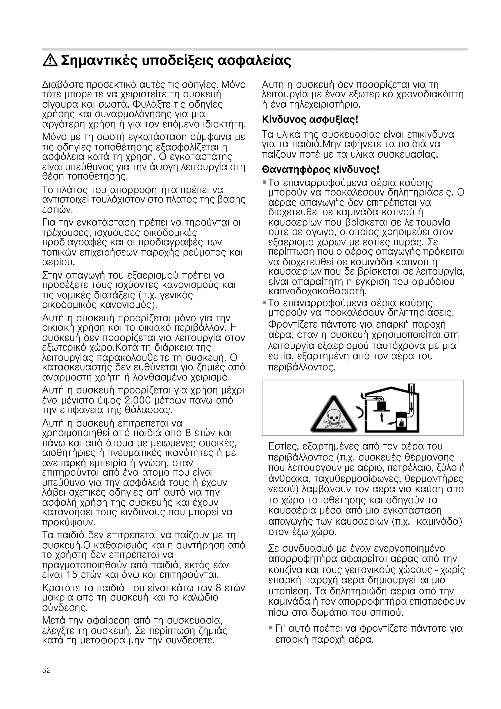 Τα επαναρροφούμενα αέρια καύσης μπορούν να προκαλέσουν δηλητηριάσεις. Φροντίζετε πάντοτε για επαρκή παροχή αέρα, όταν η συσκευή χρησιμοποιείται στη λειτουργία εξαερισμού ταυτόχρονα με μια εστία, εξαρτημένη από τον αέρα του περιβάλλοντος. Εστίες, εξαρτημένες από τον αέρα του περιβάλλοντος (π.χ. συσκευές θέρμανσης που λειτουργούν με αέριο, πετρέλαιο, ξύλο ή άνθρακα, ταχυθερμοσίφωνες, θερμαντήρες νερού) λαμβάνουν τον αέρα για καύση από το χώρο τοποθέτησης και οδηγούν τα καυσαέρια μέσα από μια εγκατάσταση απαγωγής των καυσαερίων (π.χ. καμινάδα) στον έξω χώρο. Σε συνδυασμό με έναν ενεργοποιημένο απορροφητήρα αφαιρείται αέρας από την κουζίνα και τους γειτονικούς χώρους - χωρίς επαρκή παροχή αέρα δημιουργείται μια υποπίεση. Τα δηλητηριώδη αέρια από την καμινάδα ή τον απορροφητήρα επιστρέφουν πίσω στα δωμάτια του σπιτιού.