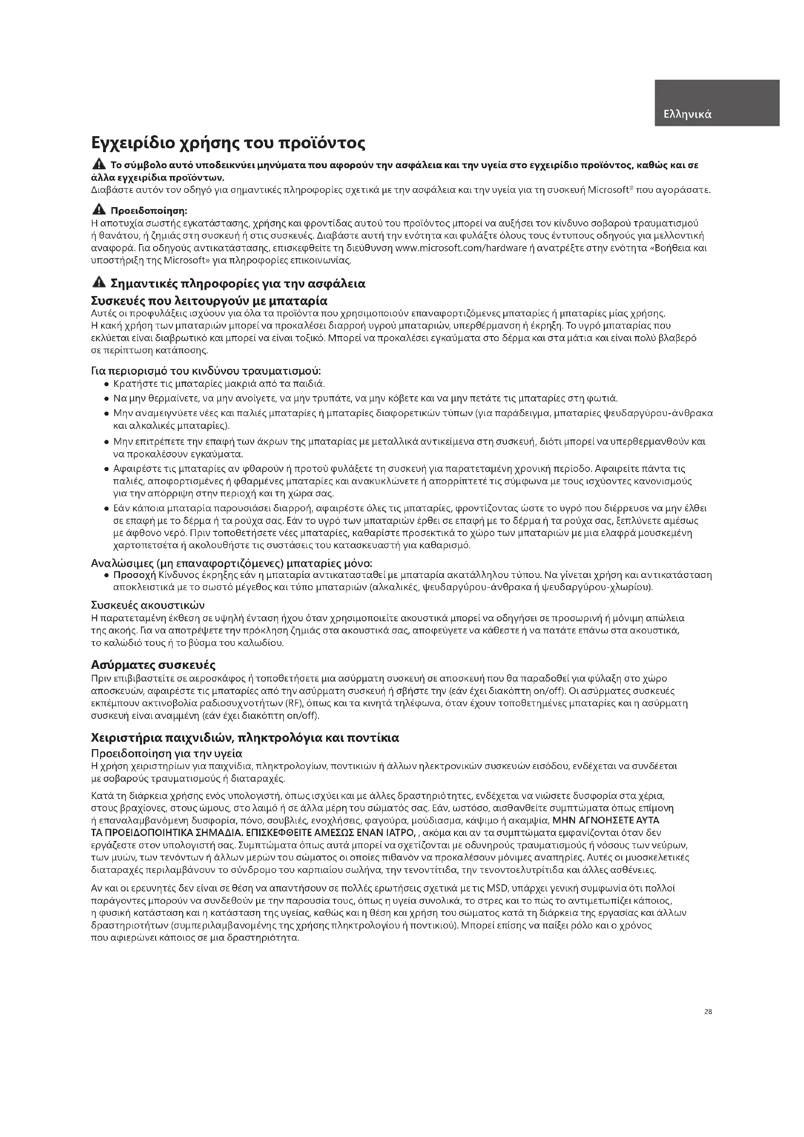 που αγοράσατε. Προειδοποίηση: Η αποτυχία σωστής εγκατάστασης, χρήσης και φροντίδας αυτού του προϊόντος μπορεί να αυξήσει τον κίνδυνο σοβαρού τραυματισμού ή θανάτου, ή ζημιάς στη συσκευή ή στις συσκευές. Διαβάστε αυτή την ενότητα και φυλάξτε όλους τους έντυπους οδηγούς για μελλοντική αναφορά. Για οδηγούς αντικατάστασης, επισκεφθείτε τη διεύθυνση www.microsoft.com/hardware ή ανατρέξτε στην ενότητα «Βοήθεια και υποστήριξη της Microsoft» για πληροφορίες επικοινωνίας. Σημαντικές πληροφορίες για την ασφάλεια Συσκευές που λειτουργούν με μπαταρία Αυτές οι προφυλάξεις ισχύουν για όλα τα προϊόντα που χρησιμοποιούν επαναφορτιζόμενες μπαταρίες ή μπαταρίες μίας χρήσης. Η κακή χρήση των μπαταριών μπορεί να προκαλέσει διαρροή υγρού μπαταριών, υπερθέρμανση ή έκρηξη. Το υγρό μπαταρίας που εκλύεται είναι διαβρωτικό και μπορεί να είναι τοξικό. Μπορεί να προκαλέσει εγκαύματα στο δέρμα και στα μάτια και είναι πολύ βλαβερό σε περίπτωση κατάποσης. Για περιορισμό του κινδύνου τραυματισμού: ●Κρατήστε τις μπαταρίες μακριά από τα παιδιά. ●Να μην θερμαίνετε, να μην ανοίγετε, να μην τρυπάτε, να μην κόβετε και να μην πετάτε τις μπαταρίες στη φωτιά. ●Μην αναμειγνύετε νέες και παλιές μπαταρίες ή μπαταρίες διαφορετικών τύπων (για παράδειγμα, μπαταρίες ψευδαργύρου-άνθρακα και αλκαλικές μπαταρίες). ●Μην επιτρέπετε την επαφή των άκρων της μπαταρίας με μεταλλικά αντικείμενα στη συσκευή, διότι μπορεί να υπερθερμανθούν και να προκαλέσουν εγκαύματα. ●Αφαιρέστε τις μπαταρίες αν φθαρούν ή προτού φυλάξετε τη συσκευή για παρατεταμένη χρονική περίοδο. Αφαιρείτε πάντα τις παλιές, αποφορτισμένες ή φθαρμένες μπαταρίες και ανακυκλώνετε ή απορρίπτετέ τις σύμφωνα με τους ισχύοντες κανονισμούς για την απόρριψη στην περιοχή και τη χώρα σας. ●Εάν κάποια μπαταρία παρουσιάσει διαρροή, αφαιρέστε όλες τις μπαταρίες, φροντίζοντας ώστε το υγρό που διέρρευσε να μην έλθει σε επαφή με το δέρμα ή τα ρούχα σας. Εάν το υγρό των μπαταριών έρθει σε επαφή με το δέρμα ή τα ρούχα σας, ξεπλύνετε αμέσως με άφθονο νερό. Πριν τοποθετήσετε νέες μπαταρίες, καθαρίστε προσεκτικά το χώρο των μπαταριών με μια ελαφρά μουσκεμένη χαρτοπετσέτα ή ακολουθήστε τις συστάσεις του κατασκευαστή για καθαρισμό. Αναλώσιμες (μη επαναφορτιζόμενες) μπαταρίες μόνο: ● Προσοχή Κίνδυνος έκρηξης εάν η μπαταρία αντικατασταθεί με μπαταρία ακατάλληλου τύπου. Να γίνεται χρήση και αντικατάσταση αποκλειστικά με το σωστό μέγεθος και τύπο μπαταριών (αλκαλικές, ψευδαργύρου-άνθρακα ή ψευδαργύρου-χλωρίου). Συσκευές ακουστικών Η παρατεταμένη έκθεση σε υψηλή ένταση ήχου όταν χρησιμοποιείτε ακουστικά μπορεί να οδηγήσει σε προσωρινή ή μόνιμη απώλεια της ακοής. Για να αποτρέψετε την πρόκληση ζημιάς στα ακουστικά σας, αποφεύγετε να κάθεστε ή να πατάτε επάνω στα ακουστικά, το καλώδιό τους ή το βύσμα του καλωδίου. Ασύρματες συσκευές Πριν επιβιβαστείτε σε αεροσκάφος ή τοποθετήσετε μια ασύρματη συσκευή σε αποσκευή που θα παραδοθεί για φύλαξη στο χώρο αποσκευών, αφαιρέστε τις μπαταρίες από την ασύρματη συσκευή ή σβήστε την (εάν έχει διακόπτη on/off). Οι ασύρματες συσκευές εκπέμπουν ακτινοβολία ραδιοσυχνοτήτων (RF), όπως και τα κινητά τηλέφωνα, όταν έχουν τοποθετημένες μπαταρίες και η ασύρματη συσκευή είναι αναμμένη (εάν έχει διακόπτη on/off). Χειριστήρια παιχνιδιών, πληκτρολόγια και ποντίκια Προειδοποίηση για την υγεία Η χρήση χειριστηρίων για παιχ