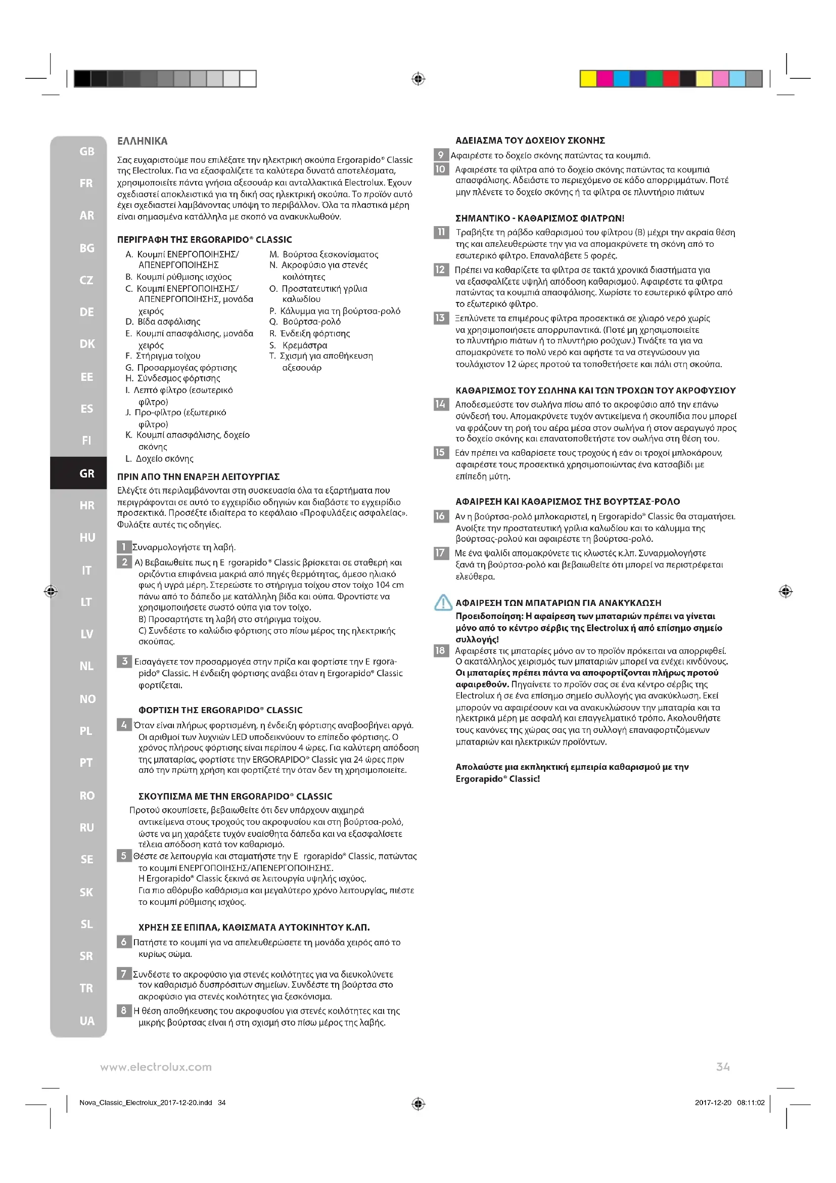 Nova_Classic_Electrolux_2017-12-20.indd 33 2017-12-20 08:11:02ΕΛΛΗΝΙΚΑ Σας ευχαριστούμε που επιλέξατε την ηλεκτρική σκούπα Ergorapido® Classic της Electrolux. Για να εξασφαλίζετε τα καλύτερα δυνατά αποτελέσματα, χρησιμοποιείτε πάντα γνήσια αξεσουάρ και ανταλλακτικά Electrolux. Έχουν σχεδιαστεί αποκλειστικά για τη δική σας ηλεκτρική σκούπα. Το προϊόν αυτό έχει σχεδιαστεί λαμβάνοντας υπόψη το περιβάλλον. Όλα τα πλαστικά μέρη είναι σημασμένα κατάλληλα με σκοπό να ανακυκλωθούν. ΠΕΡΙΓΡΑΦΗ ΤΗΣ ERGORAPIDO® CLASSIC A. Κουμπί ΕΝΕΡΓΟΠΟΙΗΣΗΣ/ ΑΠΕΝΕΡΓΟΠΟΙΗΣΗΣ Β. Κουμπί ρύθμισης ισχύος C. Κουμπί ΕΝΕΡΓΟΠΟΙΗΣΗΣ/ ΑΠΕΝΕΡΓΟΠΟΙΗΣΗΣ, μονάδα