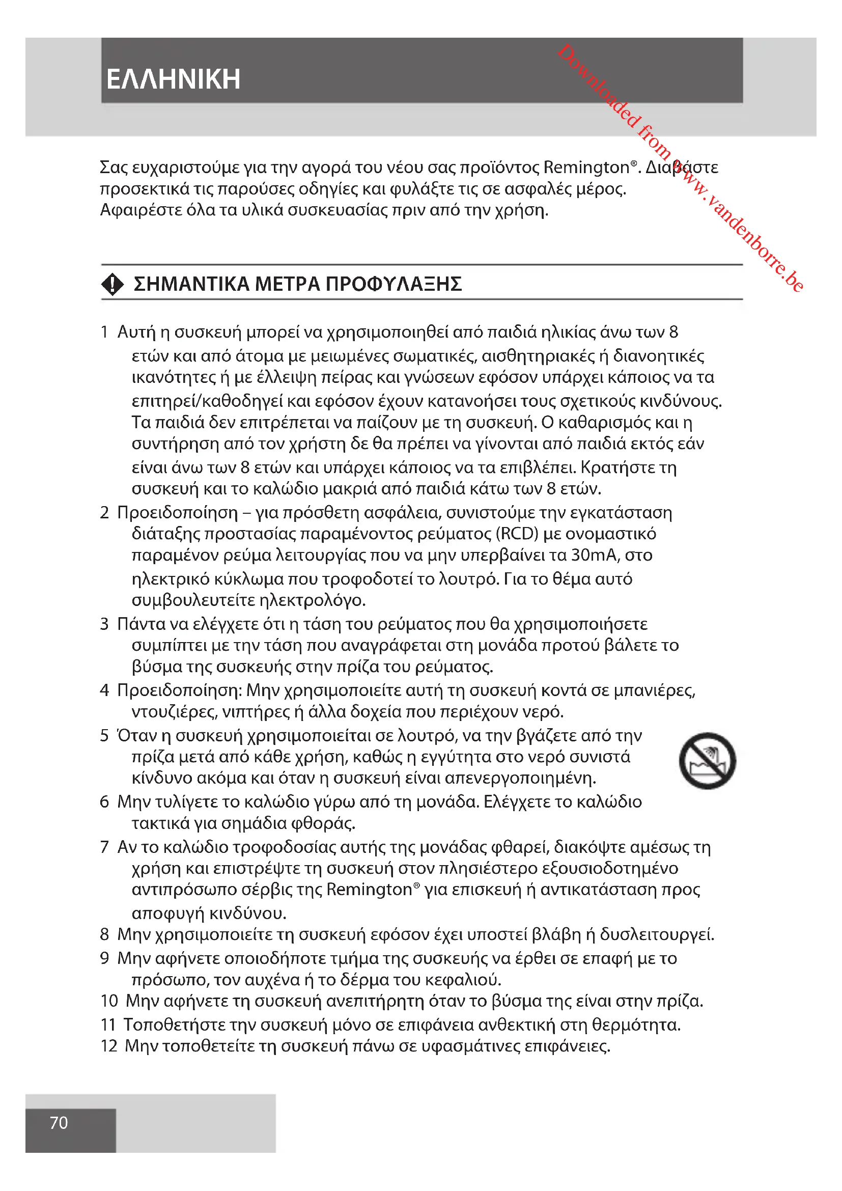 Pentru a evita problemele care afectează mediul sau sănătatea, datorită substanţelor nocive din aparatele electrice sau electronice, aparatele care prezintă acest simbol nu se aruncă la întâmplare, ci vor fi reciclate sau depozitate în locuri special amenajate în acest sens. Downloaded from www.vandenborre.be70 EΛΛHNIKH Σας ευχαριστούμε για την αγορά του νέου σας προϊόντος Remington®. Διαβάστε προσεκτικά τις παρούσες οδηγίες και φυλάξτε τις σε ασφαλές μέρος. Αφαιρέστε όλα τα υλικά συσκευασίας πριν από την χρήση. F ΣΗΜΑΝΤΙΚΑ ΜΕΤΡΑ ΠΡΟΦΥΛΑΞΗΣ 1 Αυτή η συσκευή μπορεί να χρησιμοποιηθεί από παιδιά ηλικίας άνω των 8 ετών και από άτομα με μειωμένες σωματικές, αισθητηριακές ή διανοητικές ικανότητες ή με έλλειψη πείρας και γνώσεων εφόσον υπάρχει κάποιος να τα επιτηρεί/καθοδηγεί και εφόσον έχουν κατανοήσει τους σχετικούς κινδύνους. Τα παιδιά δεν επιτρέπεται να παίζουν με τη συσκευή. Ο καθαρισμός και η συντήρηση από τον χρήστη δε θα πρέπει να γίνονται από παιδιά εκτός εάν είναι άνω των 8 ετών και υπάρχει κάποιος να τα επιβλέπει. Κρατήστε τη συσκευή και το καλώδιο μακριά από παιδιά κάτω των 8 ετών. 2 Προειδοποίηση – για πρόσθετη ασφάλεια, συνιστούμε την εγκατάσταση διάταξης προστασίας παραμένοντος ρεύματος (RCD) με ονομαστικό παραμένον ρεύμα λειτουργίας που να μην υπερβαίνει τα 30mA, στο ηλεκτρικό κύκλωμα που τροφοδοτεί το λουτρό. Για το θέμα αυτό συμβουλευτείτε ηλεκτρολόγο. 3 Πάντα να ελέγχετε ότι η τάση του ρεύματος που θα χρησιμοποιήσετε συμπίπτει με την τάση που αναγράφεται στη μονάδα προτού βάλετε το βύσμα της συσκευής στην πρίζα του ρεύματος. 4 Προειδοποίηση: Μην χρησιμοποιείτε αυτή τη συσκευή κοντά σε μπανιέρες, ντουζιέρες, νιπτήρες ή άλλα δοχεία που περιέχουν νερό. 5 Όταν η συσκευή χρησιμοποιείται σε λουτρό, να την βγάζετε από την πρίζα μετά από κάθε χρήση, καθώς η εγγύτητα στο νερό συνιστά κίνδυνο ακόμα και όταν η συσκευή είναι απενεργοποιημένη. 6 Μην τυλίγετε το καλώδιο γύρω από τη μονάδα. Ελέγχετε το καλώδιο τακτικά για σημάδια φθοράς. 7 Αν το καλώδιο τροφοδοσίας αυτής της μονάδας φθαρεί, διακόψτε αμέσως τη χρήση και επιστρέψτε τη συσκευή στον πλησιέστερο εξουσιοδοτημένο αντιπρόσωπο σέρβις της Remington® για επισκευή ή αντικατάσταση προς αποφυγή κινδύνου. 8 Μην χρησιμοποιείτε τη συσκευή εφόσον έχει υποστεί βλάβη ή δυσλειτουργεί. 9 Μην αφήνετε οποιοδήποτε τμήμα της συσκευής να έρθει σε επαφή με το πρόσωπο, τον αυχένα ή το δέρμα του κεφαλιού. 10 Μην αφήνετε τη συσκευή ανεπιτήρητη όταν το βύσμα της είναι στην πρίζα. 11 Τοποθετήστε την συσκευή μόνο σε επιφάνεια ανθεκτική στη θερμότητα. 12 Μην τοποθετείτε τη συσκευή πάνω σε υφασμάτινες επιφάνειες. Downloaded from www.vandenborre.be71 EΛΛHNIKH GBDNLFEIDKSFINPSKCZ HUN PLRUTRROGRSIBG HRUAAE 13 Μη χρησιμοποιείτε άλλα εξαρτήματα εκτός από αυτά που σας προμηθεύουμε