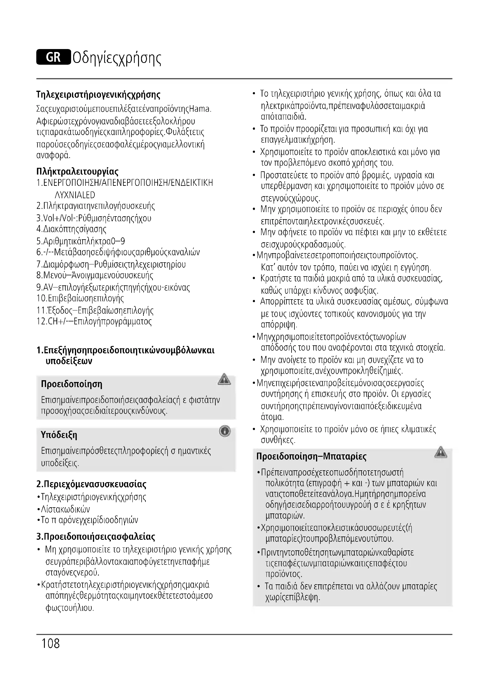 Υπόδειξη σχετικά με την προστασία περιβάλλοντος: Από τη στιγμή που ηΕυρωπαϊκή Οδηγία 2012/19/EU και 2006/66/EE ενσωματώνεται στο εθνικό δίκαιο ισχύουν τα εξής: Οι ηλεκτρικές και ηλεκτρονικές συσκευές καθώς και οι μπαταρίες δεν επιτρέπεται να απορρίπτονται στα οικιακά απορρίμματα. Οι καταναλωτές υποχρεούνται από τον νόμο να επιστρέφουν τις ηλεκτρικές και ηλεκτρονικές συσκευές καθώς και τις μπαταρίες που έχουν φτάσει στο τέλος του κύκλου της ζωής τους στα δημόσια σημεία περισυλλογής που έχουν δημιουργηθεί γι’ αυτόν τον σκοπό ήστα σημεία πώλησης. Οι λεπτομέρειες ρυθμίζονται στην εκάστοτε κρατική νομοθεσία. Το σύμβολο πάνω στο προϊόν, στο εγχειρίδιο χρήσης ή στη συσκευασία παραπέμπει σε αυτές τις διατάξεις. Με την ανακύκλωση, την επαναχρησιμοποίηση των υλικών ήμεάλλες μορφές αξιοποίησης παλιών συσκευών/ μπαταριών συνεισφέρετε σημαντικά στην προστασία του περιβάλλοντος.115 T Kullanma kılavuzu Üniversal uzaktan kumanda Bir Hama ürünü satınalmaya karar verdiğiniz için teşekkür ederiz. Biraz zaman ayırıpaşağıdaki talimatları ve bilgileri tamamen okuyun. Lütfen bu kılavuzu daha sonra başvurabilmek için güvenli bir yerde saklayın. Fonksiyon tuşları