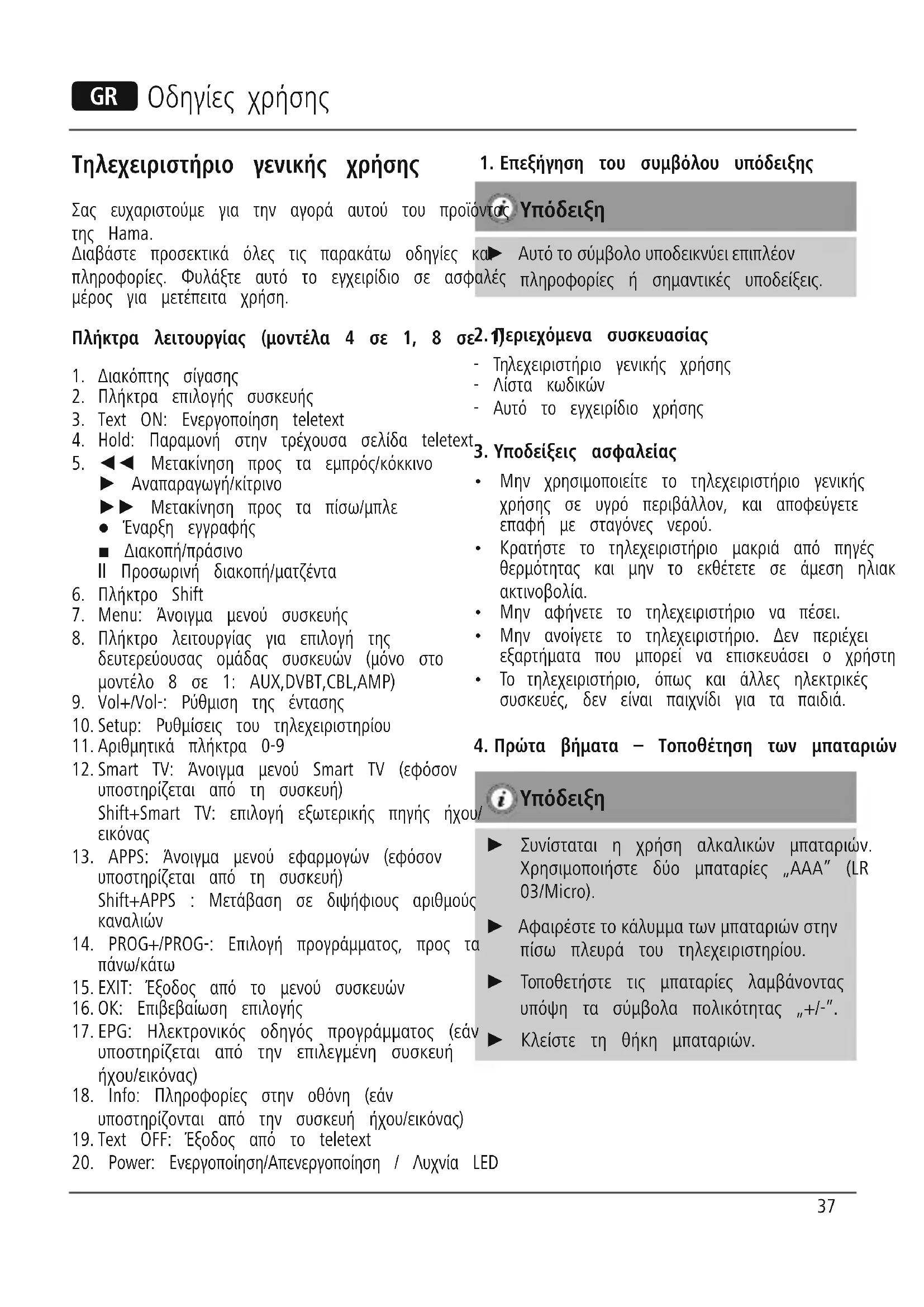Υπόδειξη σχετικά με την προστασία περιβάλλοντος: Από τη στιγμή που η Ευρωπαϊκή Οδηγία 2012/19/EU και 2006/66/EE ενσωματώνεται στο εθνικό δίκαιο ισχύουν τα εξής: Οι ηλεκτρικές και οι ηλεκτρονικές συσκευές καθώς και οι μπαταρίες δεν επιτρέπεται να πετιούνται στα οικιακά απορρίμματα. Οι καταναλωτές υποχρεούνται από τον νόμο να επιστρέφουν τις ηλεκτρικές και ηλεκτρονικές συσκευές καθώς και τις μπαταρίες στο τέλος της ζωής τους στα δημόσια σημεία περισυλλογής που έχουν δημιουργηθεί γι’ αυτό το σκοπό ή στα σημεία πώλησης. Οι λεπτομέρειες ρυθμίζονται στη σχετική νομοθεσία. Το σύμβολο πάνω στο προϊόν, στο εγχειρίδιο χρήσης ή στη συσκευασία παραπέμπει σε αυτές τις διατάξεις. Με την ανακύκλωση, επαναχρησιμοποίηση των υλικών ή με άλλες μορφές χρησιμοποίησης παλιών συσκευών / Μπαταριών συνεισφέρετε σημαντικά στην προστασία του περιβάλλοντος. Στη Γερμανία ισχύουν αντίστοιχα οι παραπάνω κανόνες απόρριψης σύμφωνα με τον κανονισμό για μπαταρίες και συσσωρευτές. 41Uniwersalny pilota zdalnego sterowania Dziękujemy, że zdecydowali się Państwo na zakup produktu firmy Hama. Prosimy poświęcić trochę czasu na uważne przeczytanie poniższych instrukcji i informacji. Instrukcję należy przechowywać w bezpiecznym miejscu do późniejszego użytku. Przyciski funkcyjne (modele 4 in 1, 8 in 1)